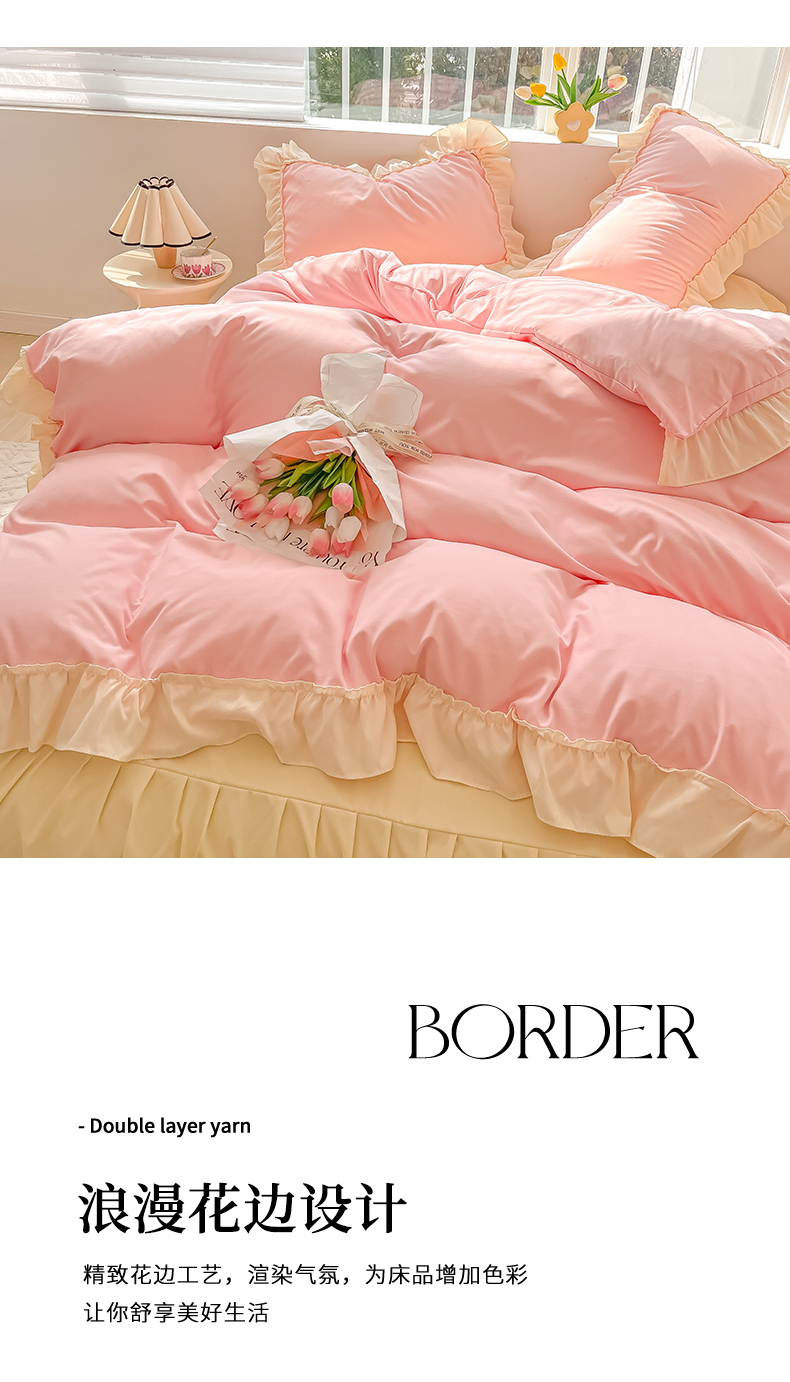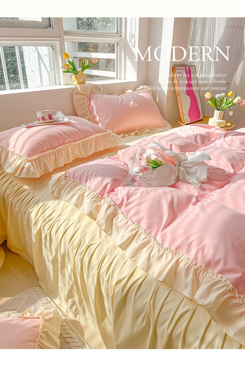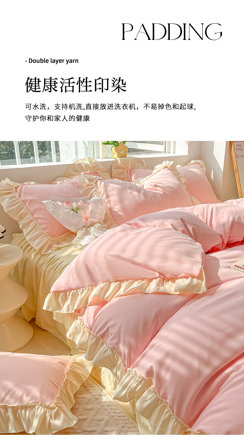 商品名称:韩都家居 2023新款公主风花边双拼四件套 粉玉奶黄
