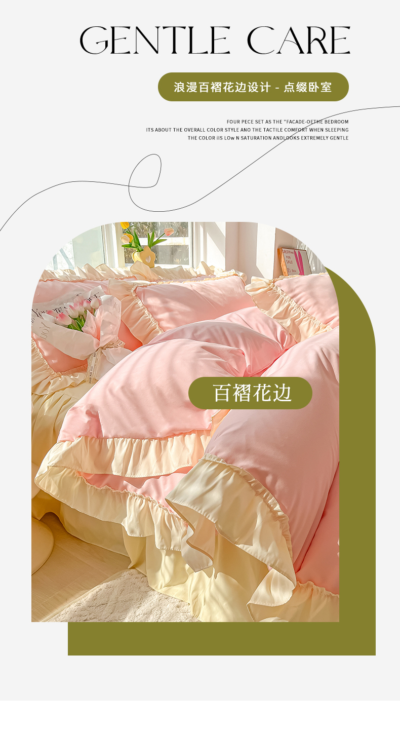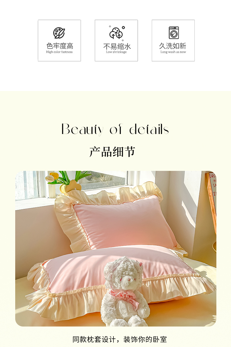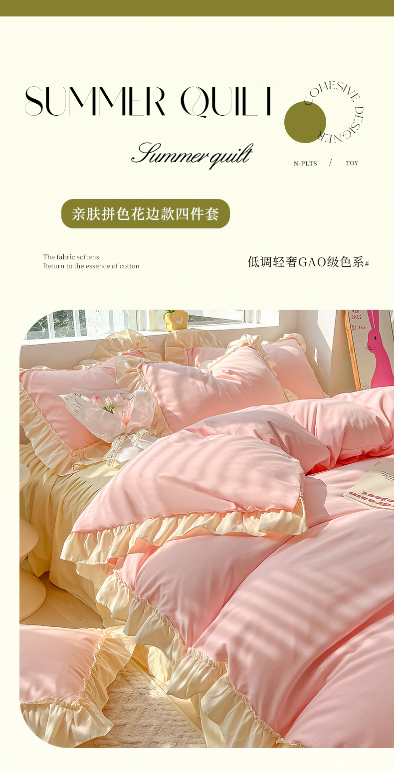 商品名称:韩都家居 2023新款公主风花边双拼四件套 粉玉奶黄