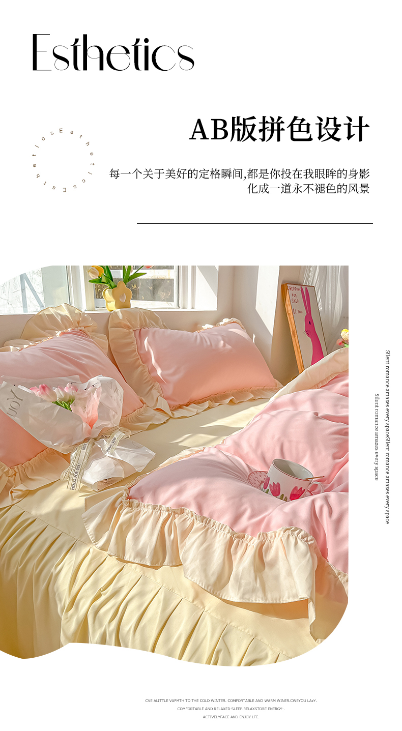 (总)韩都家居 2023新款公主风花边双拼四件套,粉玉奶黄,粉玉浅紫,奶油黄,奶油青绿,青绿奶黄,天蓝浅粉