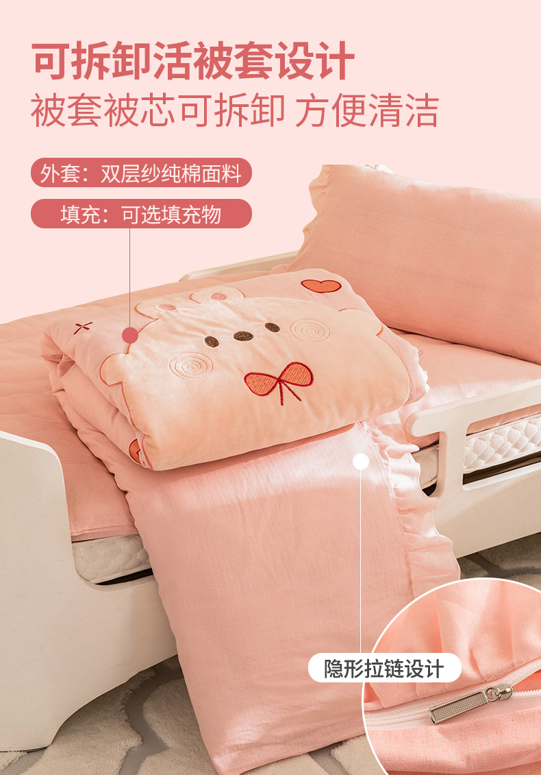 (总)喜多兔儿童家纺 2025春夏新款小软萌贴布绣纱布被,粉色软萌小兔,卡其色软萌小熊,蓝色软萌小象,绿色软萌恐龙,组合图仅供展示