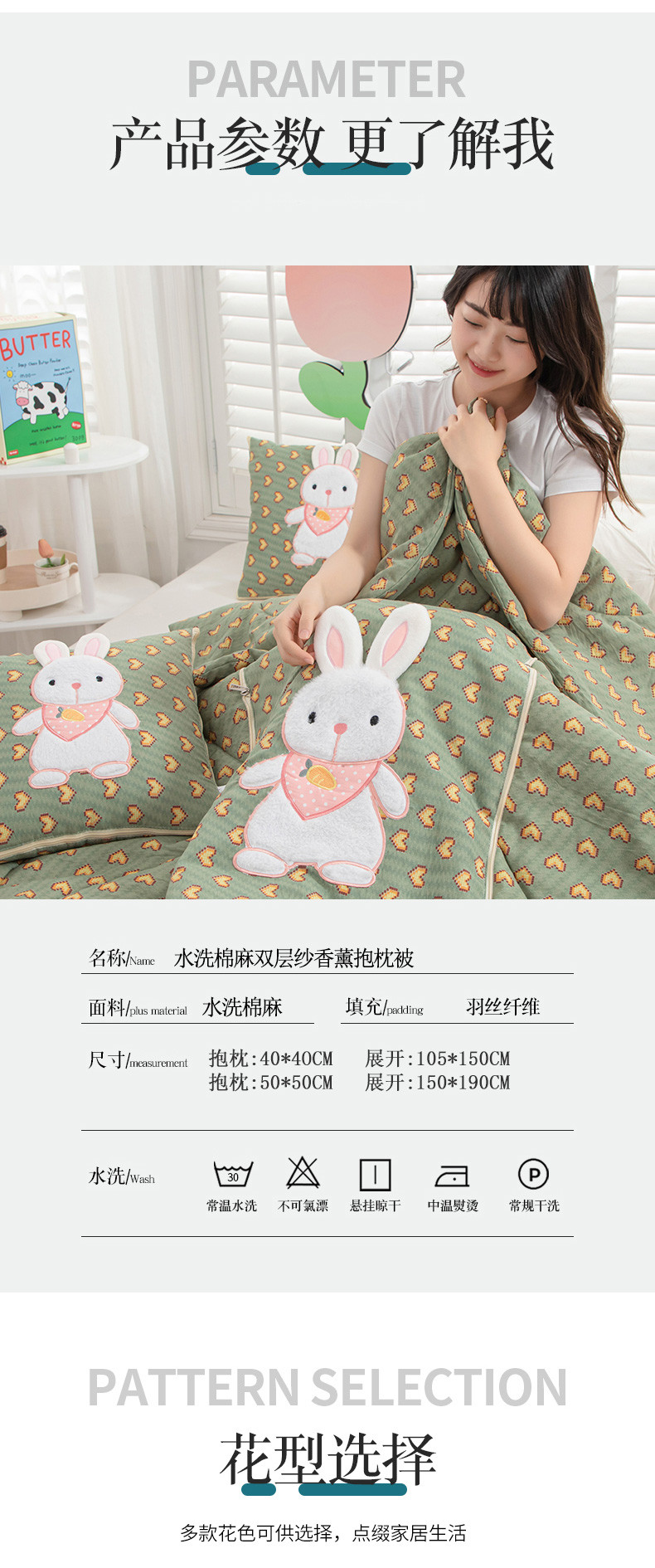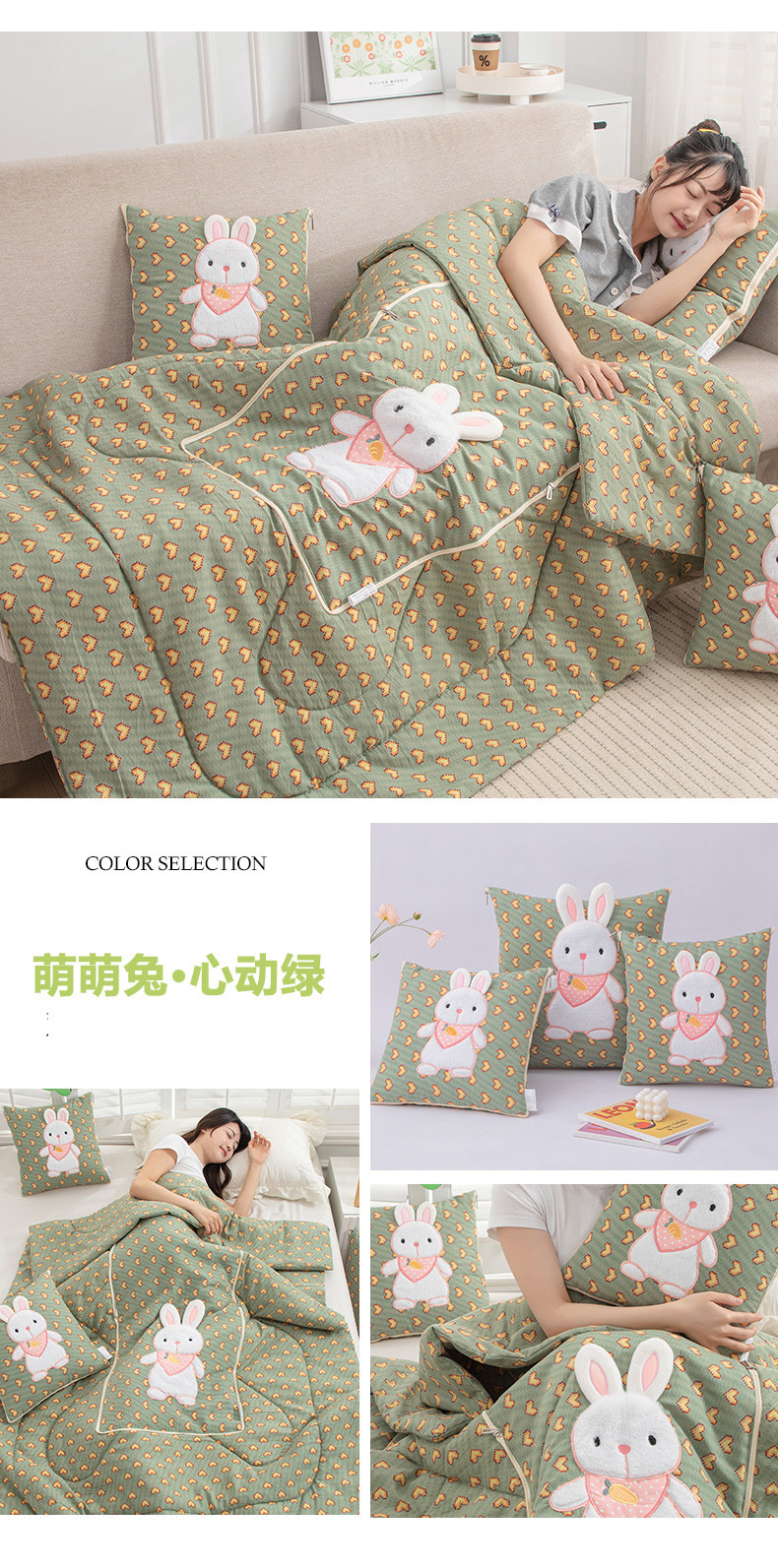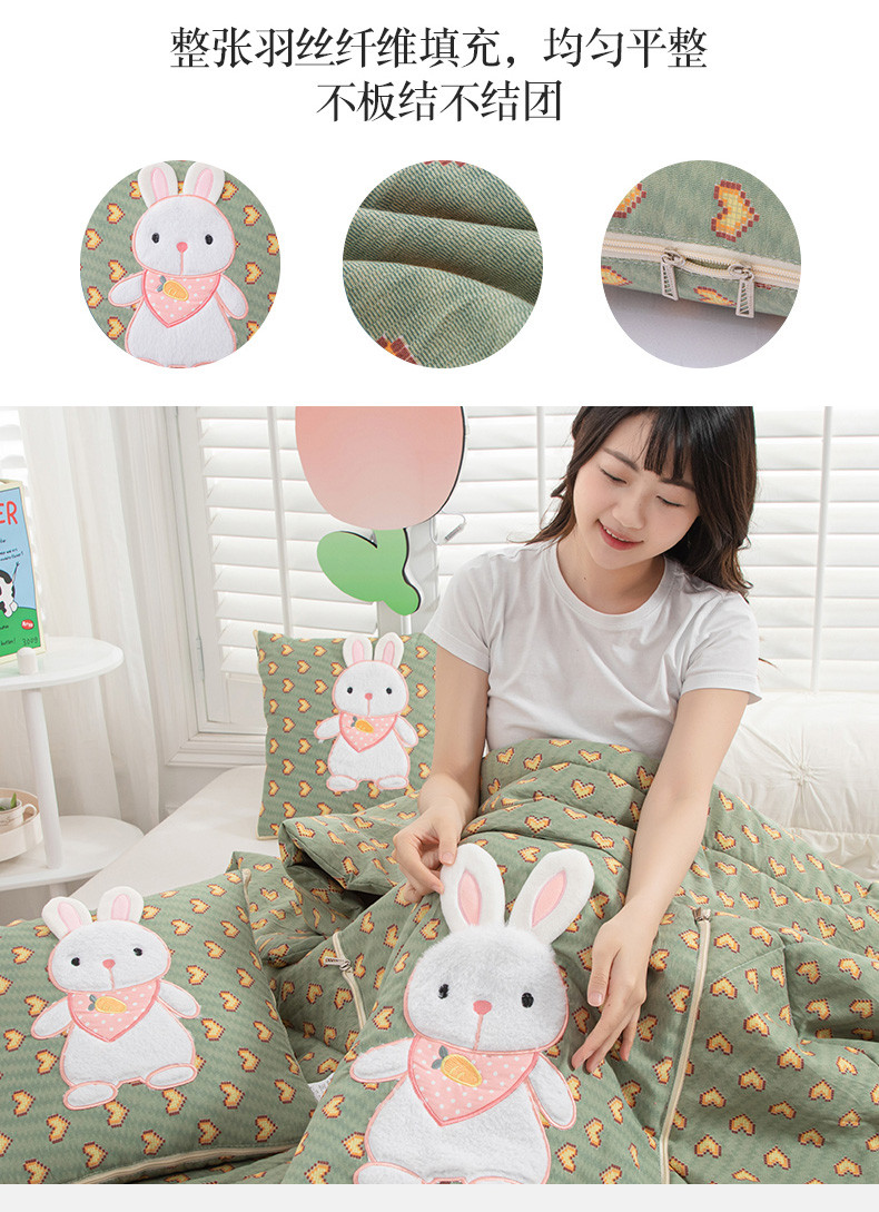 商品名称:翰轩家居 2023新款水洗棉麻植物精油香薰萌萌兔抱枕被 萌萌兔-心动绿