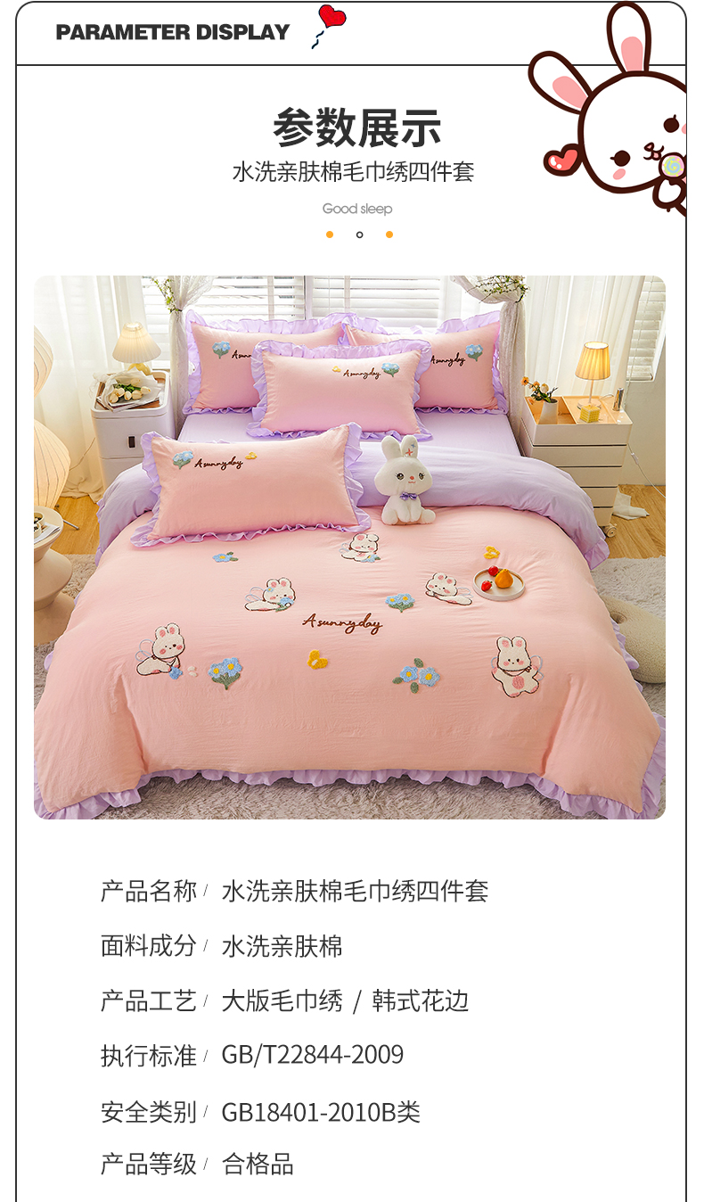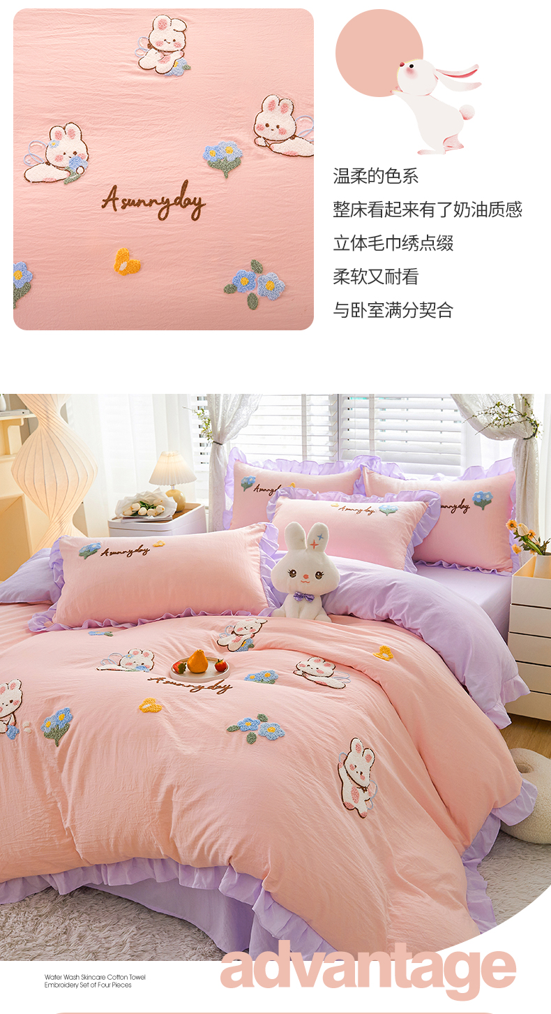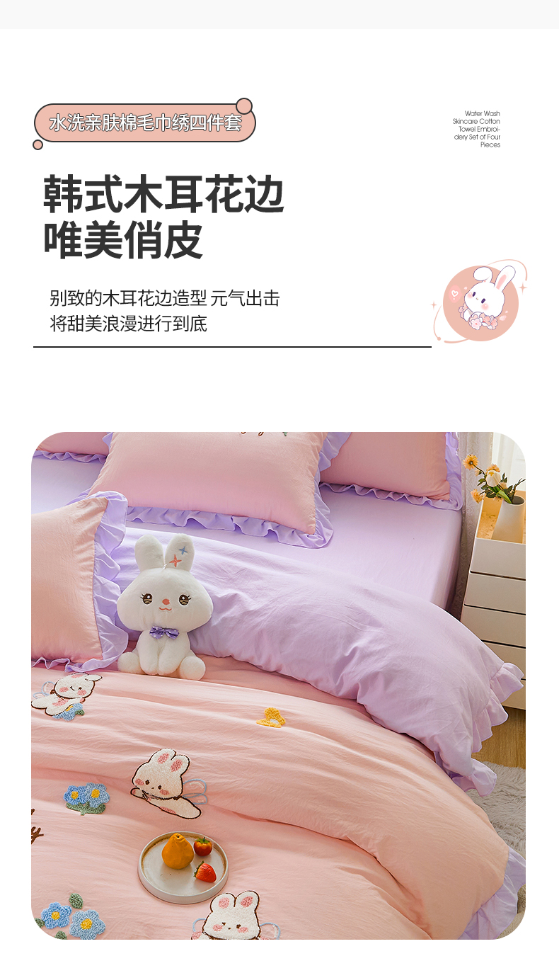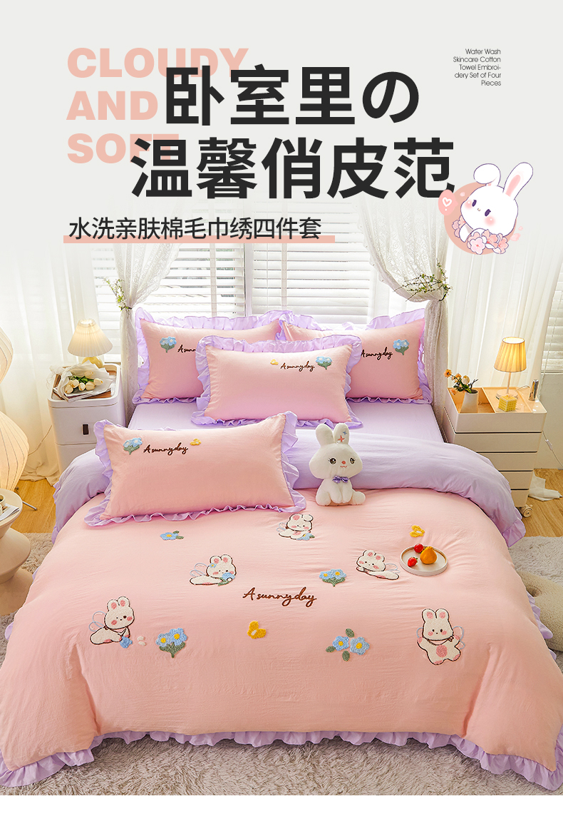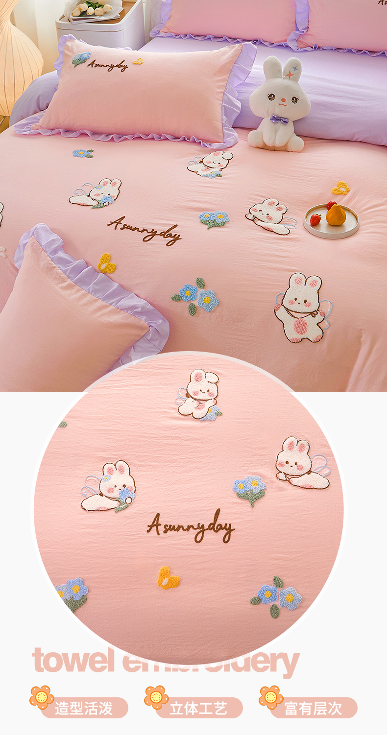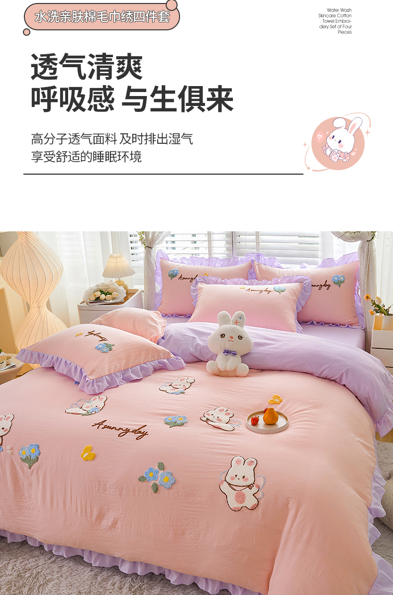 当前位置: 91家纺网 > 商品网购 > 床品套件 > 四件套 > 毛巾绣四件套 > 易禾家纺 2024新款水洗亲肤棉毛巾绣四件套专版花型-幸福兔 幸福兔-粉紫