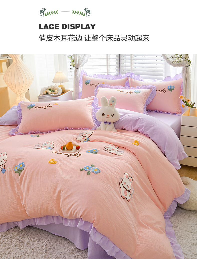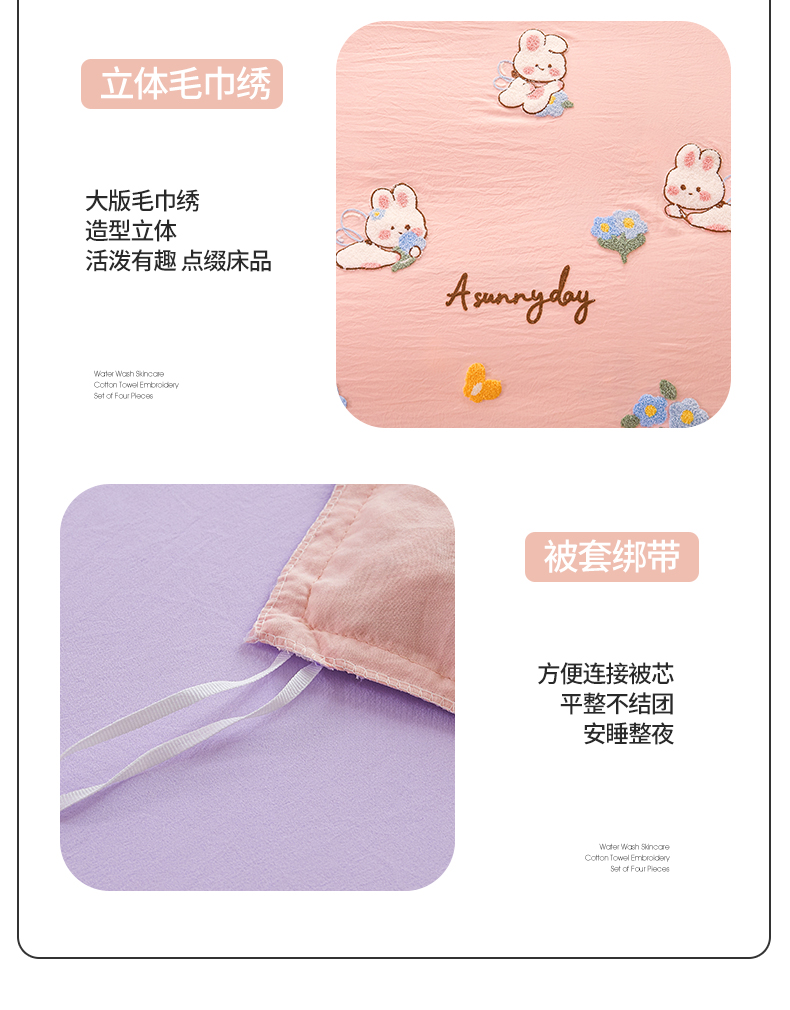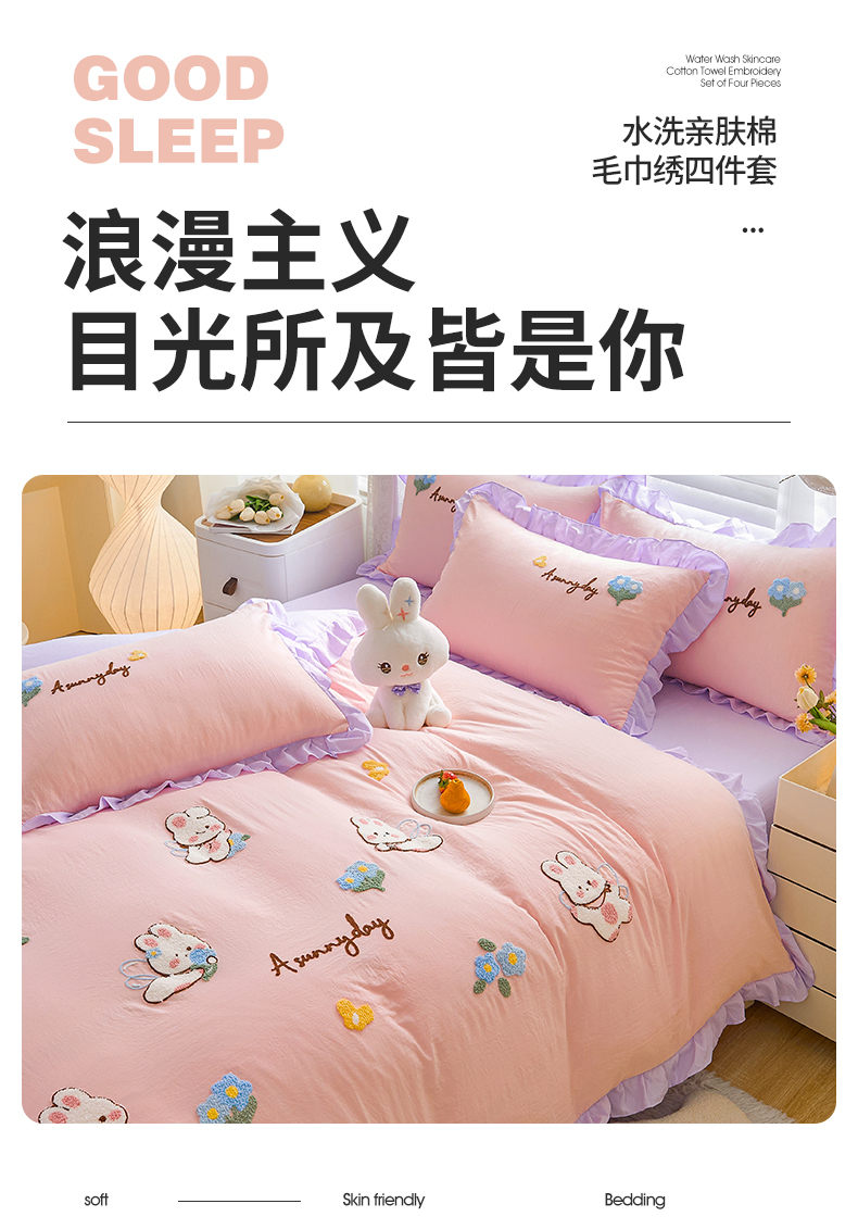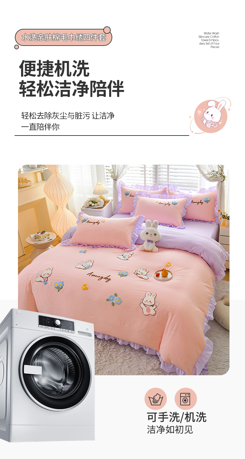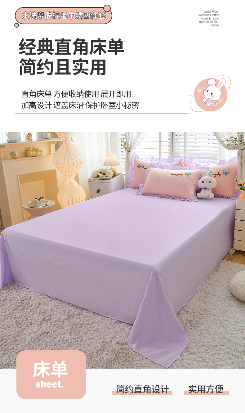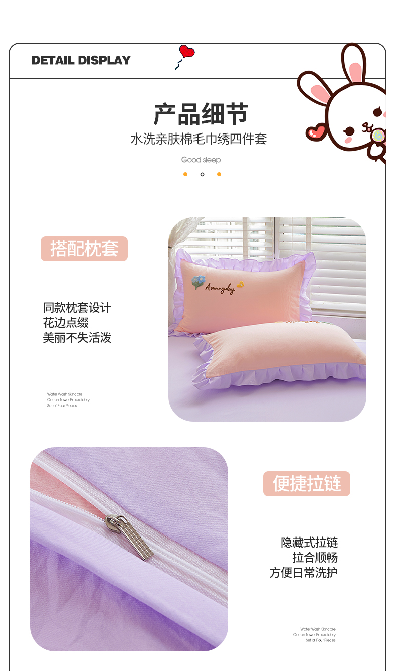 当前位置: 91家纺网 > 商品网购 > 床品套件 > 四件套 > 毛巾绣四件套 > 易禾家纺 2024新款水洗亲肤棉毛巾绣四件套专版花型-幸福兔 幸福兔-粉紫