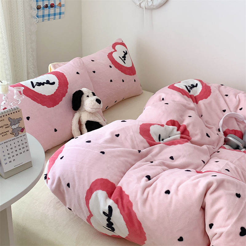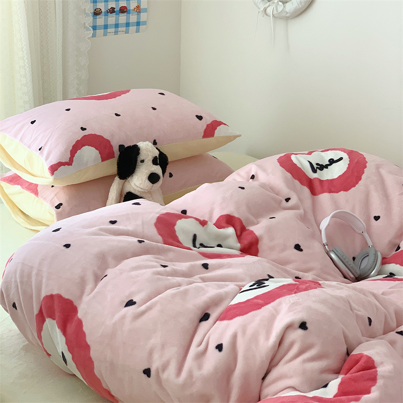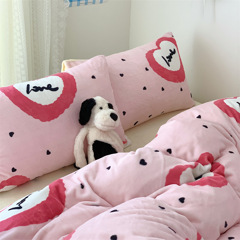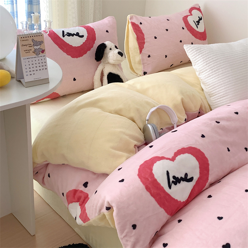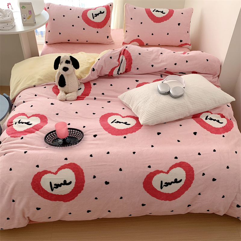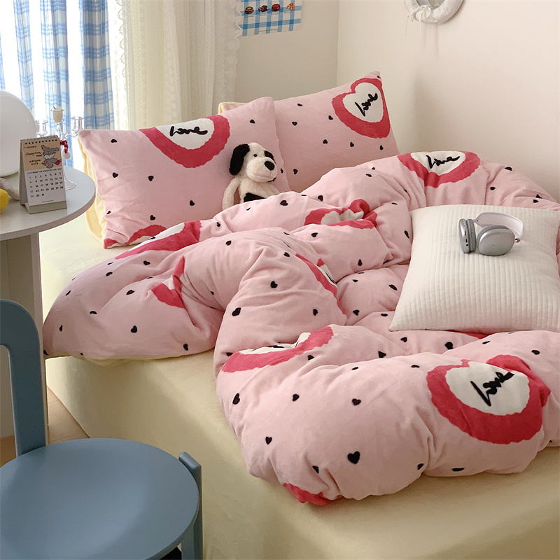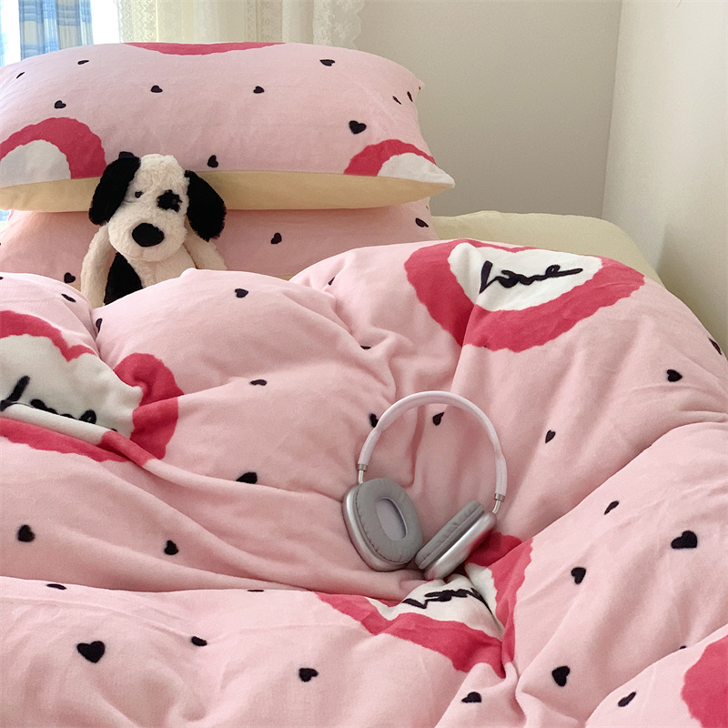 美乐迪家纺 2023秋冬新款保暖牛奶绒四件套 粉爱心