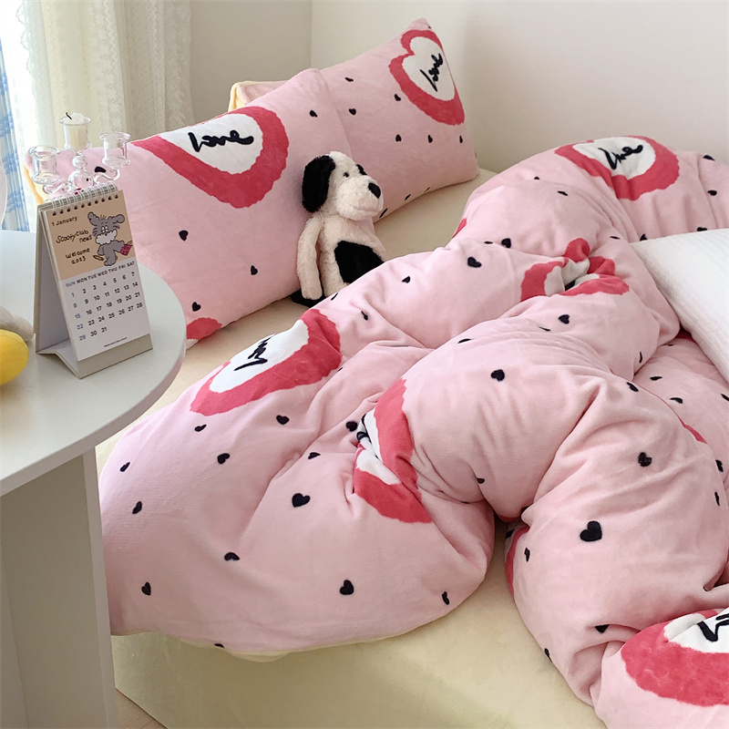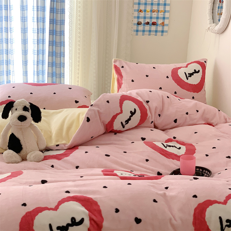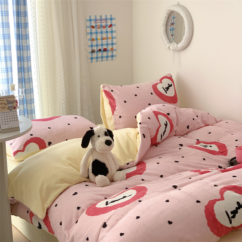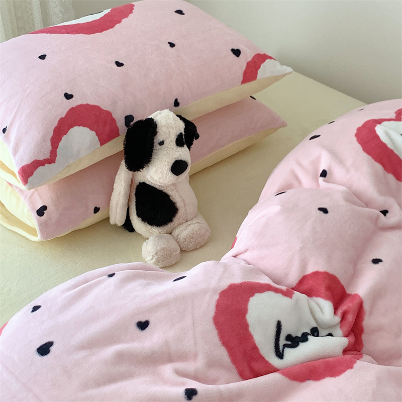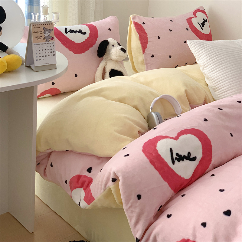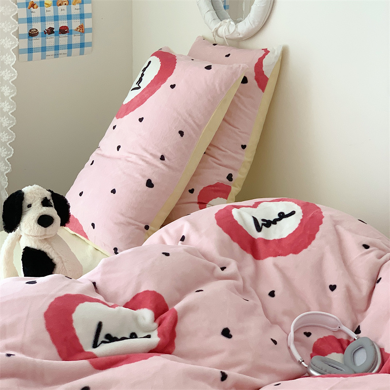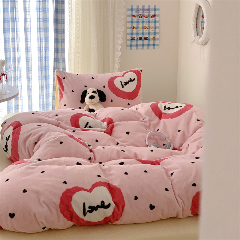 美乐迪家纺 2023秋冬新款保暖牛奶绒四件套 粉爱心