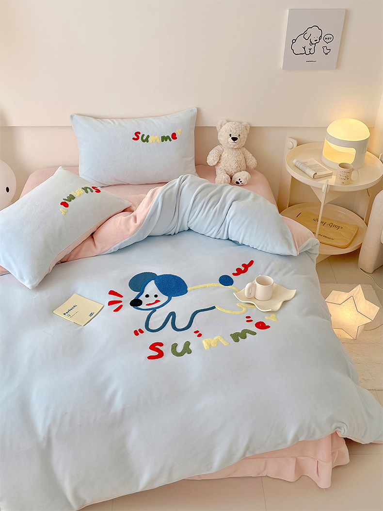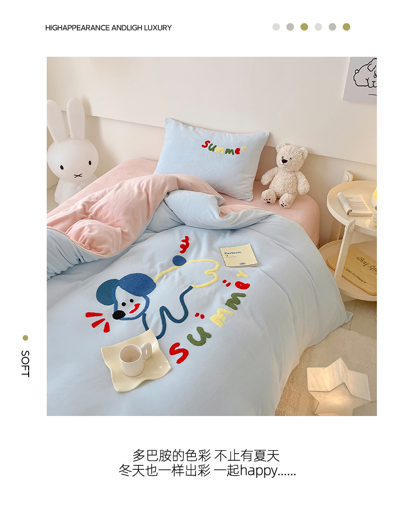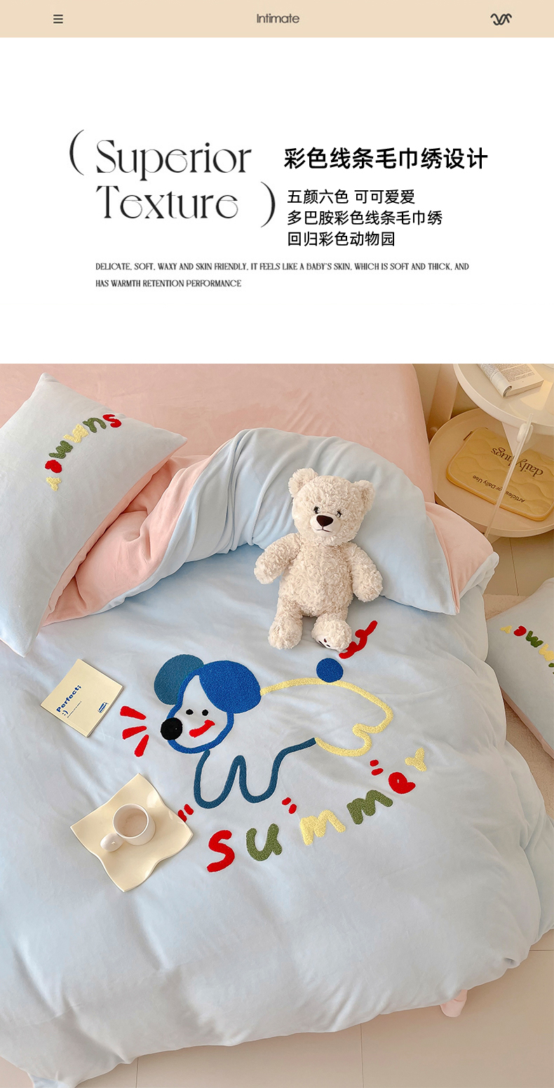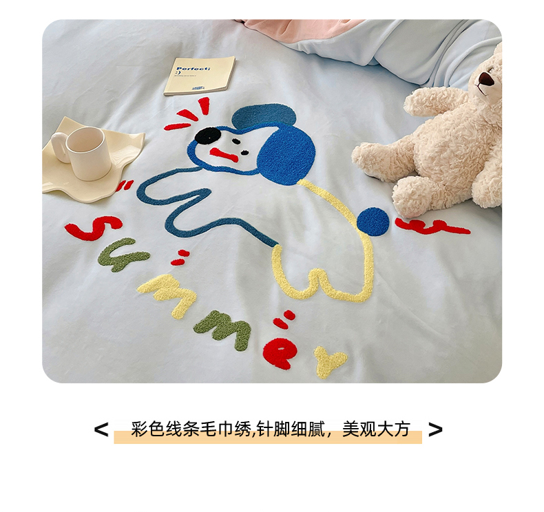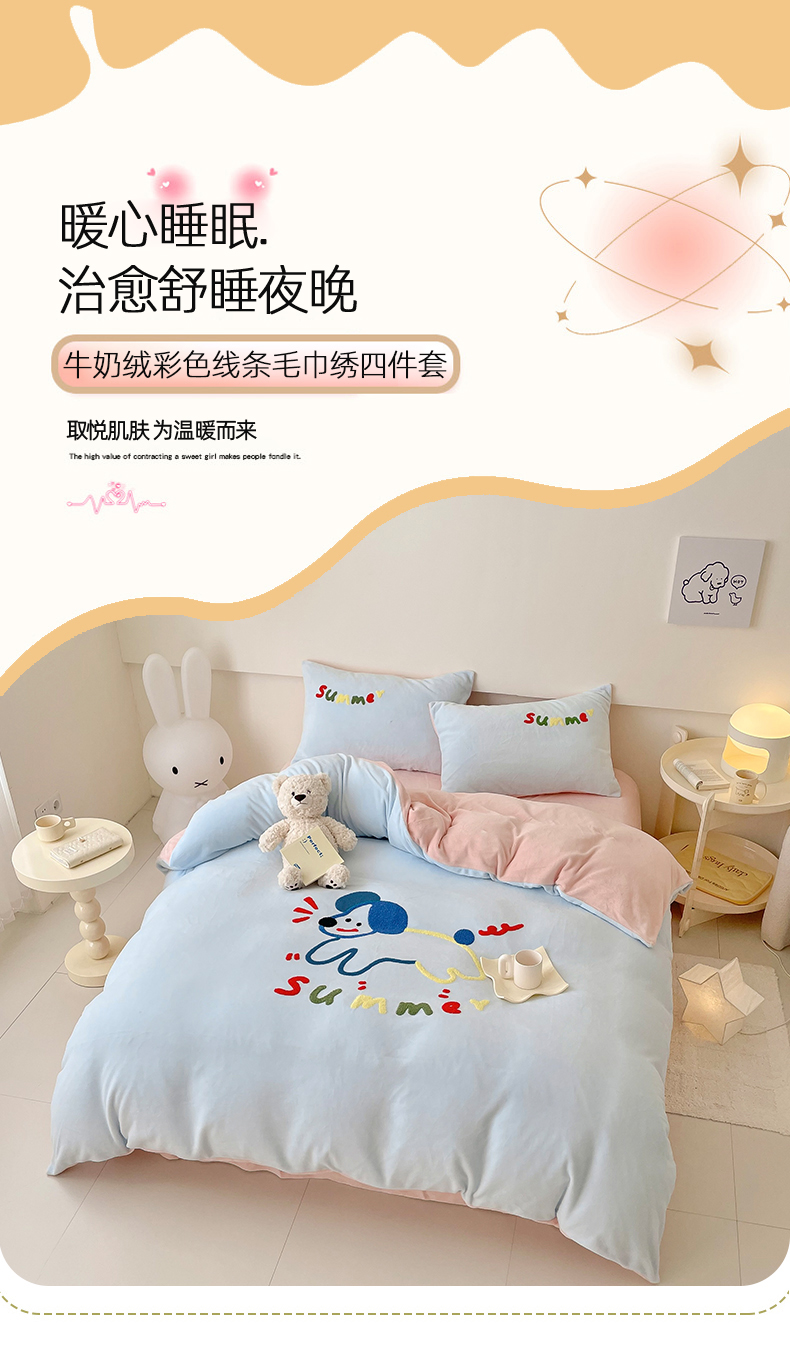 商品名称:玛奇朵 2023新款秋冬牛奶绒多巴胺彩色线条毛巾绣四件套 飞跃小狗-蓝