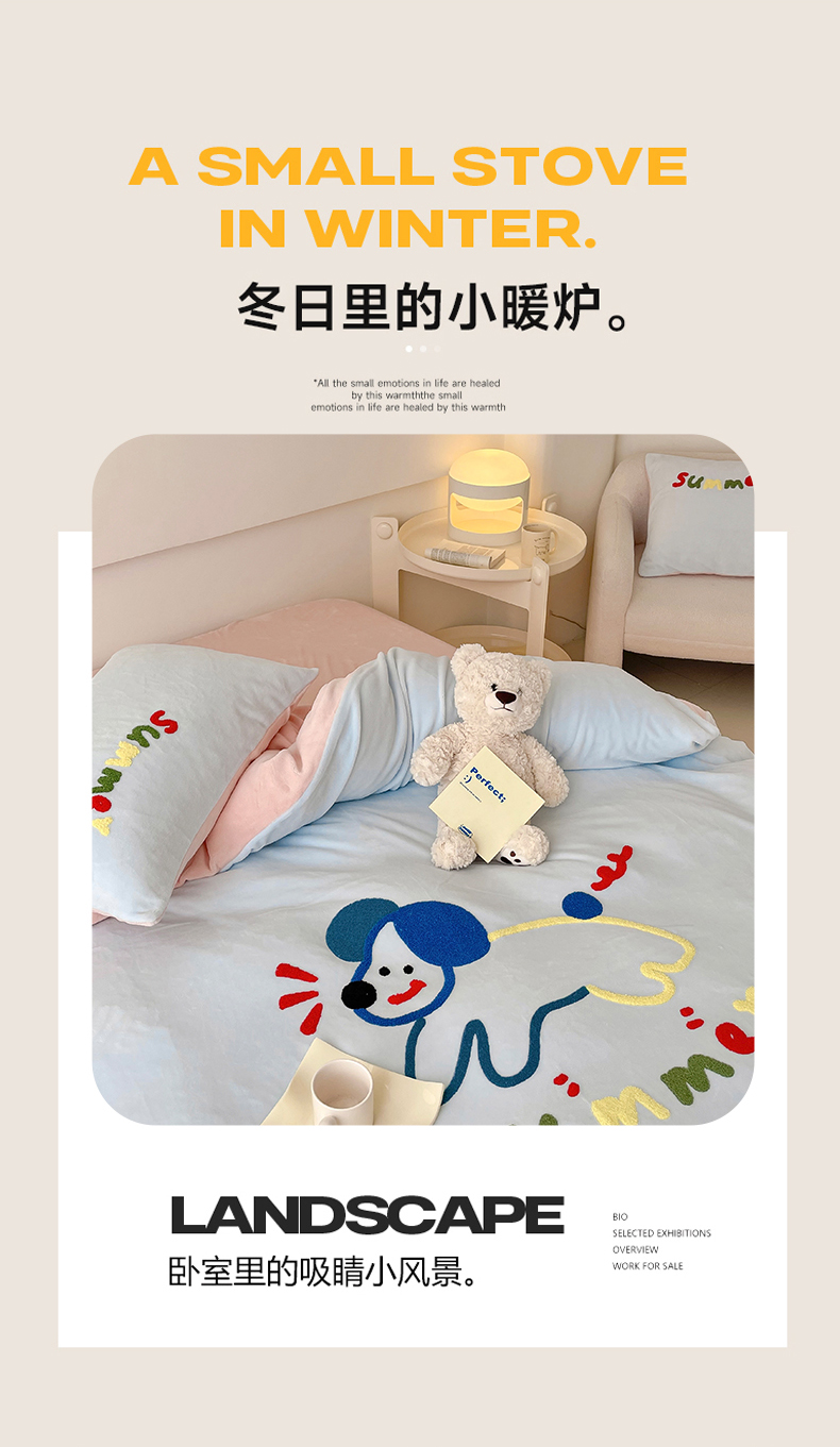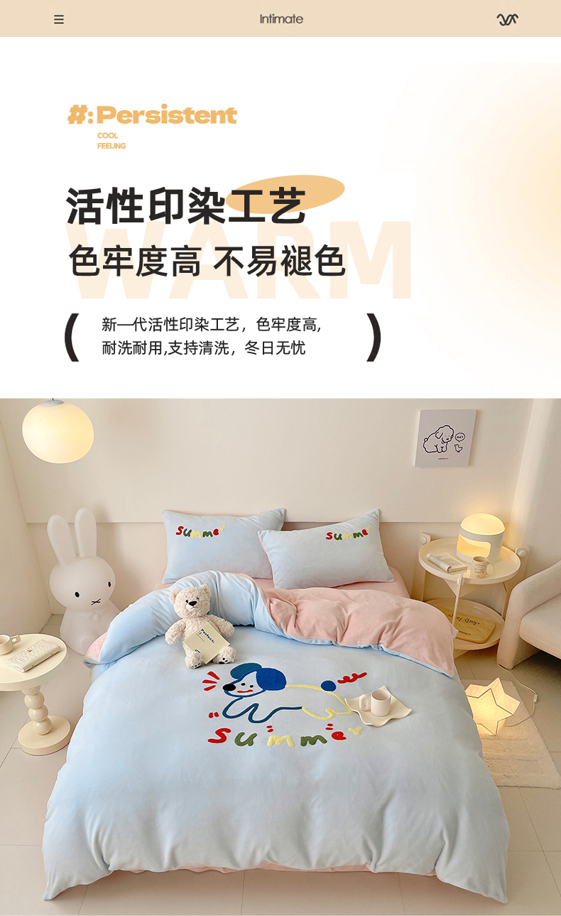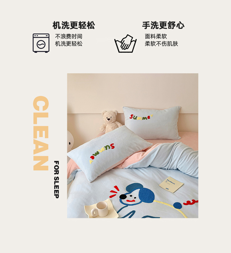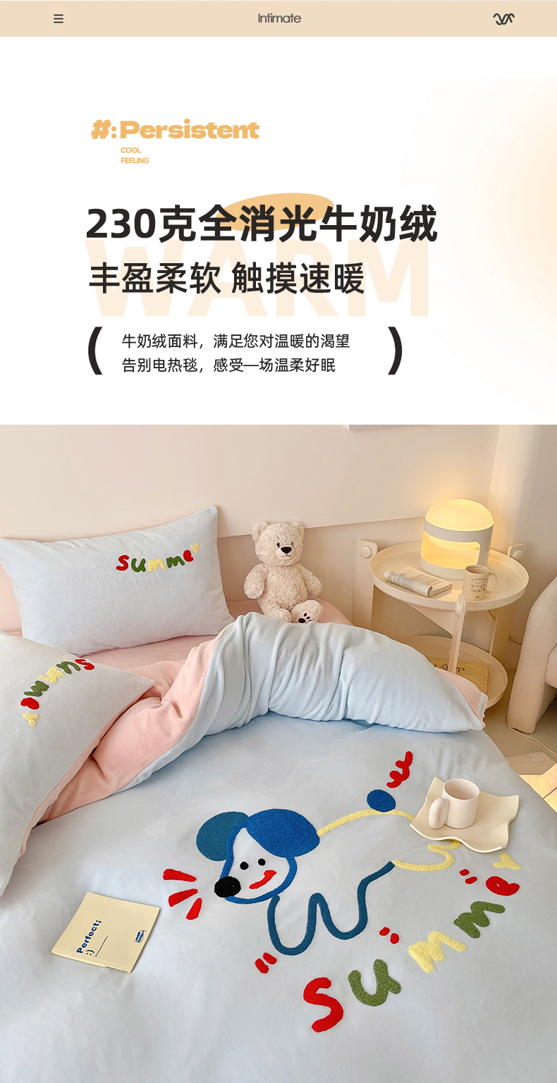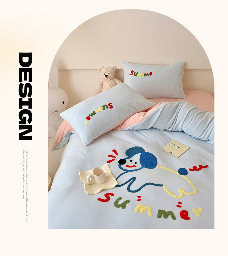 商品名称:玛奇朵 2023新款秋冬牛奶绒多巴胺彩色线条毛巾绣四件套 飞跃小狗-蓝