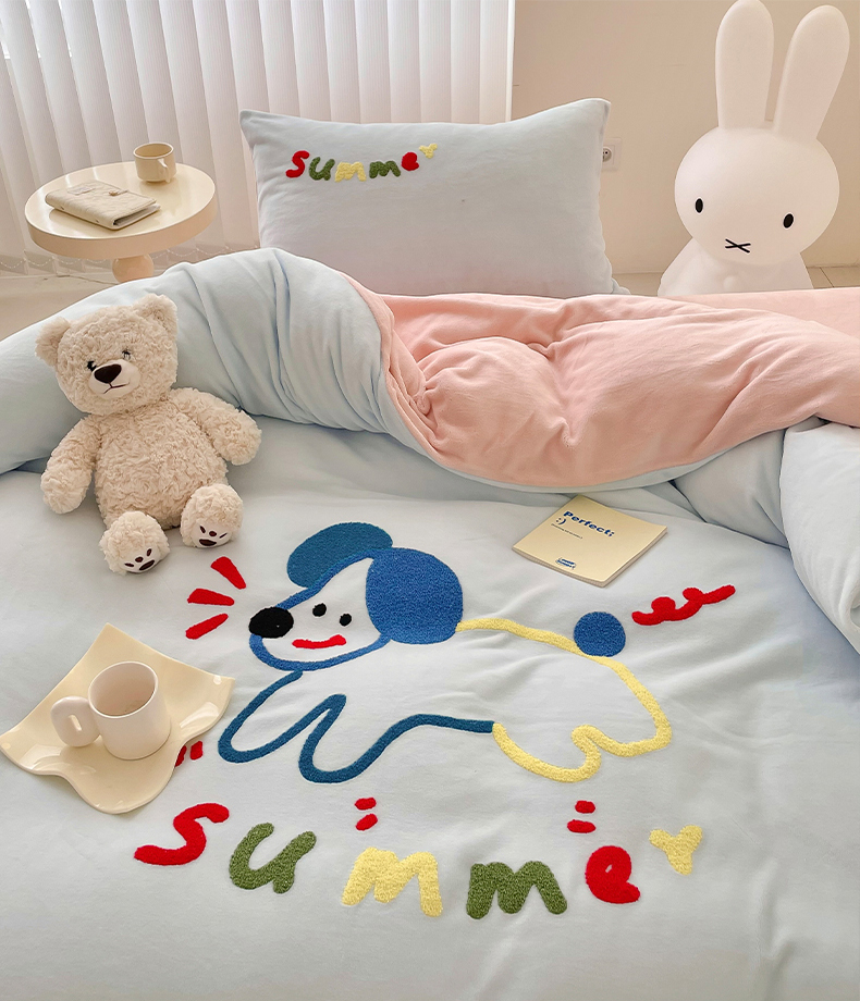 玛奇朵 2023新款秋冬牛奶绒多巴胺彩色线条毛巾绣四件套 飞跃小狗-蓝