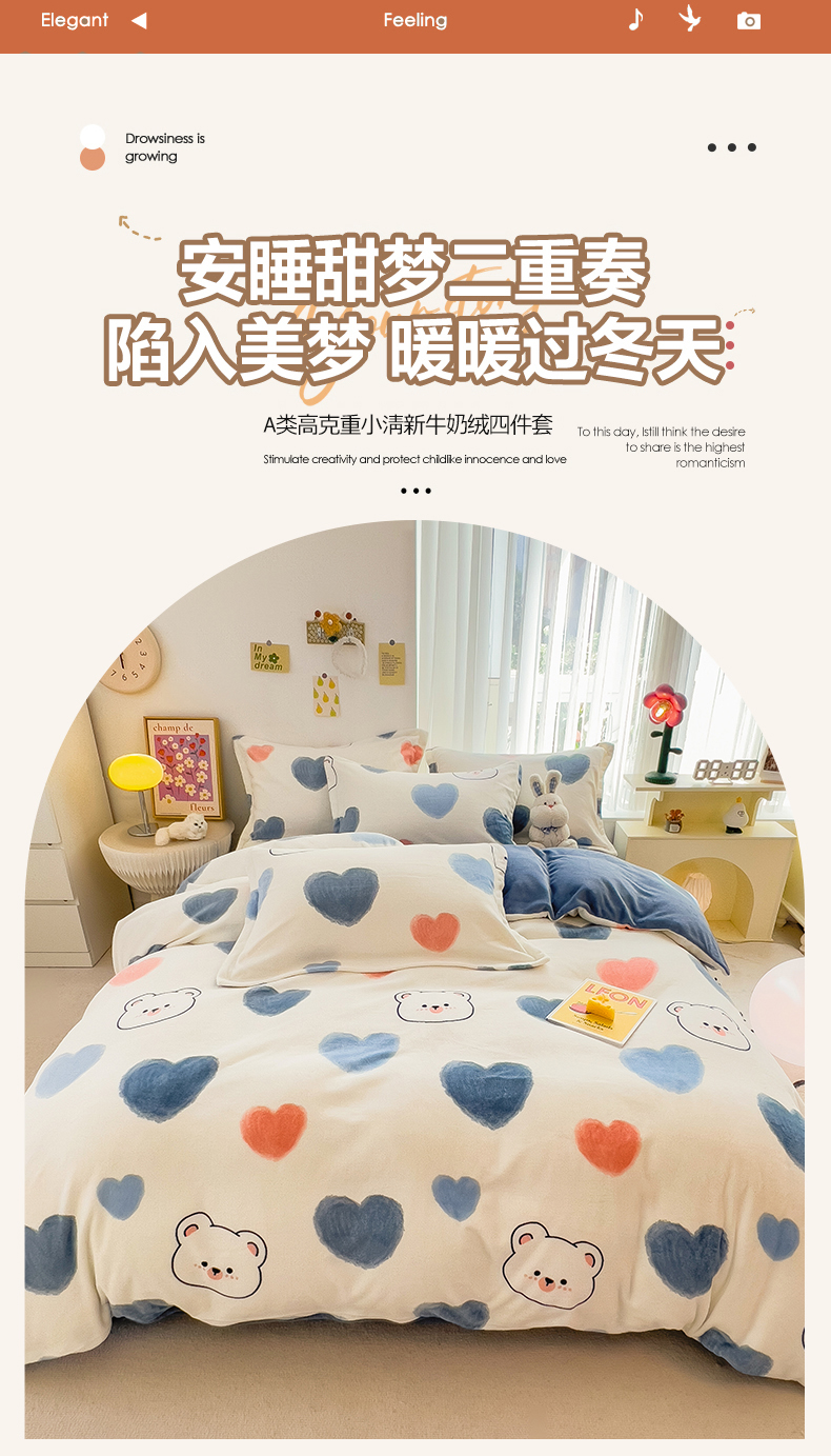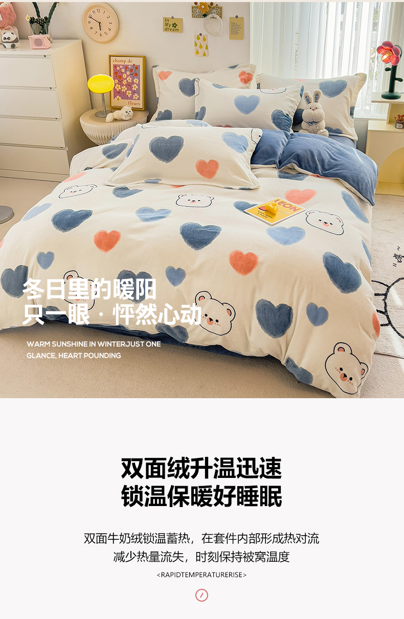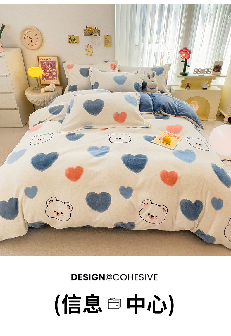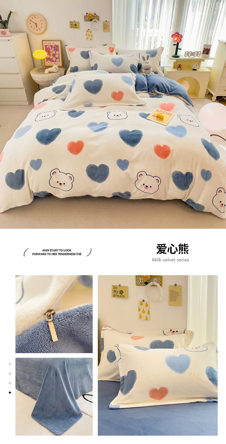 商品名称:全季家居2023新款小清新A类高克重加厚印花牛奶绒四件套 爱心熊