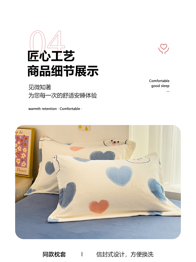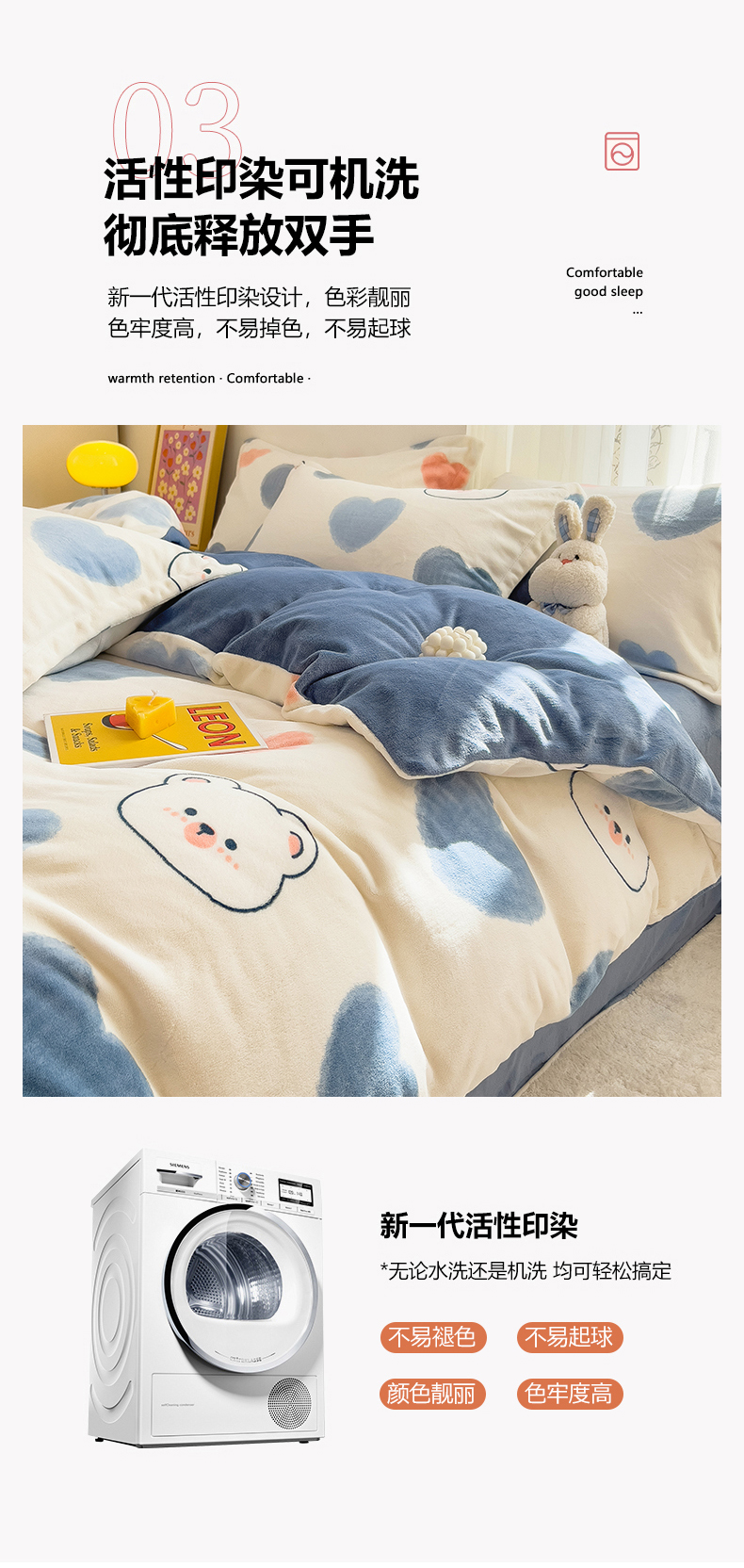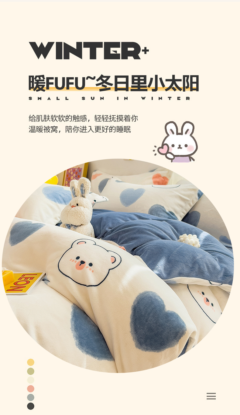 商品名称:全季家居2023新款小清新A类高克重加厚印花牛奶绒四件套 爱心熊