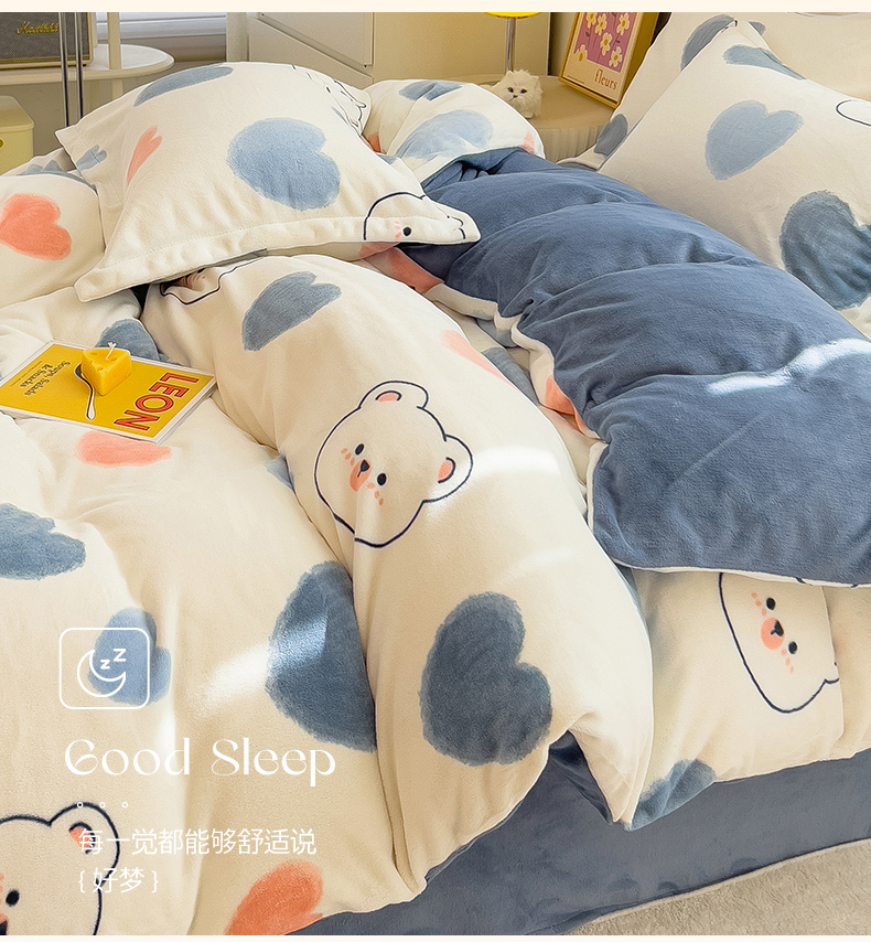 全季家居2023新款小清新A类高克重加厚印花牛奶绒四件套 爱心熊