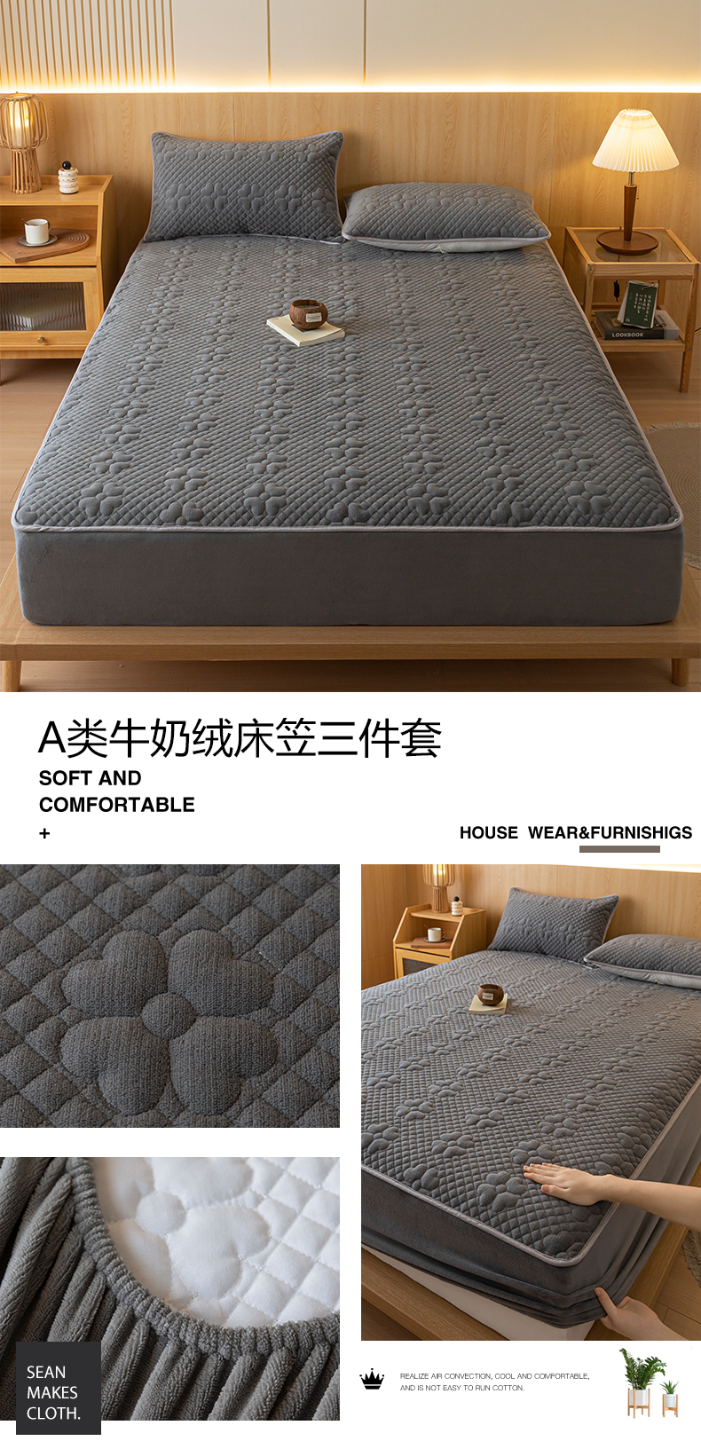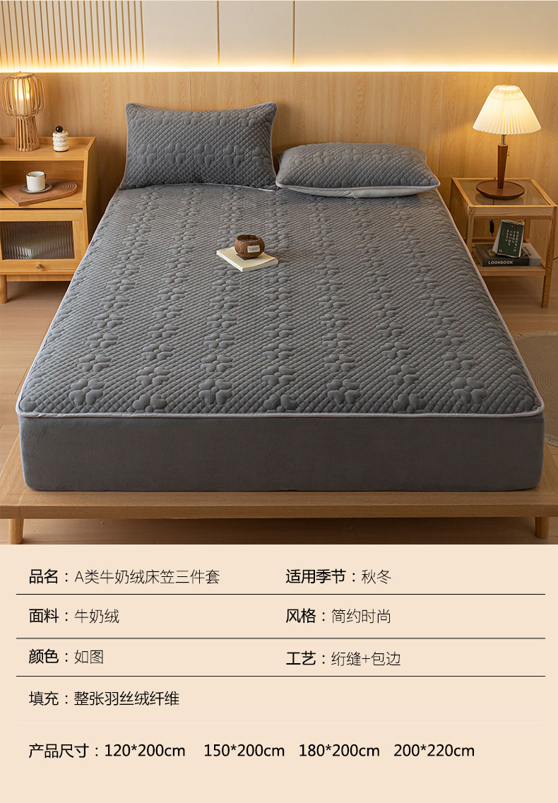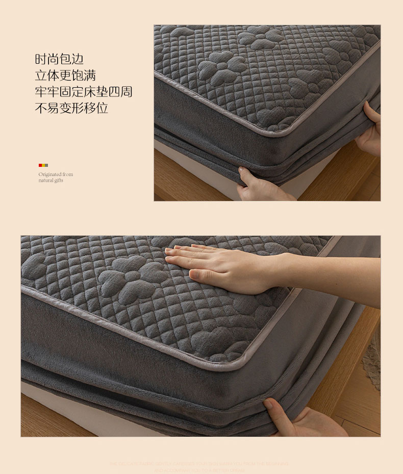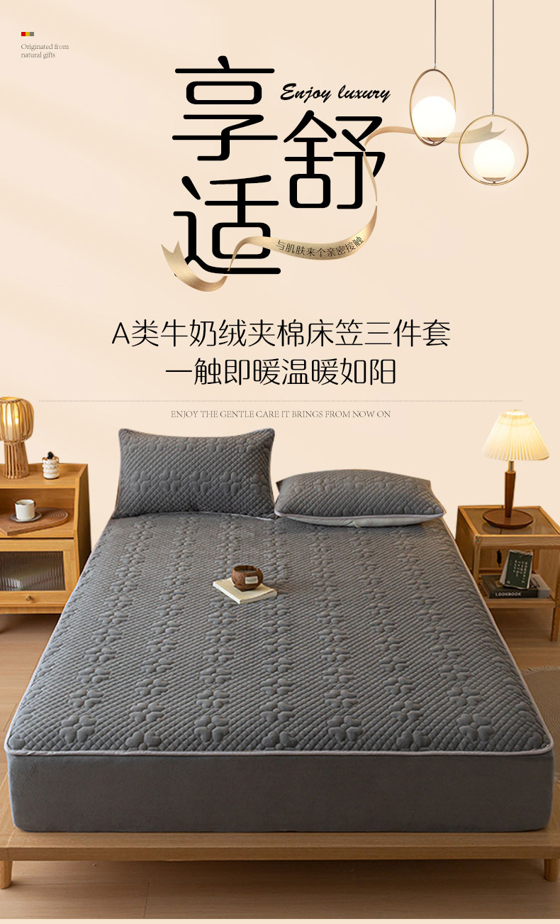 给笠 2023新款A类夹棉牛奶绒床笠三件套 花漫系列 牛奶绒-花漫雅灰