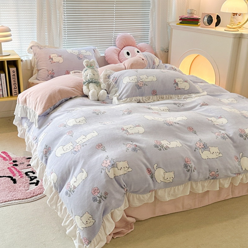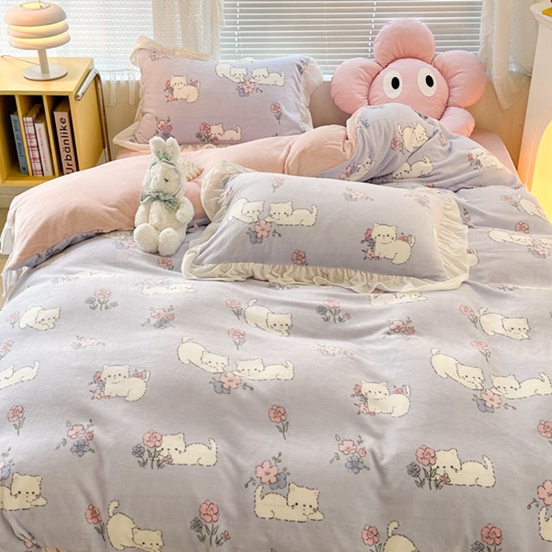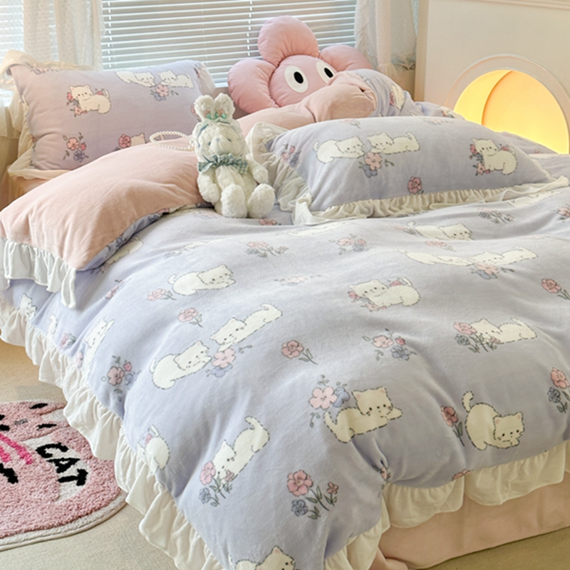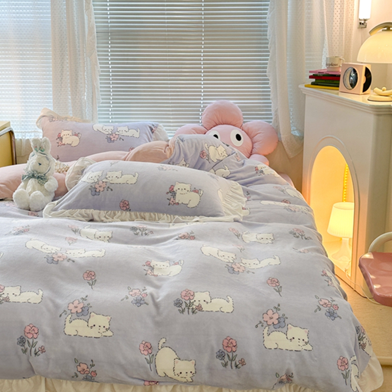 昔可家纺 2023新款花边款牛奶绒四件套 花花小猫咪
