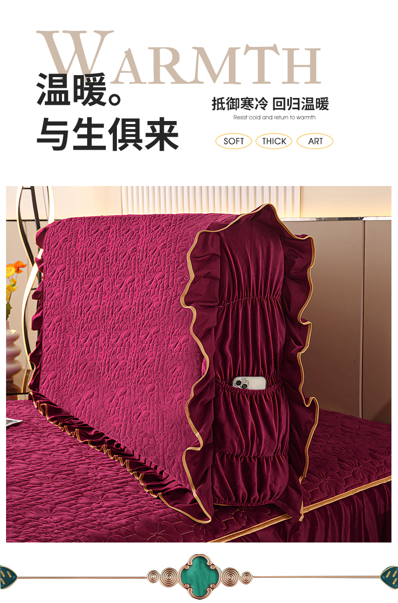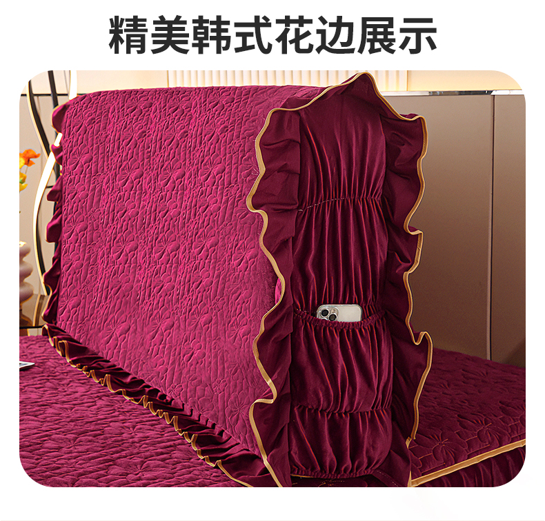 (总)屹成家纺2025新款水晶绒夹棉绗缝蕾丝床裙三件套(塞纳河畔)床裙单件起售价不低于105元,大红,豆沙,翡翠绿,粉玉,橄榄绿,蔚蓝,银灰