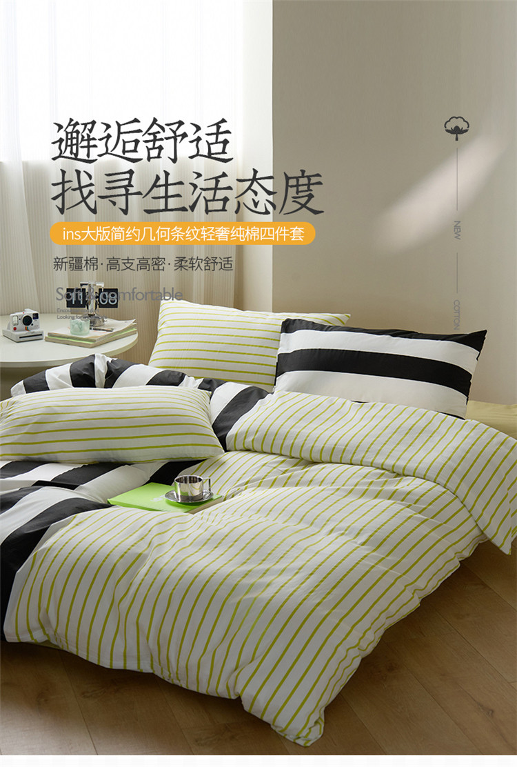 桃子 新款ins博主大版简约几何条纹轻奢拼接条纹纯棉四件套 棉大版-绿黑条纹