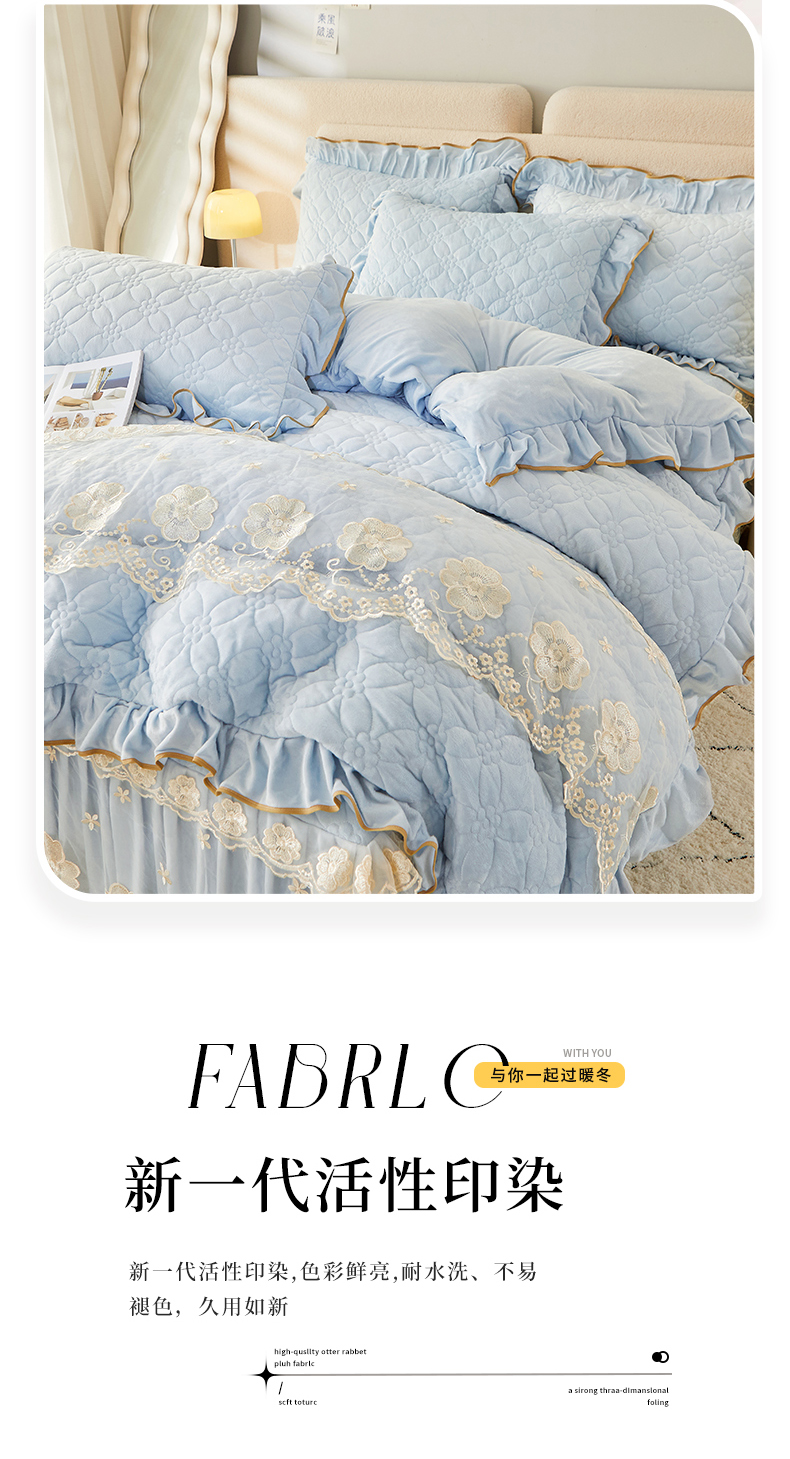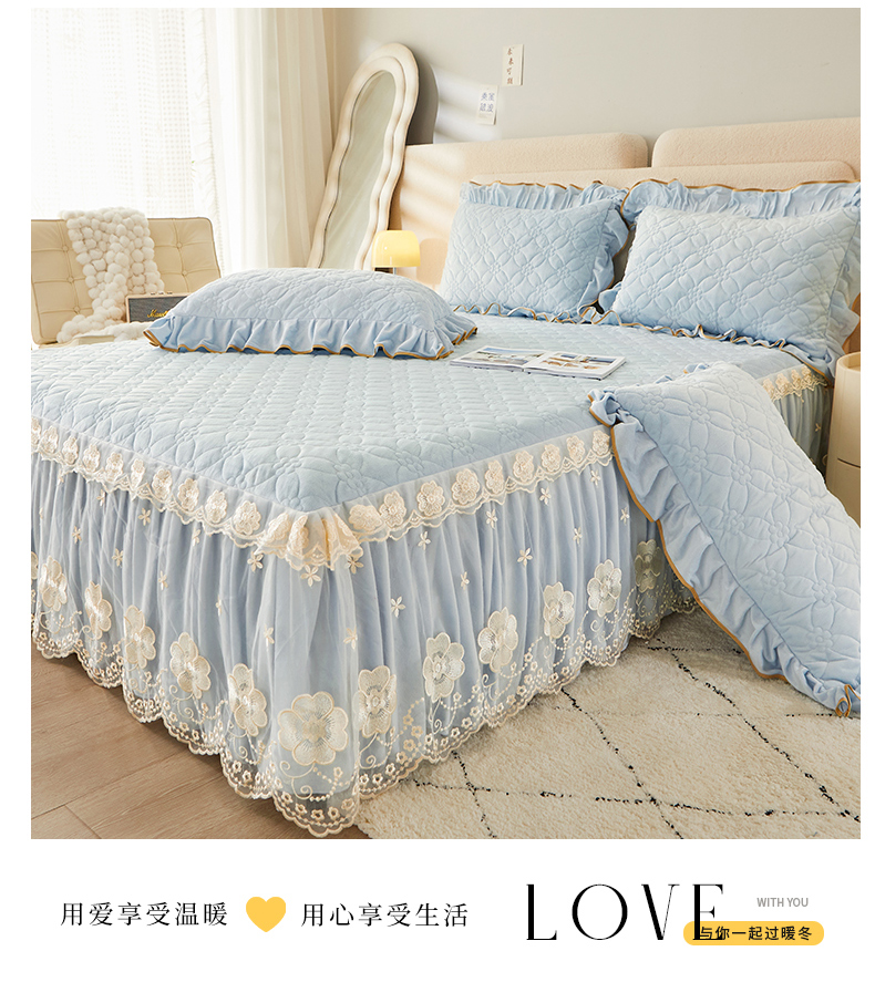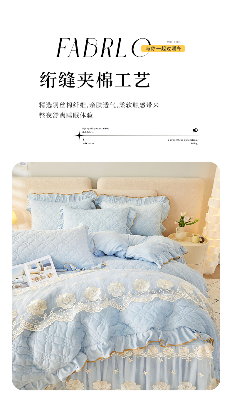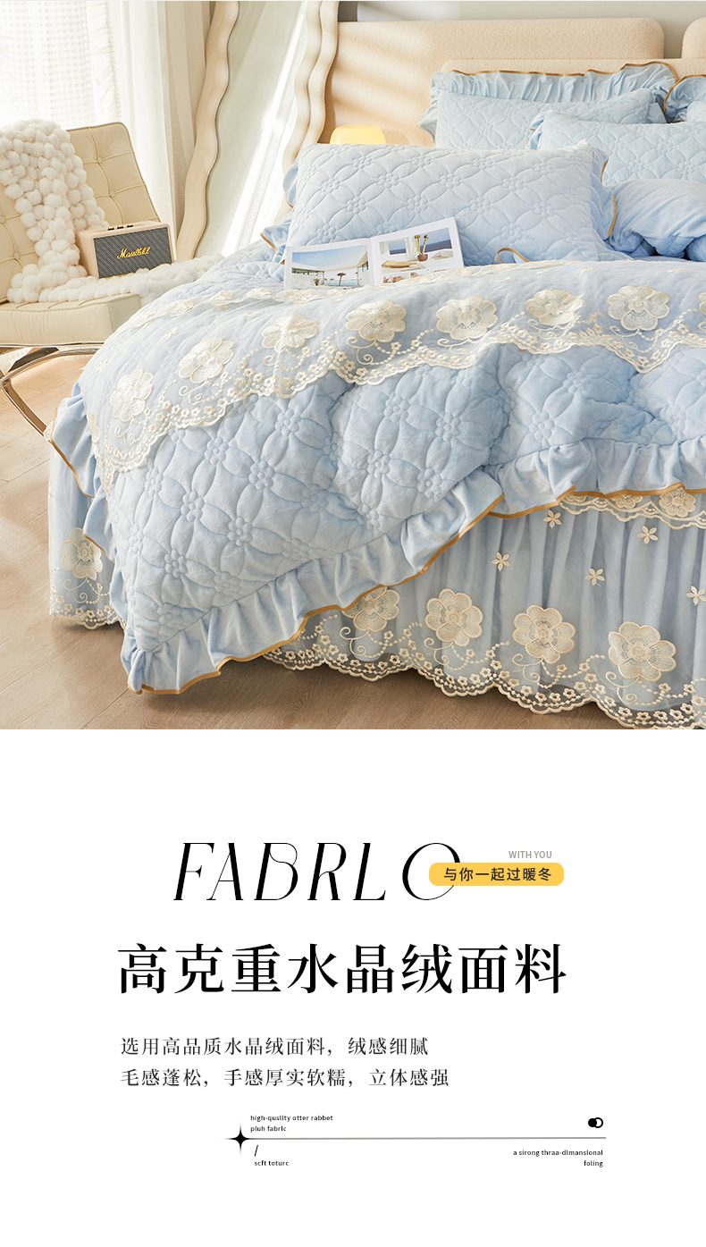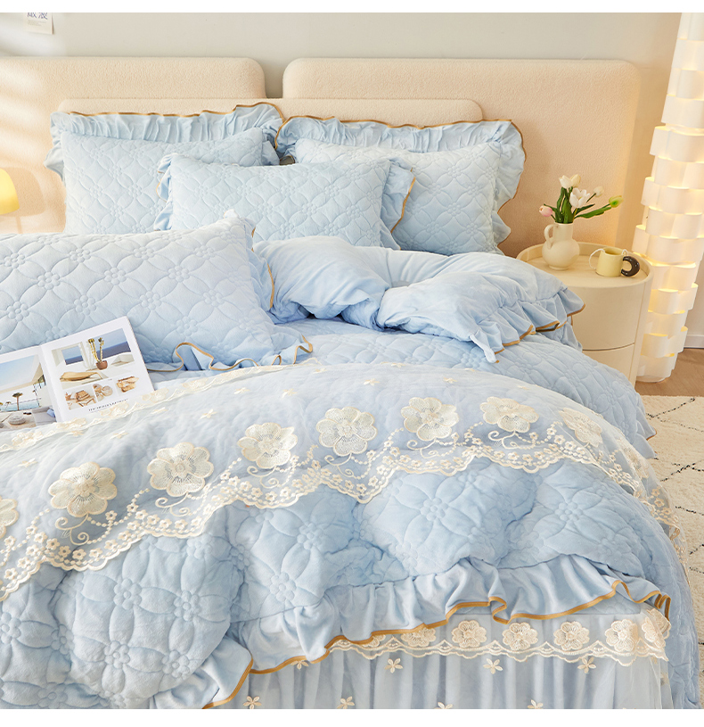 当前位置: 91家纺网 > 商品网购 > 床品套件 > 四件套 > 全棉普通四件套 > 罗艺轩 2024秋冬新款水晶绒花样年华全夹棉加厚床裙四件套 花样年华-天空蓝