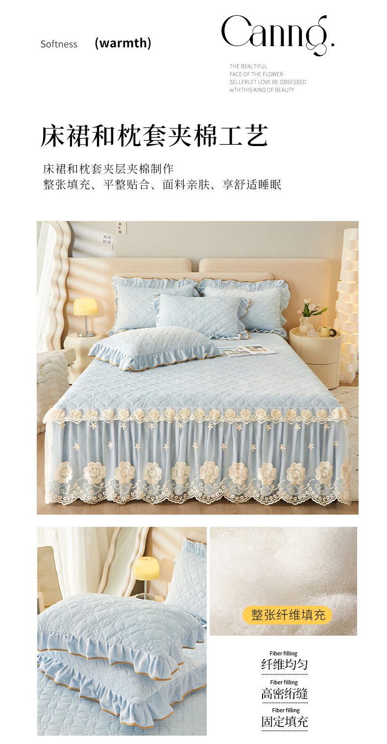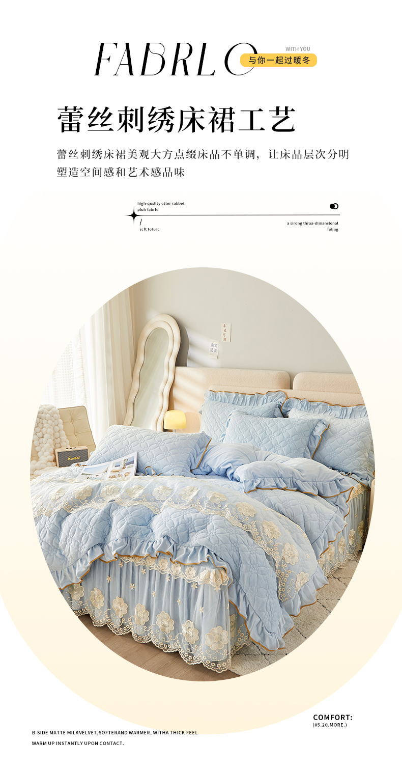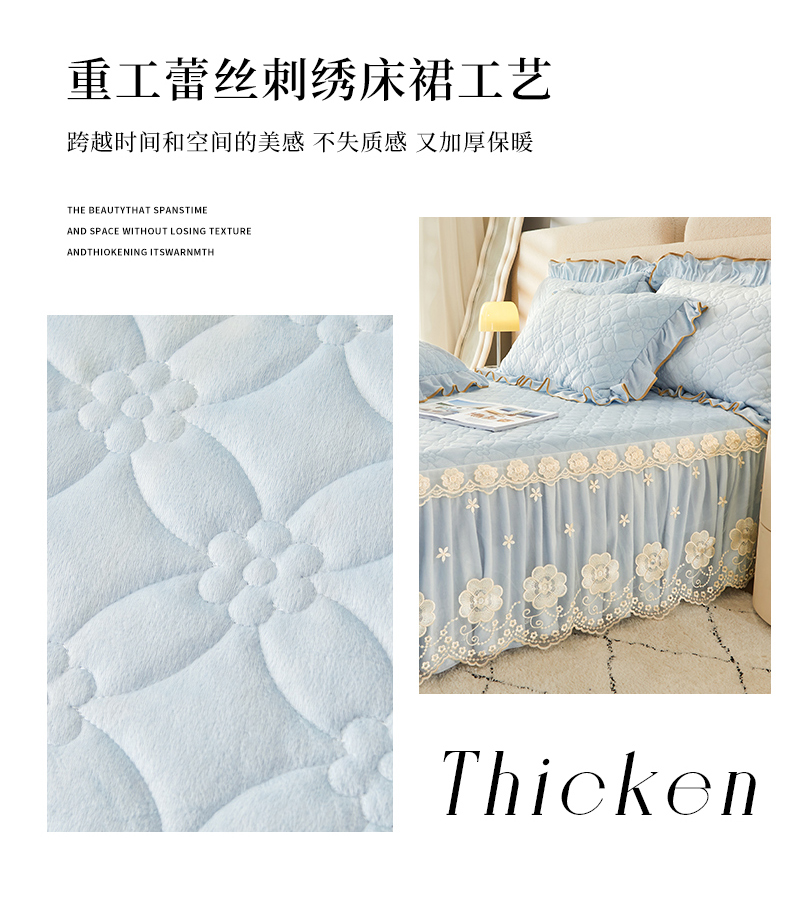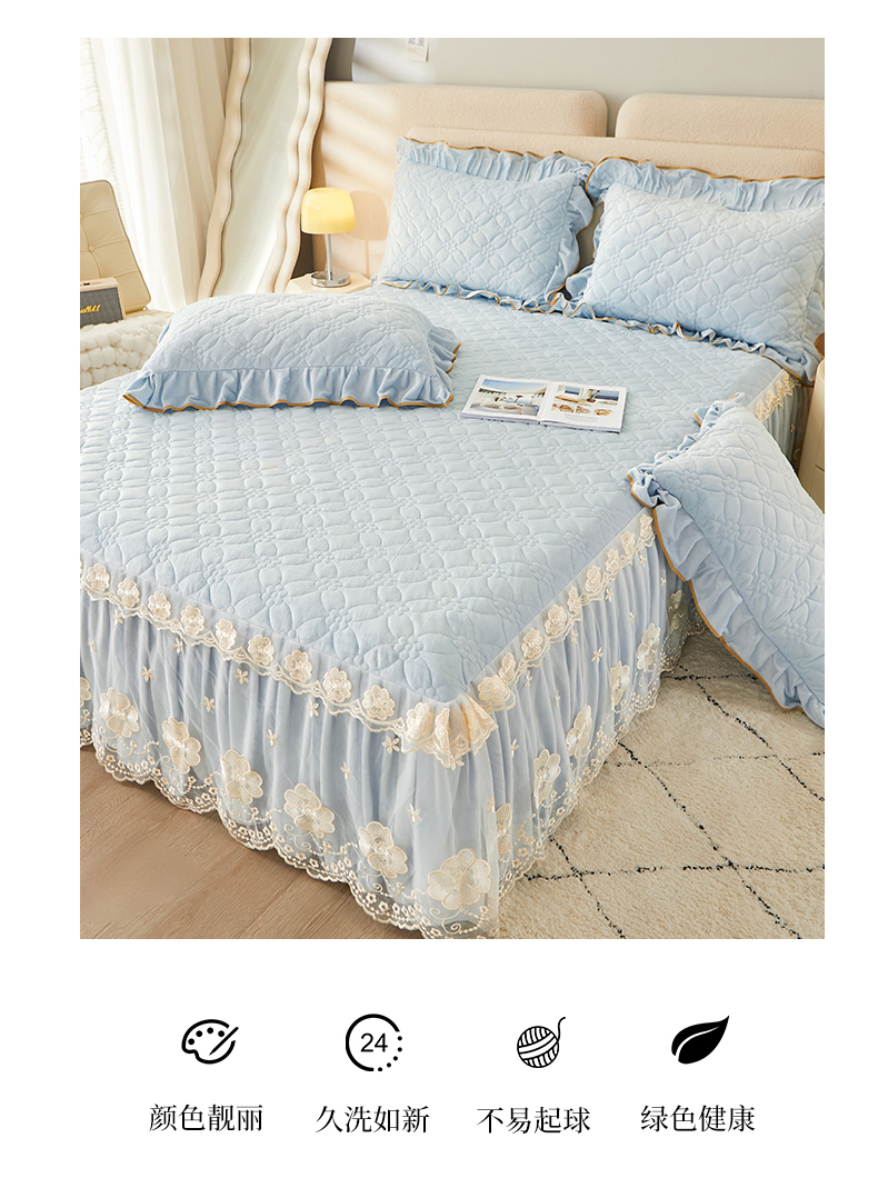 当前位置: 91家纺网 > 商品网购 > 床品套件 > 四件套 > 全棉普通四件套 > 罗艺轩 2024秋冬新款水晶绒花样年华全夹棉加厚床裙四件套 花样年华-天空蓝
