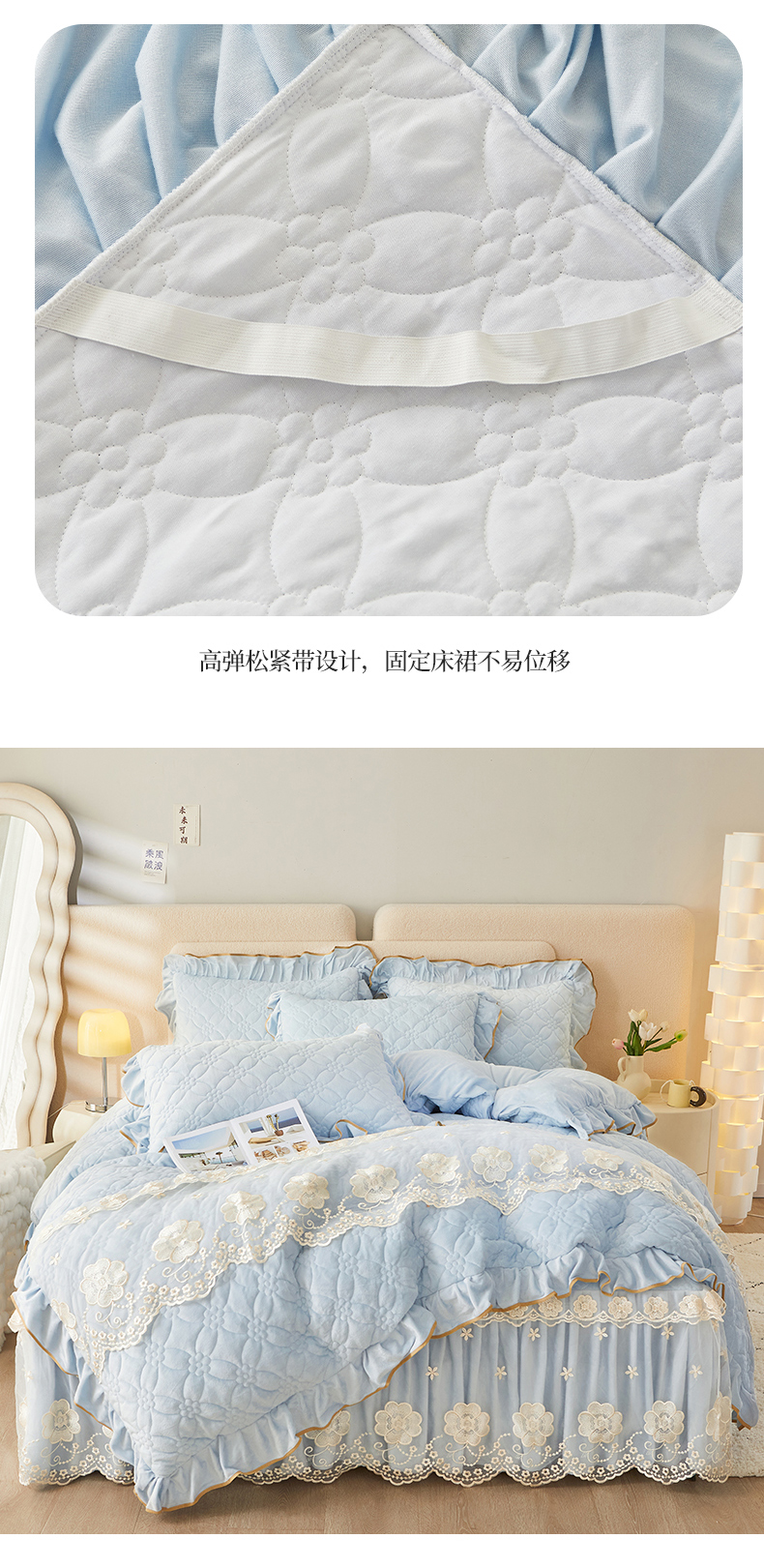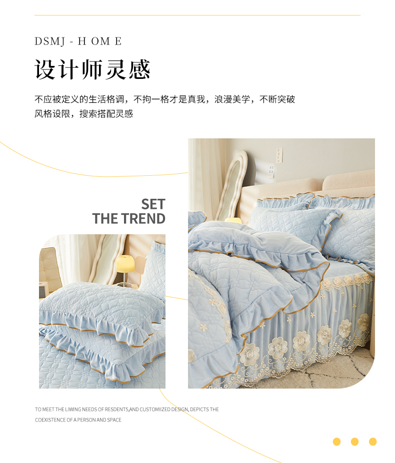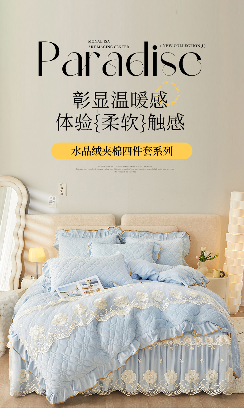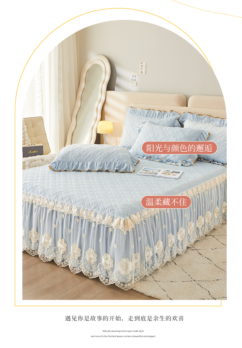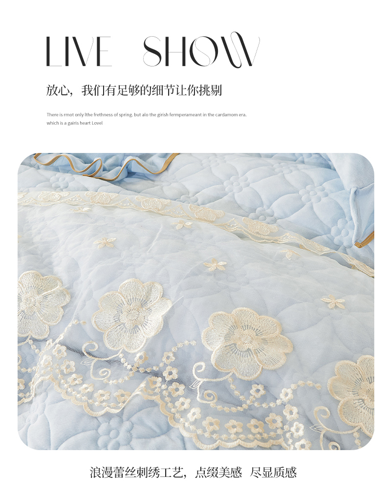 当前位置: 91家纺网 > 商品网购 > 床品套件 > 四件套 > 全棉普通四件套 > 罗艺轩 2024秋冬新款水晶绒花样年华全夹棉加厚床裙四件套 花样年华-天空蓝