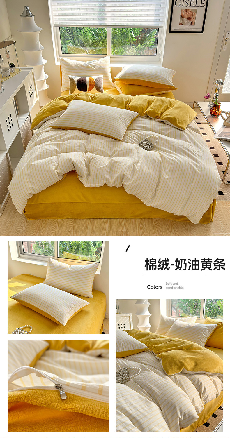 当前位置: 91家纺网 > 商品网购 > 床品套件 > 四件套 > 牛奶绒四件套 > 三沁 2023新款全棉水洗棉加绒四件套 棉绒-奶油黄条