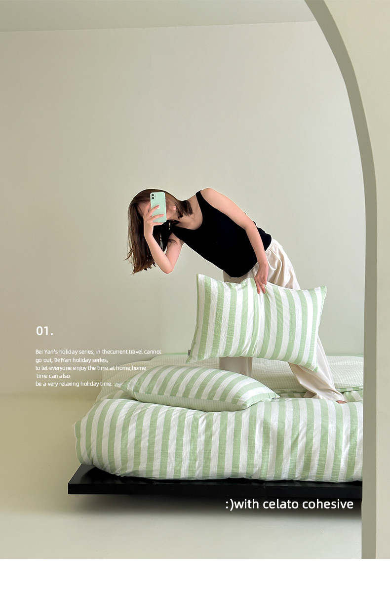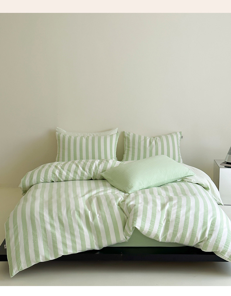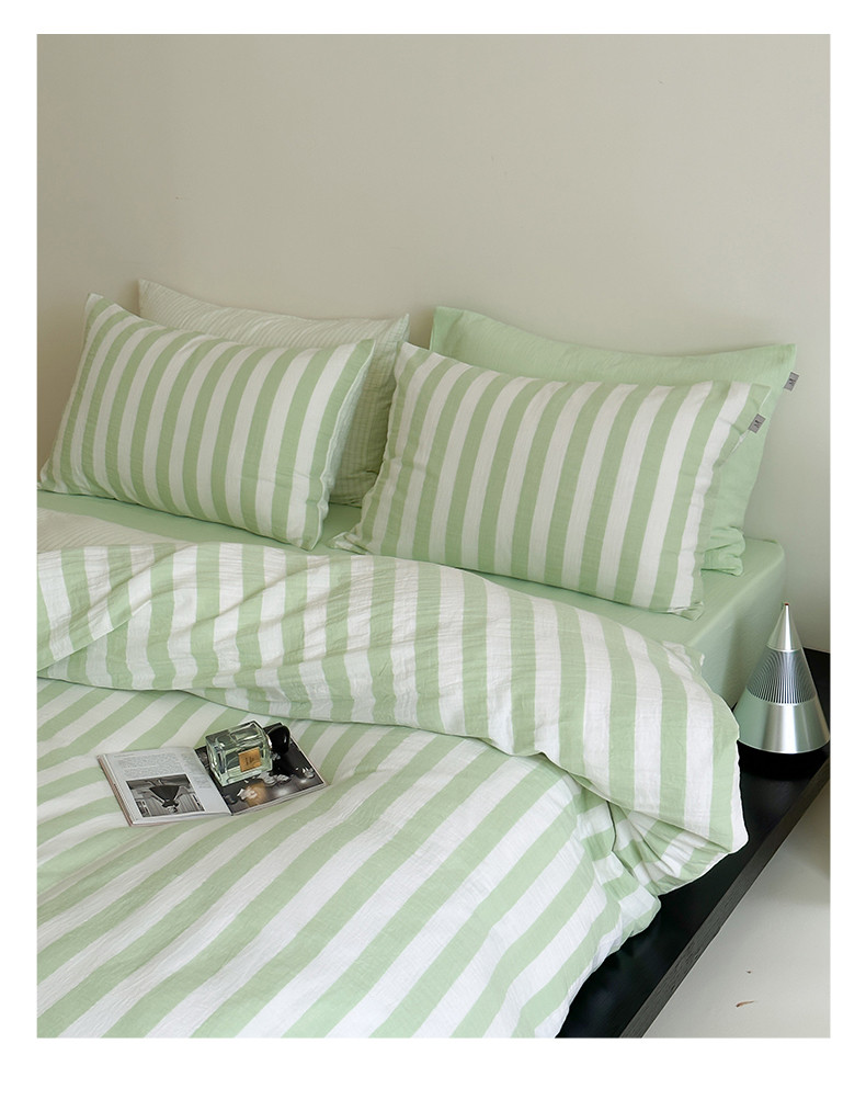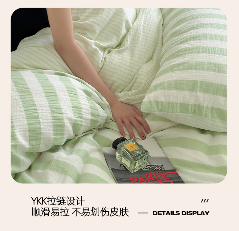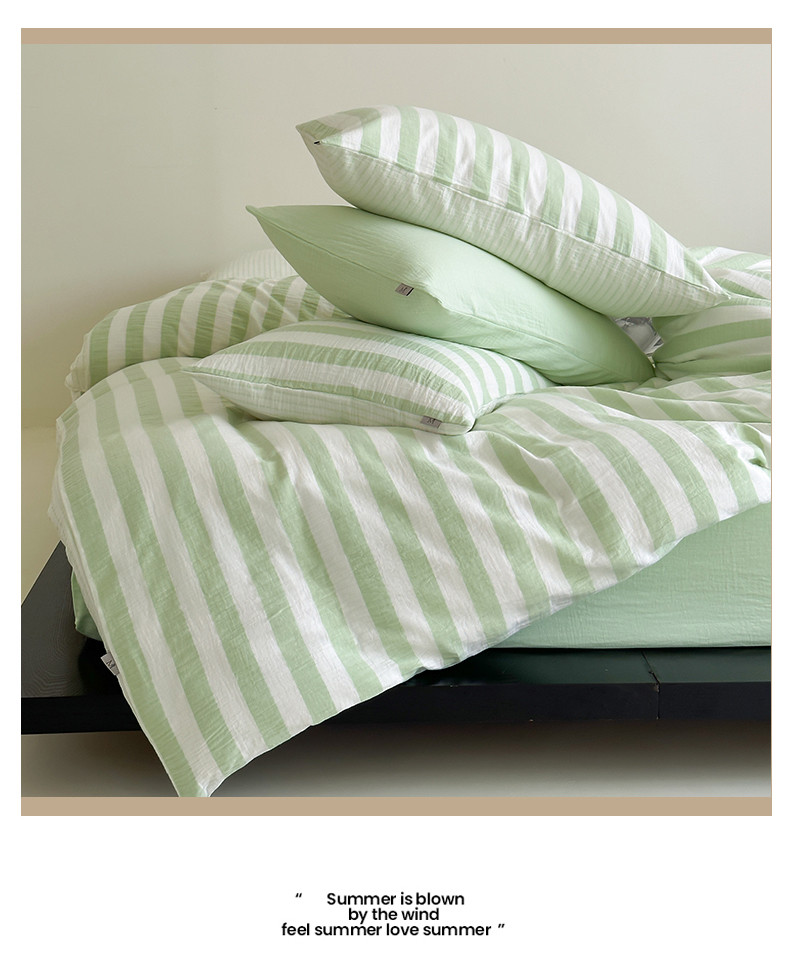 玛奇朵 2023新款色织双层皱纱-韩系条纹四件套 韩系条纹-青提绿