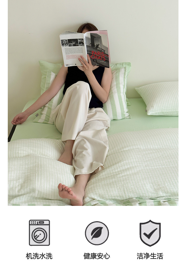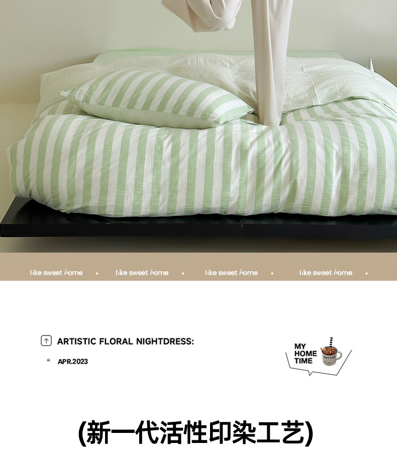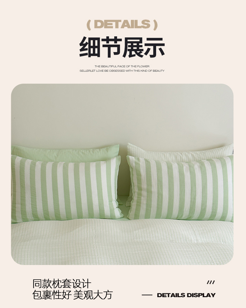 商品名称:玛奇朵 2023新款色织双层皱纱-韩系条纹四件套 韩系条纹-青提绿