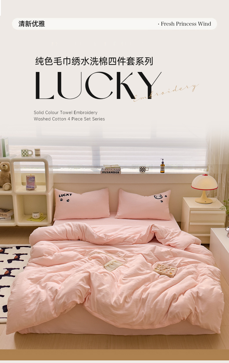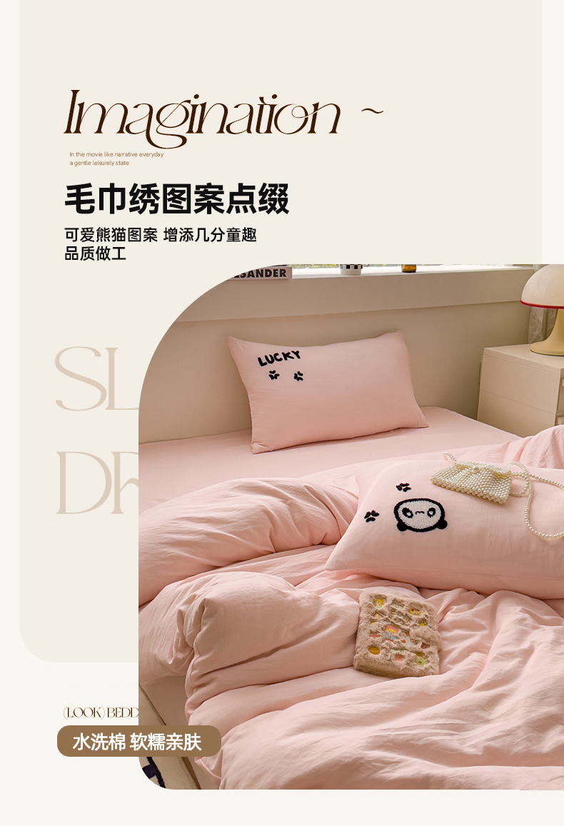 当前位置: 91家纺网 > 商品网购 > 床品套件 > 四件套 > 普通磨毛四件套 > 梦嘉居 2024新款直播热款A类ins风多巴胺色超柔亲肤磨毛纯色水洗棉毛巾绣套件-四件套 幸运熊猫-公主粉