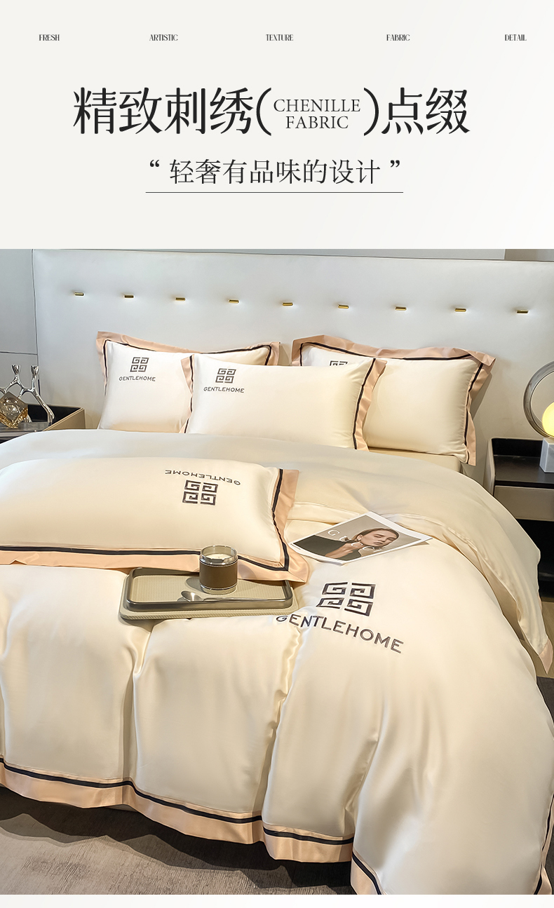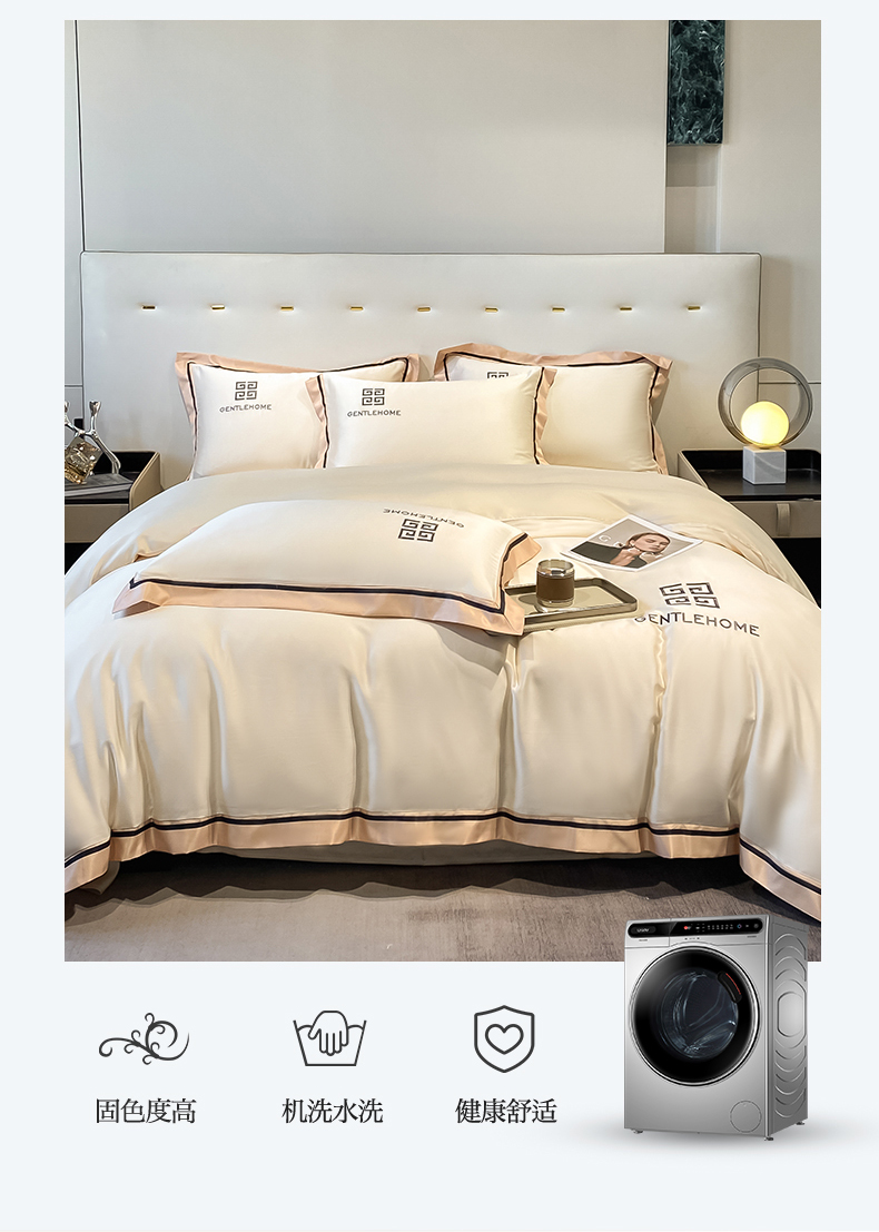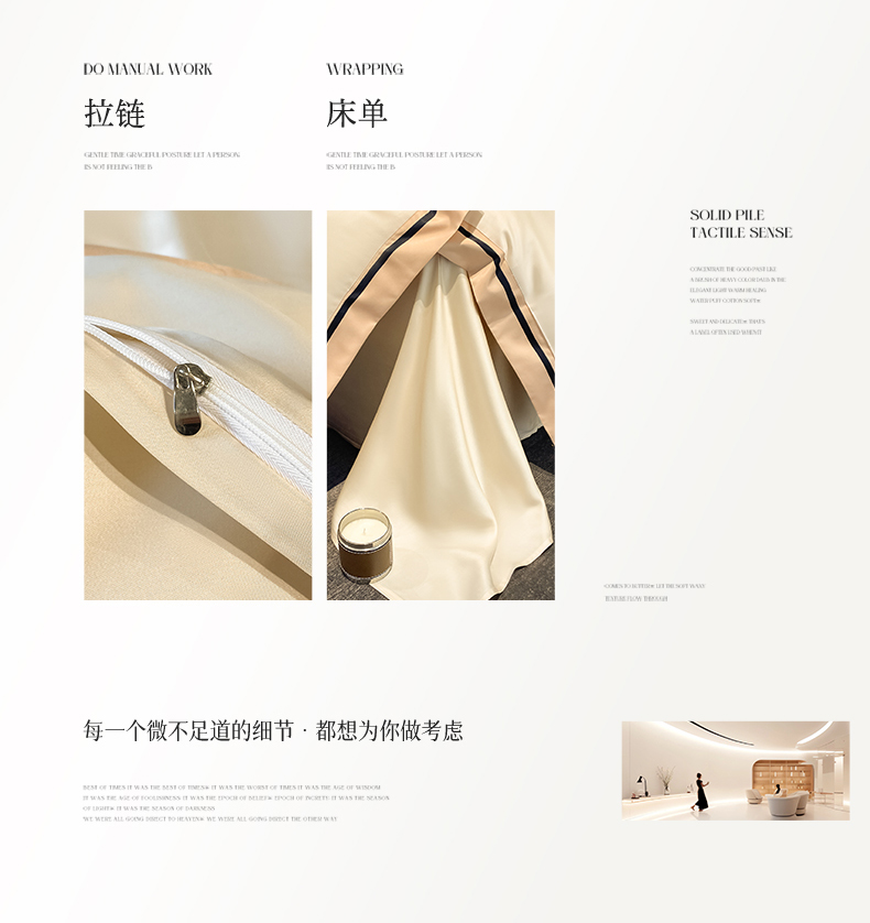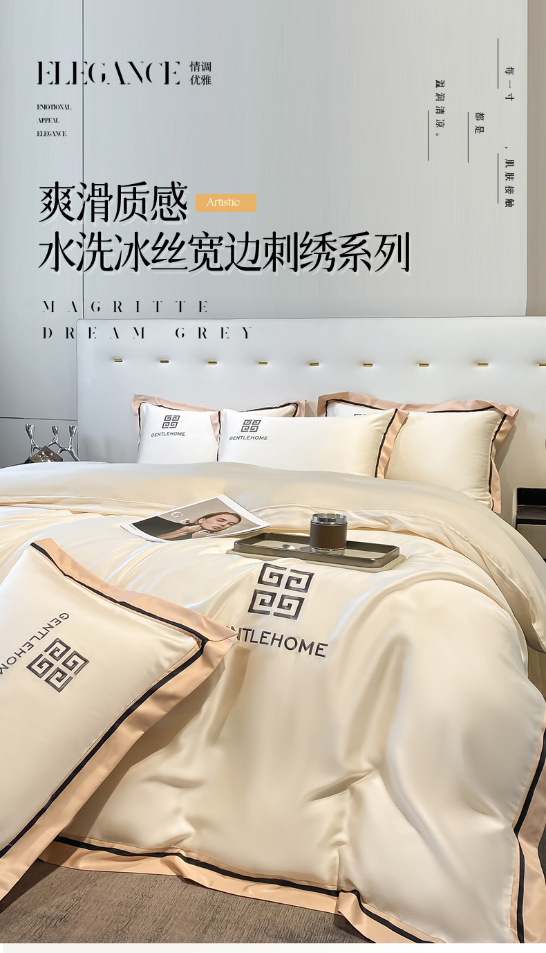 商品名称:眷恋家纺 2024新品水洗真丝宽边四件套-挪威系列 挪威-奶昔白+奶茶