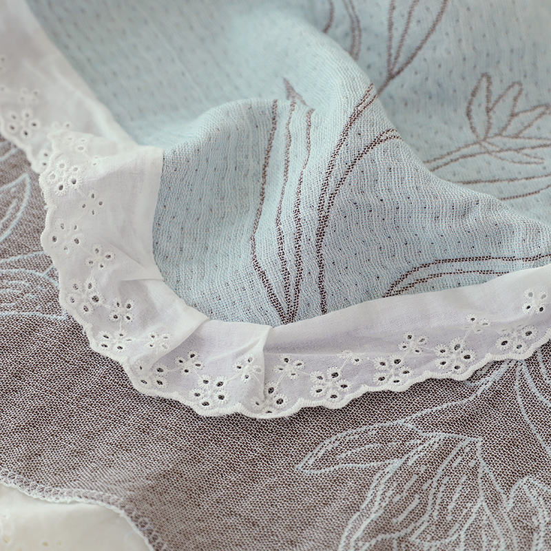 • 91家纺网 家纺一手货源 找家纺 朴尔毛巾被2024年新款韩式花边四层纱枕巾纯棉竹纤维加大成人纱布巾 怒放-蓝52*78cm