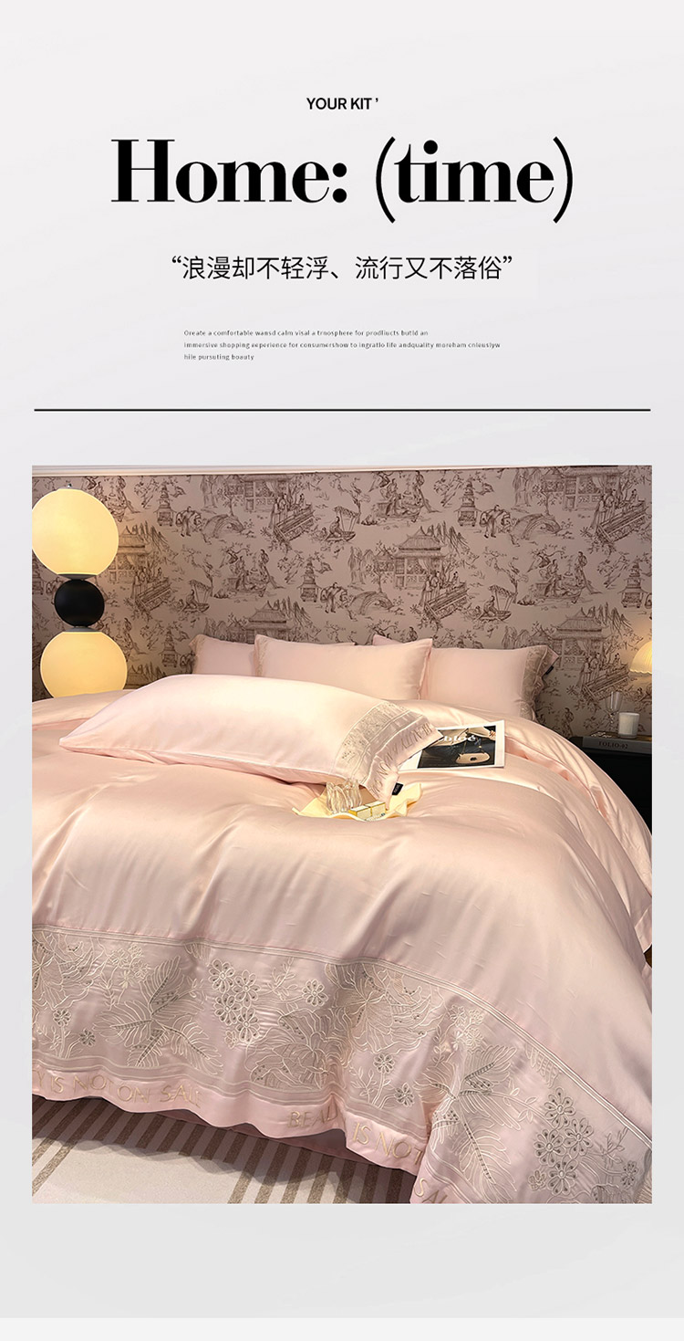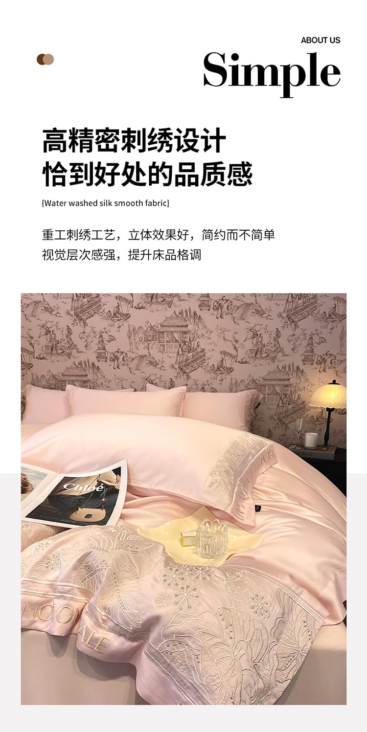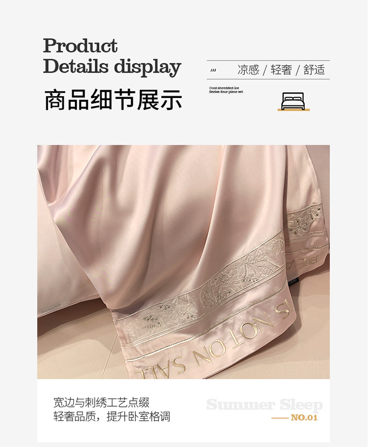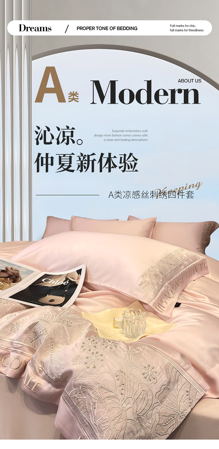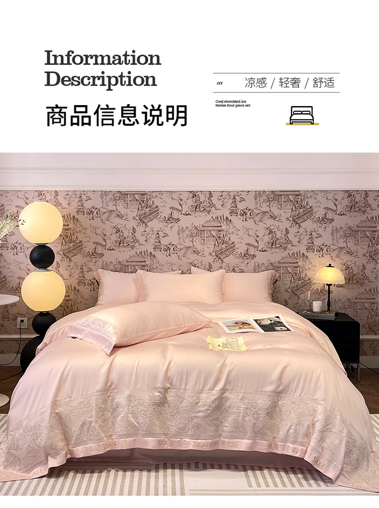 商品名称: 2024新款A类母婴级凉感真丝夏季裸睡丝滑床单床笠轻奢刺绣四件套 樱花粉