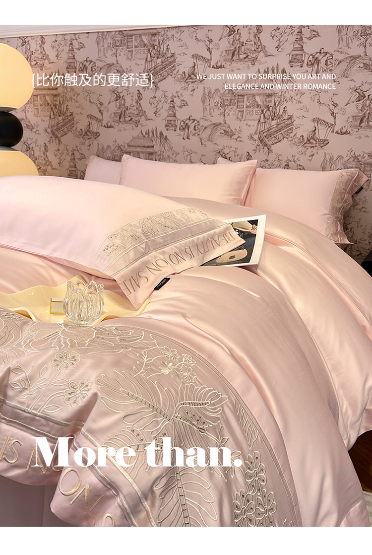 2024新款A类母婴级凉感真丝夏季裸睡丝滑床单床笠轻奢刺绣四件套 樱花粉