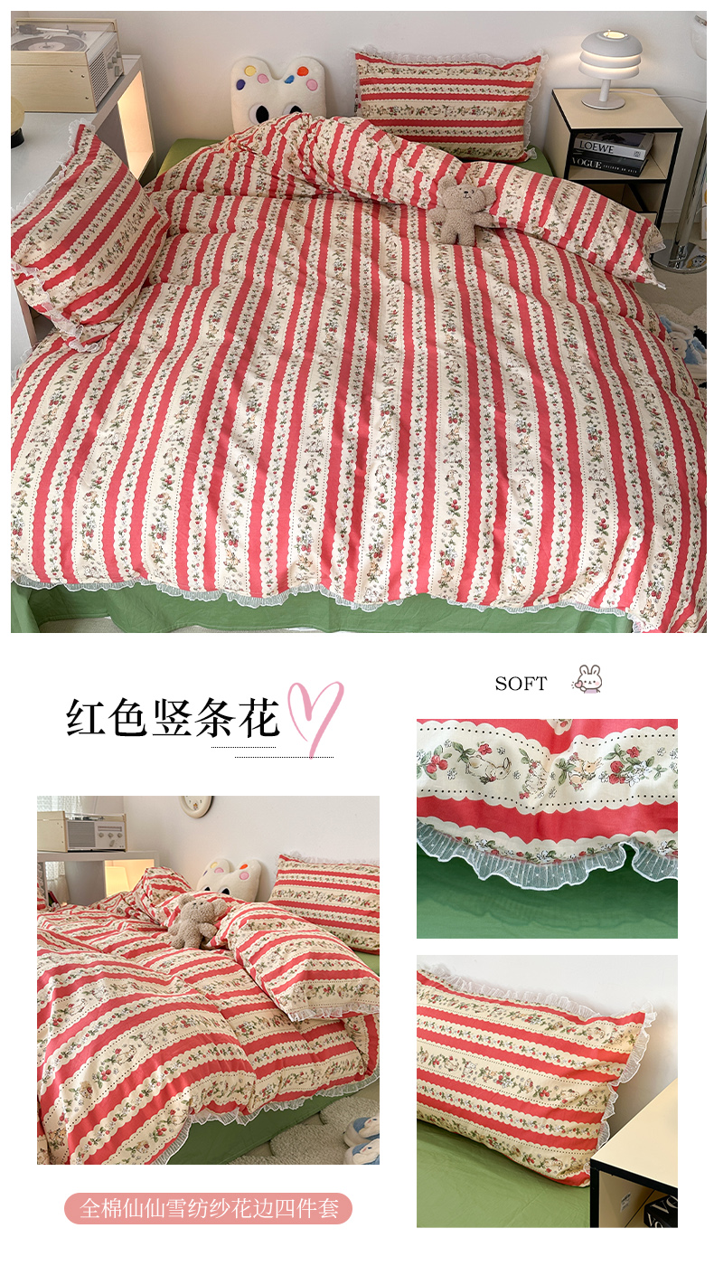 商品名称:昔可家纺 2024新款全棉仙仙雪纺纱花边四件套 红色竖条花