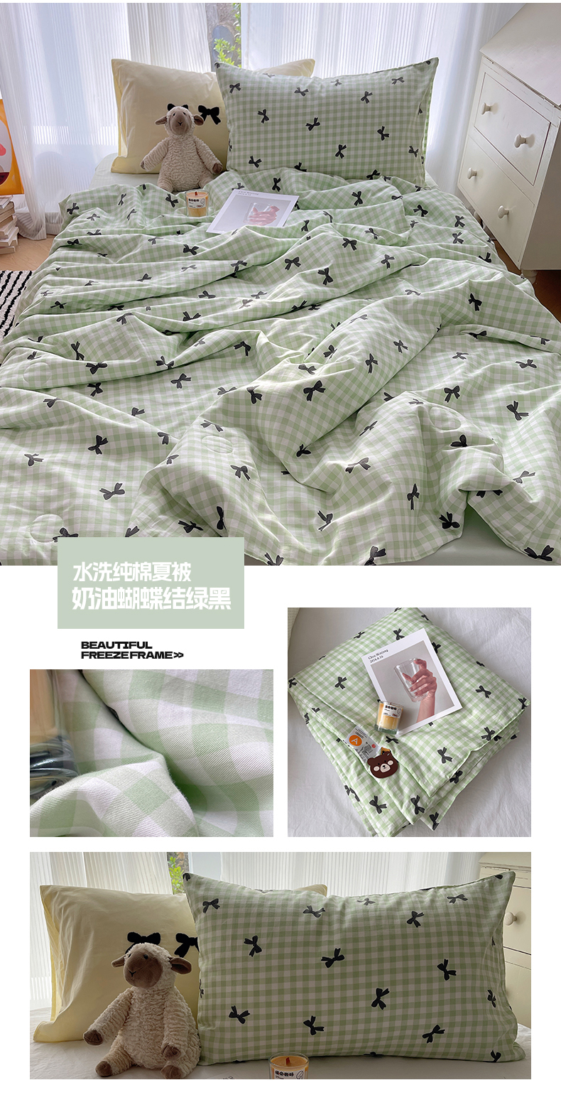 • 91家纺网 家纺一手货源 找家纺 桃子家居 2024新款A类纯棉水洗棉毛巾绣奶油蝴蝶结夏被四件套单夏被单品系列 水洗纯棉夏被-奶油蝴蝶结绿黑