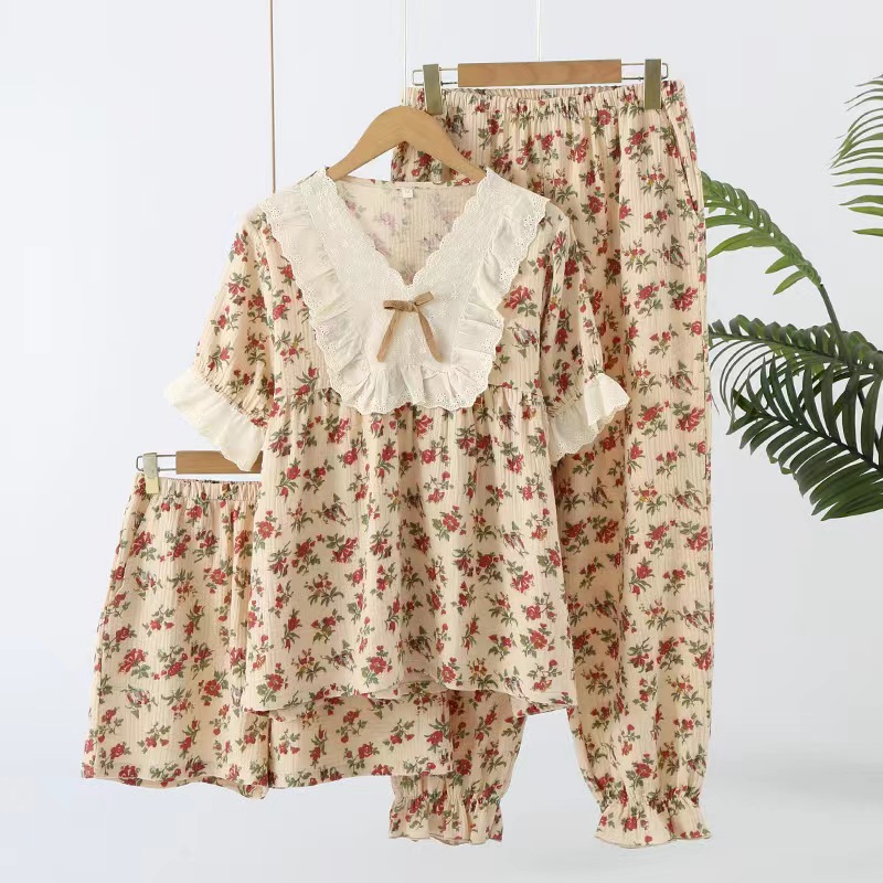 洛兰沙家居馆【只代发】【只代发】 2024新款温柔女碎花纯棉棉纱宽松双层纱布家居服半袖长裤三件套 卡其花