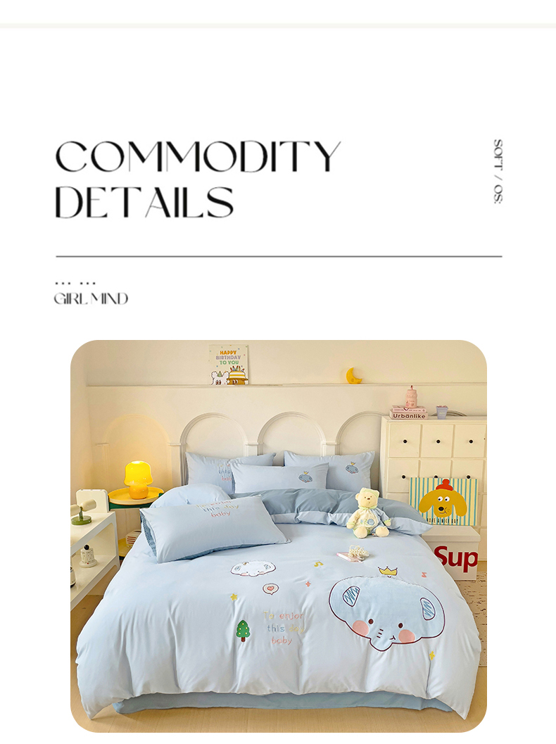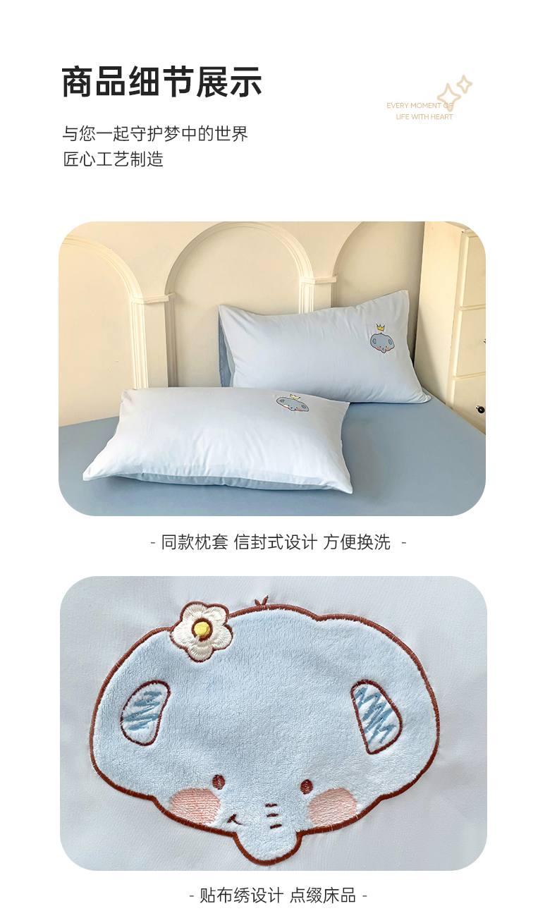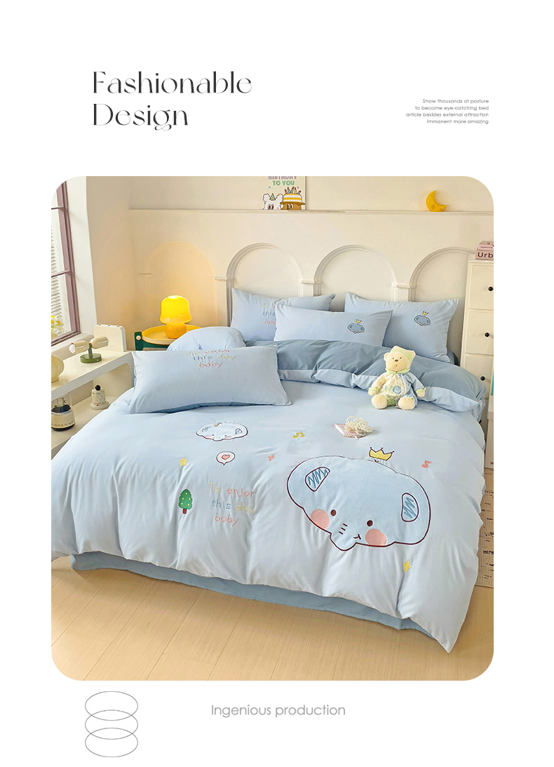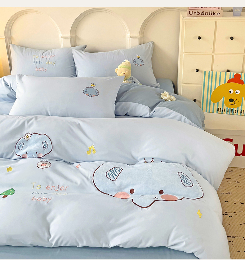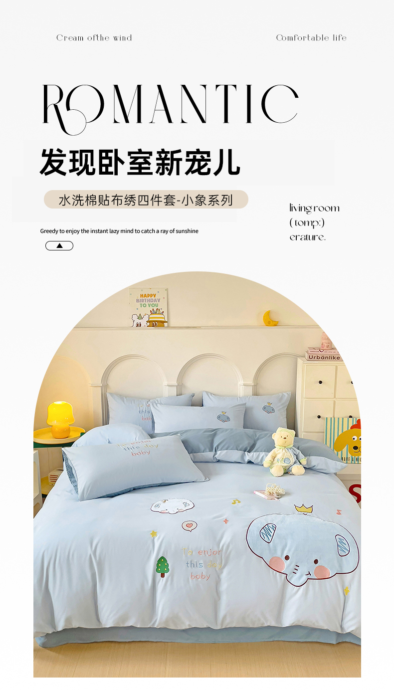 当前位置: 91家纺网 > 商品网购 > 床品套件 > 四件套 > 水洗棉四件套 > 我心家纺 2024新款水洗棉贴布绣四件套-小象 小象-蓝灰