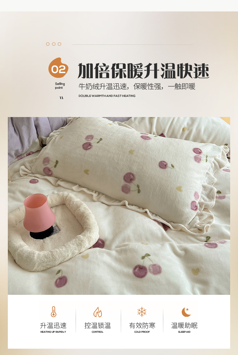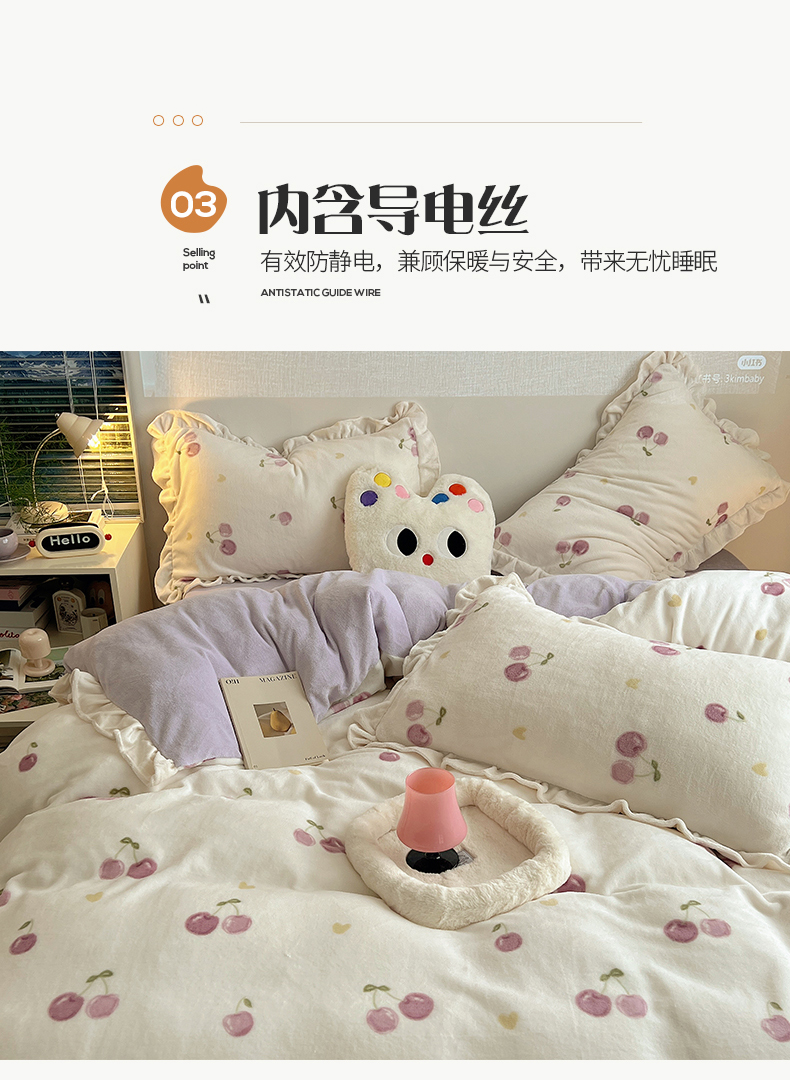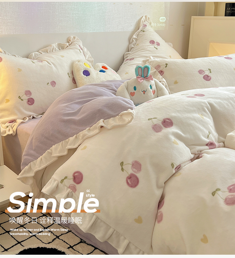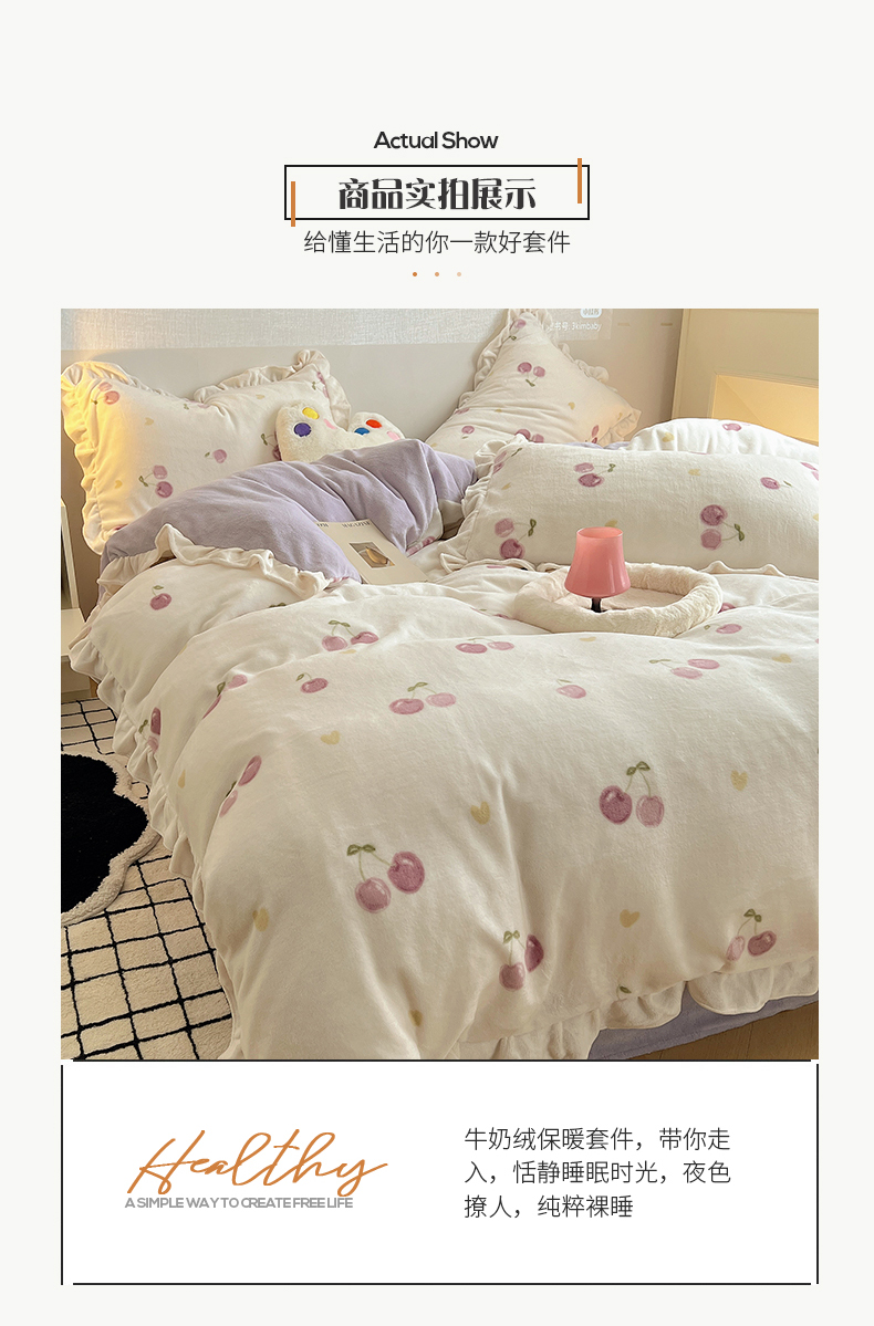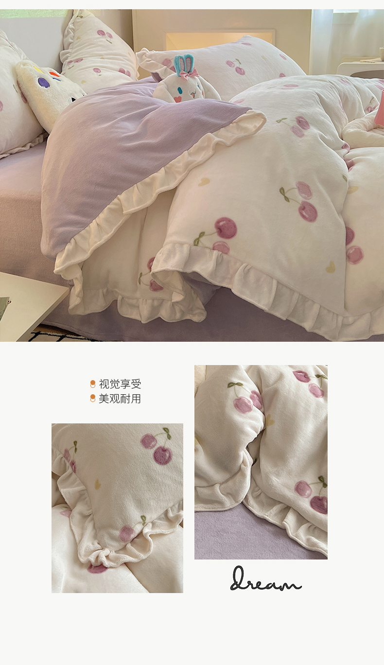 桃子家居 2024新款A类ins韩版花边少女心加厚牛奶绒四件套 绒-花边紫樱桃