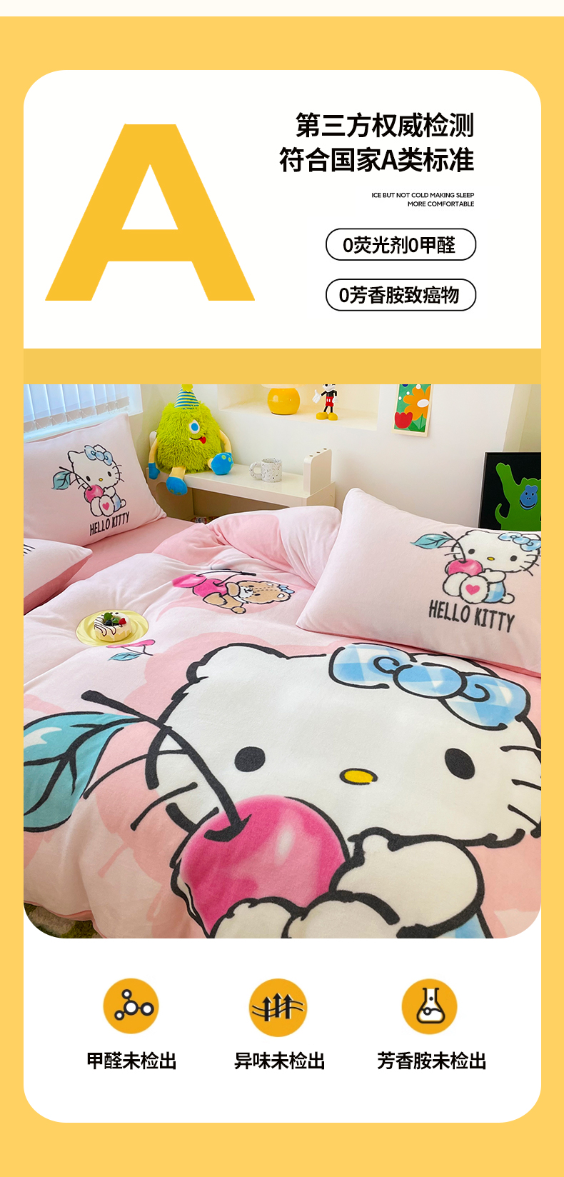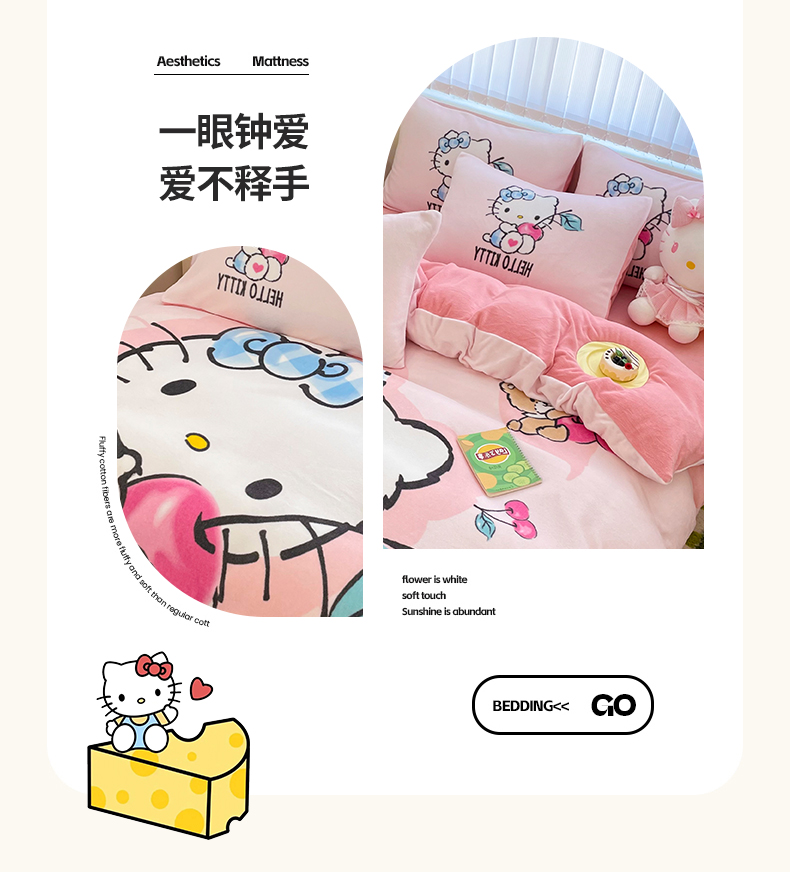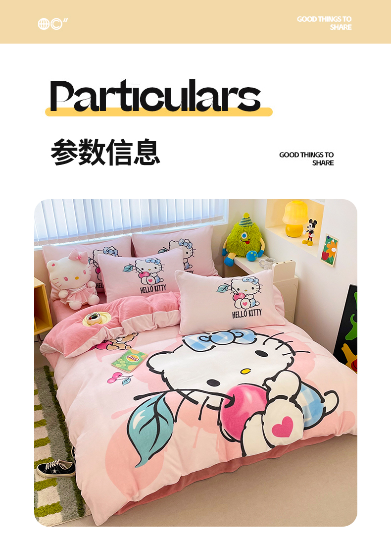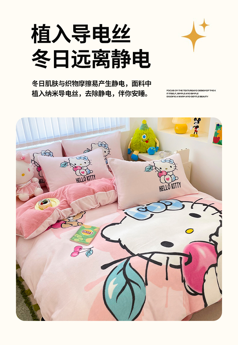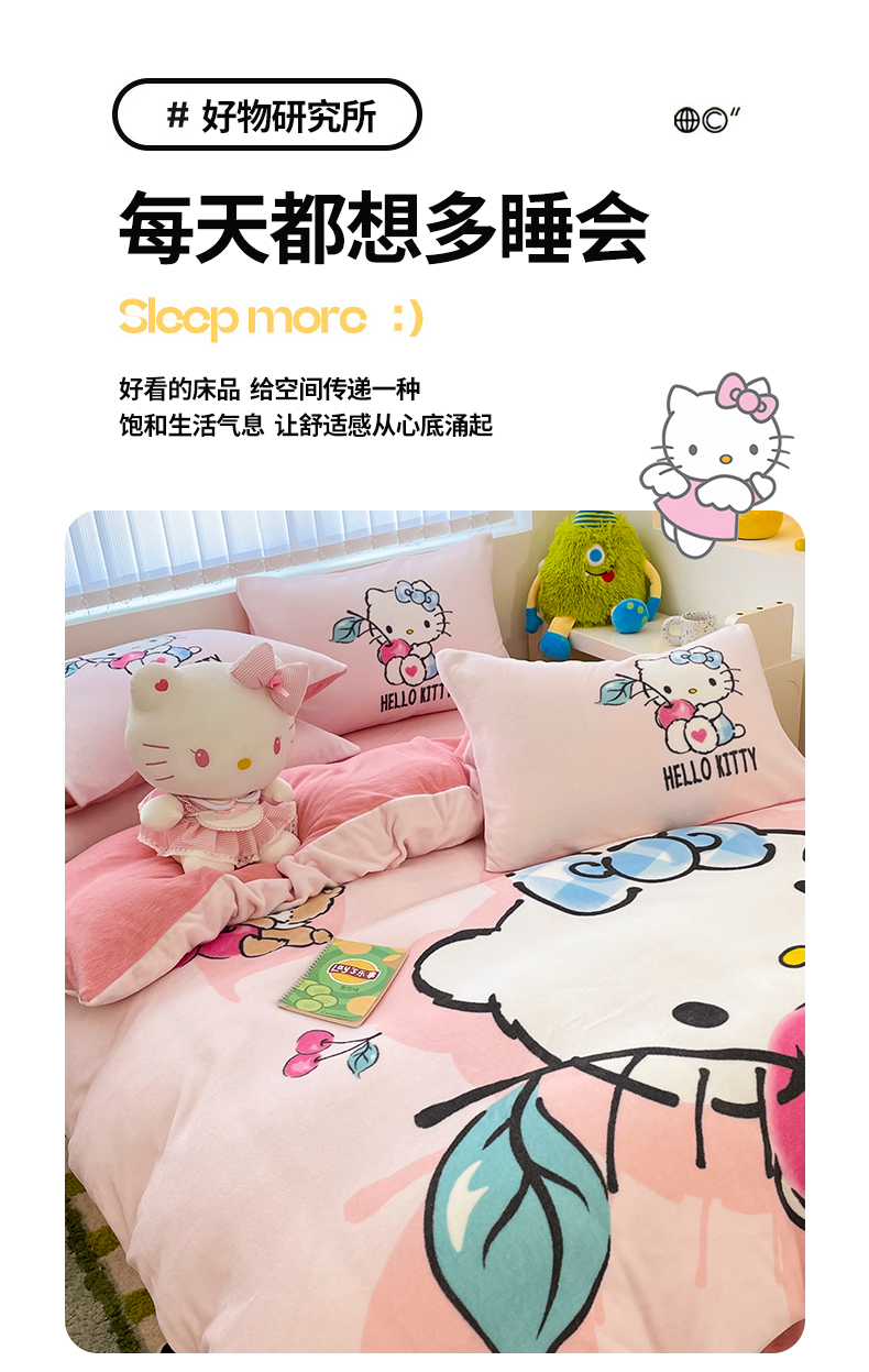 商品名称:米帛家纺 2024新款正版授权大版三丽鸥牛奶绒四件套 樱桃凯蒂猫
