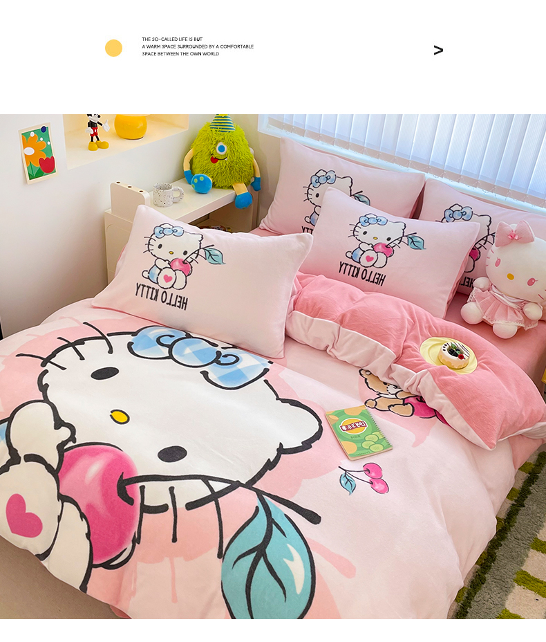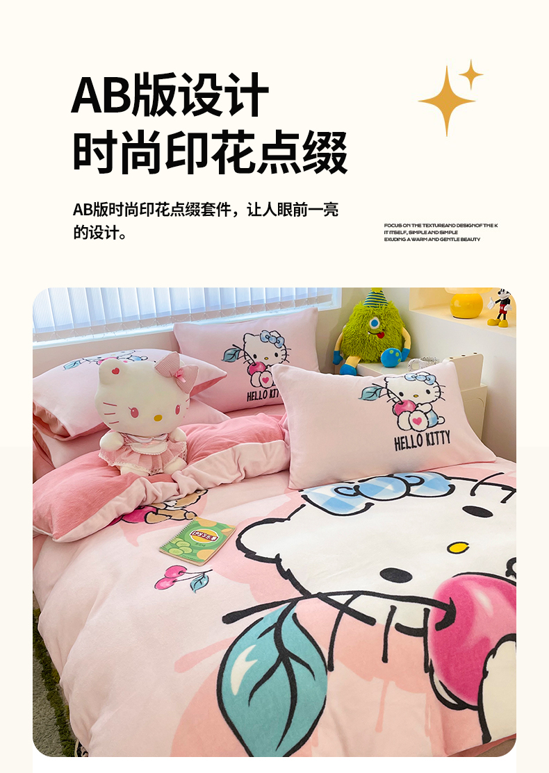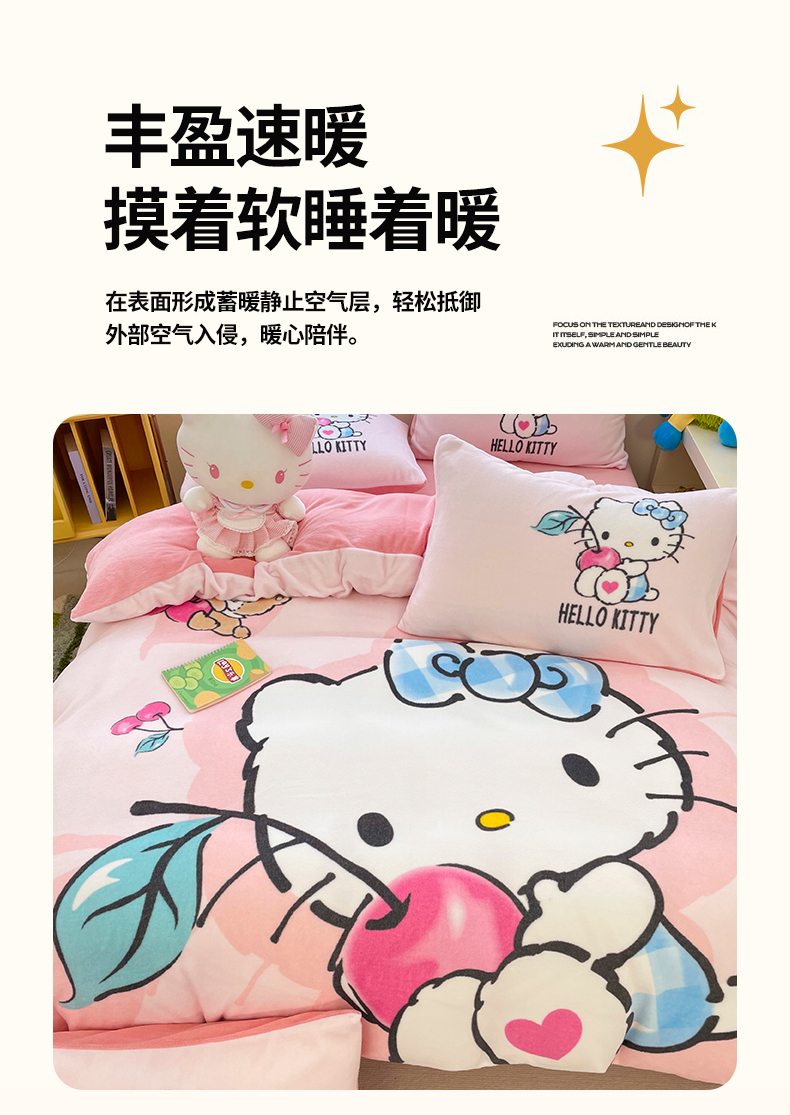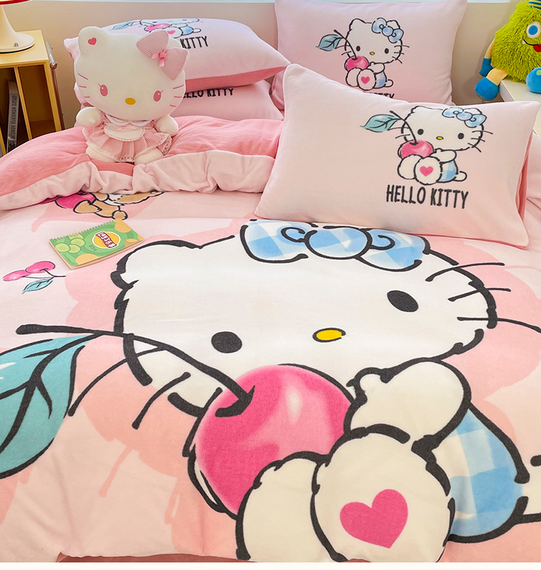 米帛家纺 2024新款正版授权大版三丽鸥牛奶绒四件套 樱桃凯蒂猫