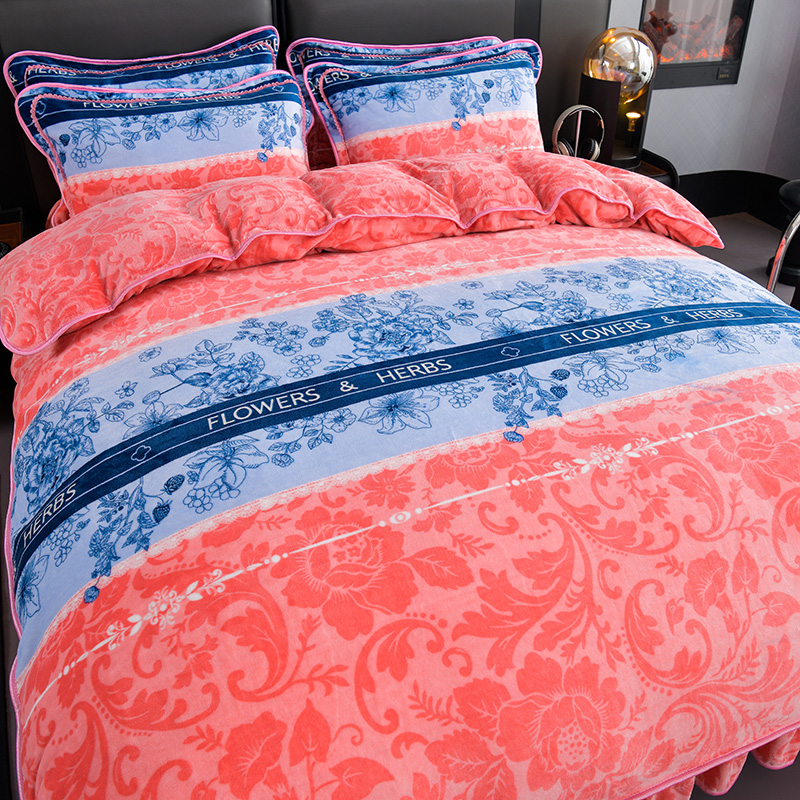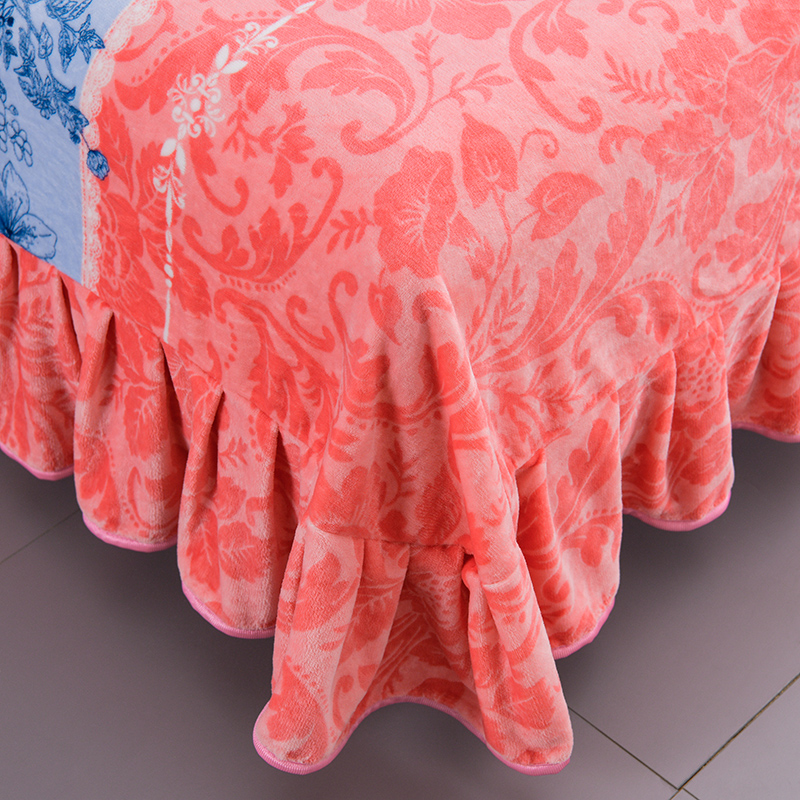 千嘻汇 2025新款8斤牛奶绒金貂法莱绒床裙款保暖绒四件套 温婉花语粉,温婉花语粉