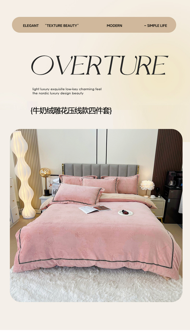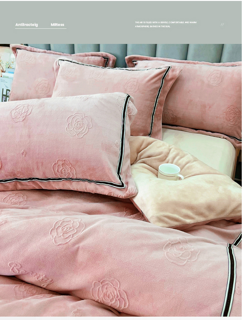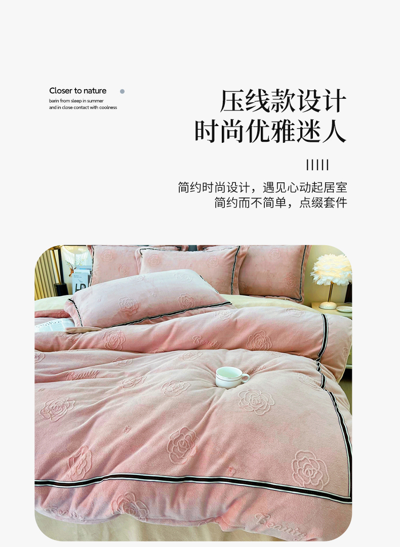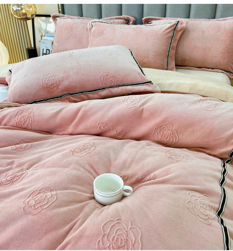 商品名称:鑫利来家纺 2024新款牛奶绒雕花压线款四件套 山茶花-豆沙