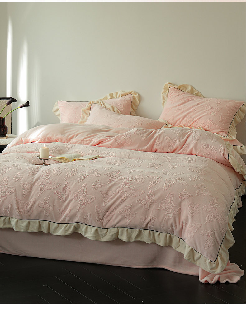 萝莉家纺 2024新款加厚牛奶绒提花浪漫雕花绒四件套 蝴蝶飞飞浅粉