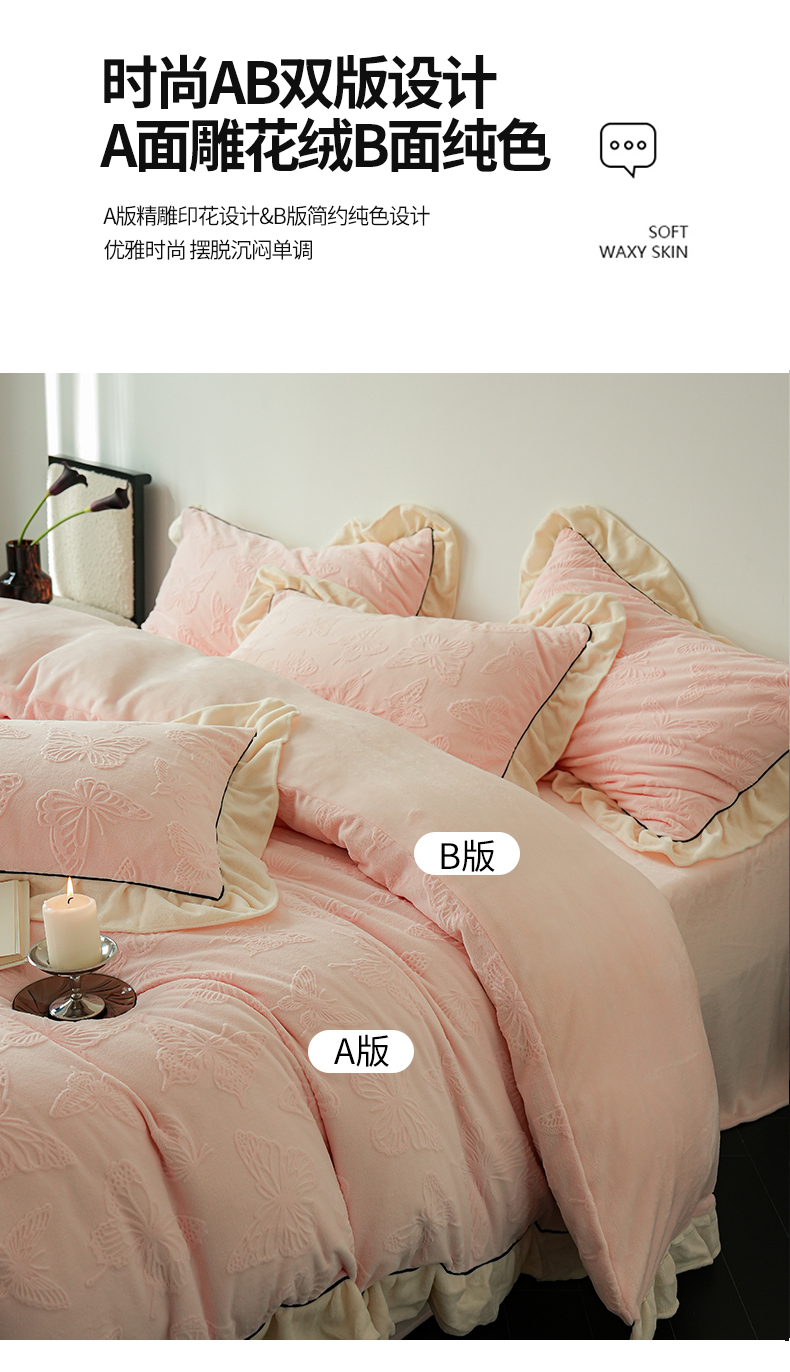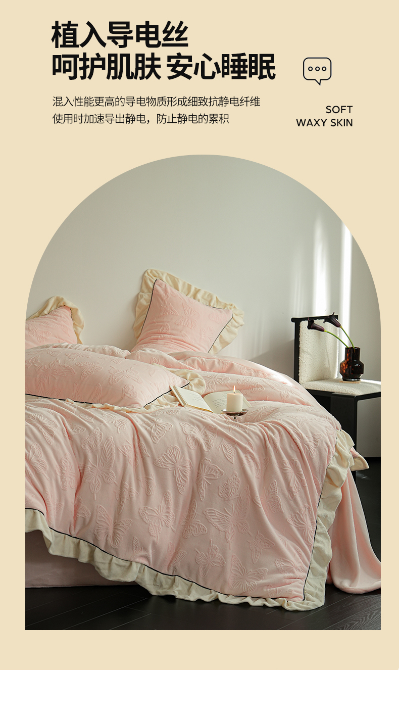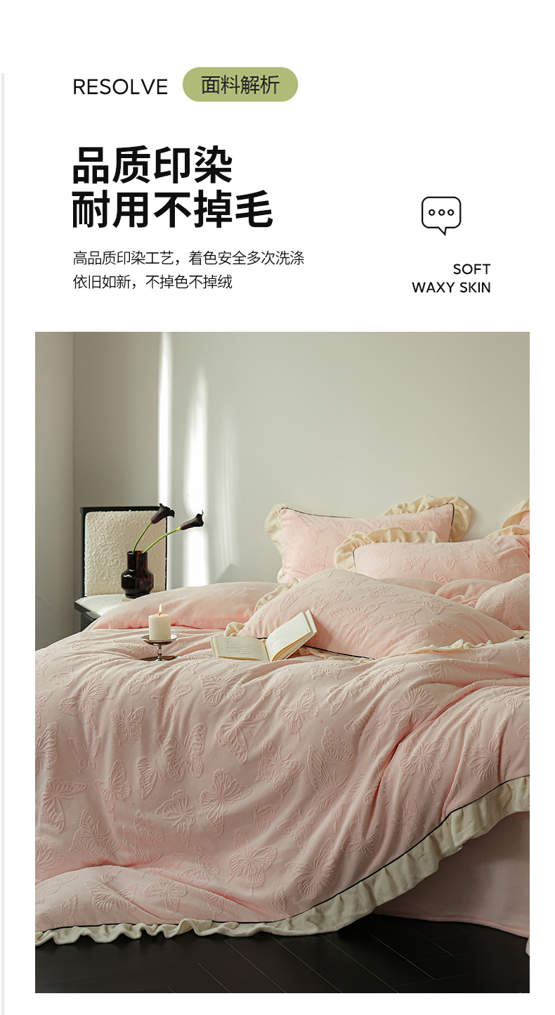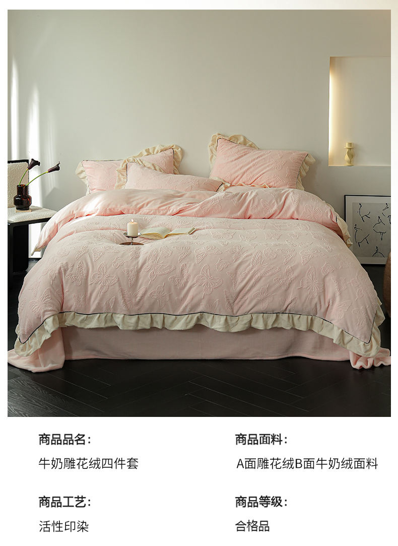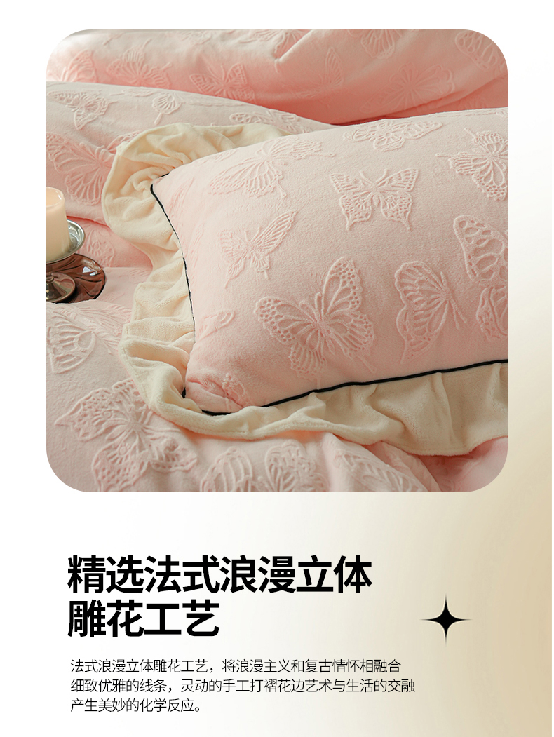 商品名称:萝莉家纺 2024新款加厚牛奶绒提花浪漫雕花绒四件套 蝴蝶飞飞浅粉