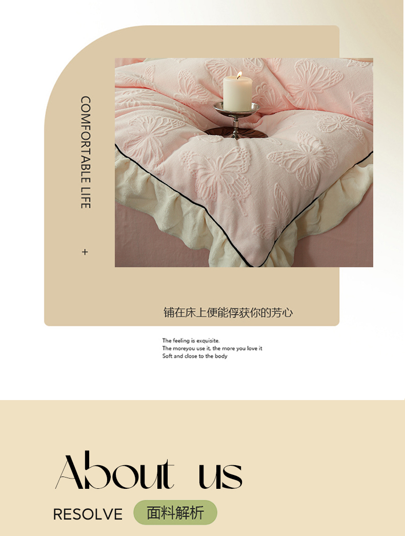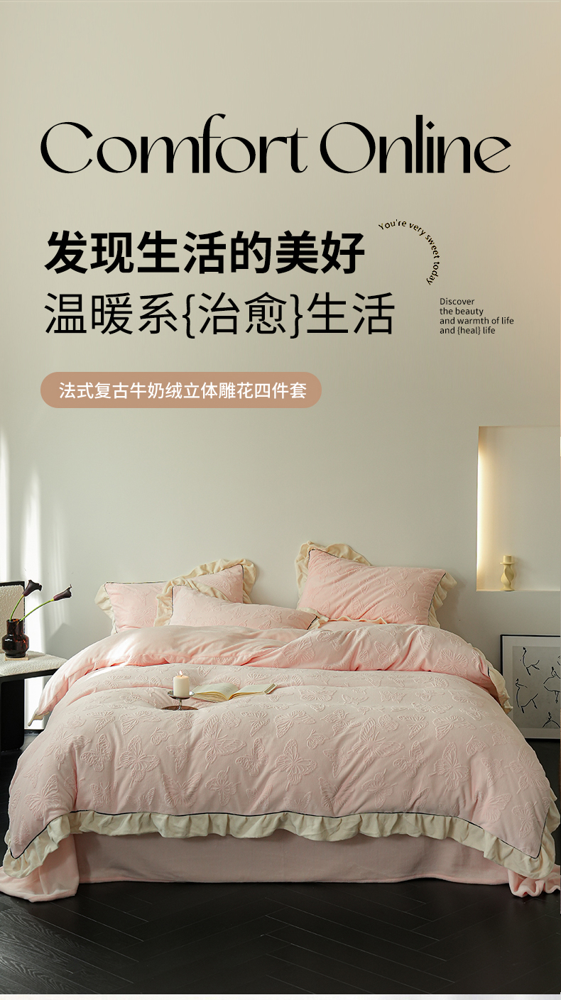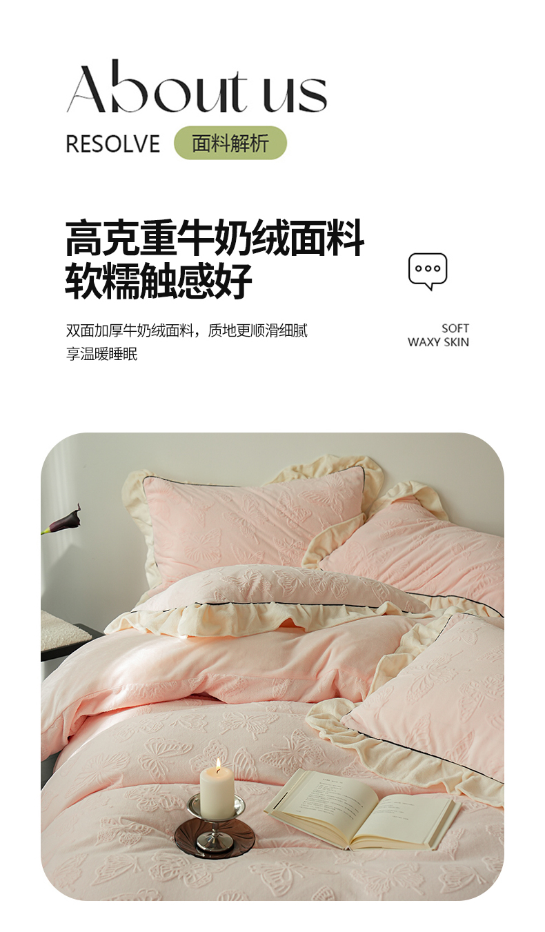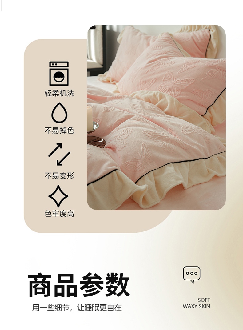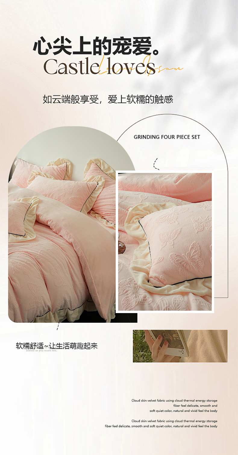 商品名称:萝莉家纺 2024新款加厚牛奶绒提花浪漫雕花绒四件套 蝴蝶飞飞浅粉