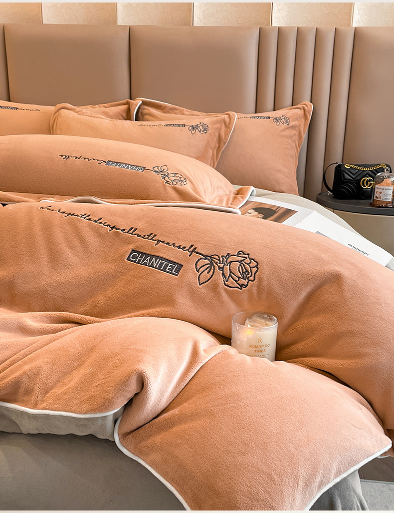 嗯呢家纺 2024新款A类高克重全消光婴儿绒刺绣双拼四件套 杏仁-蜜合灰