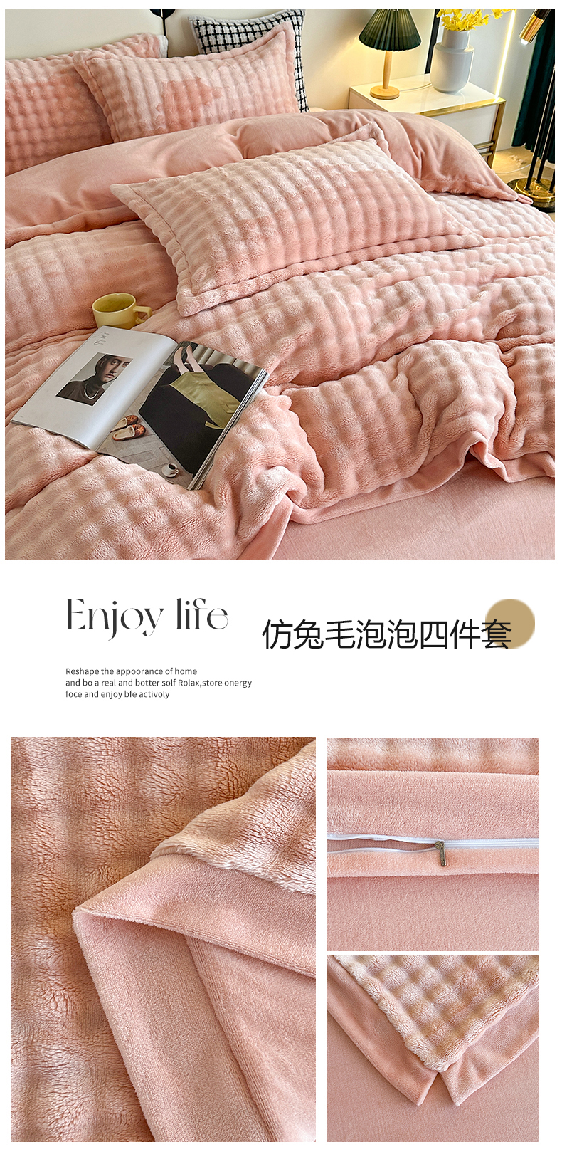 商品名称:芸锦豪 2024新款仿兔毛小泡泡兔兔绒兔毛绒四件套 樱花粉