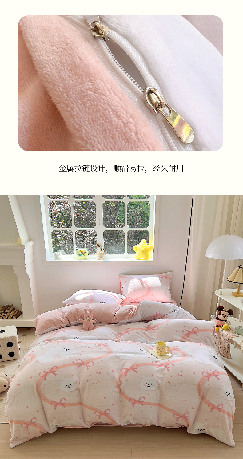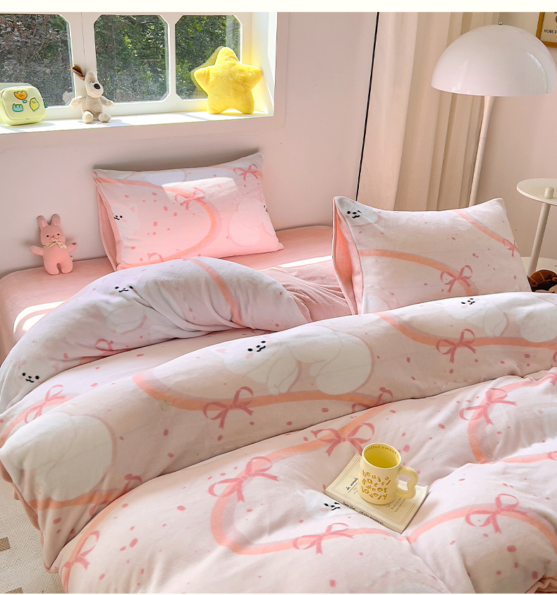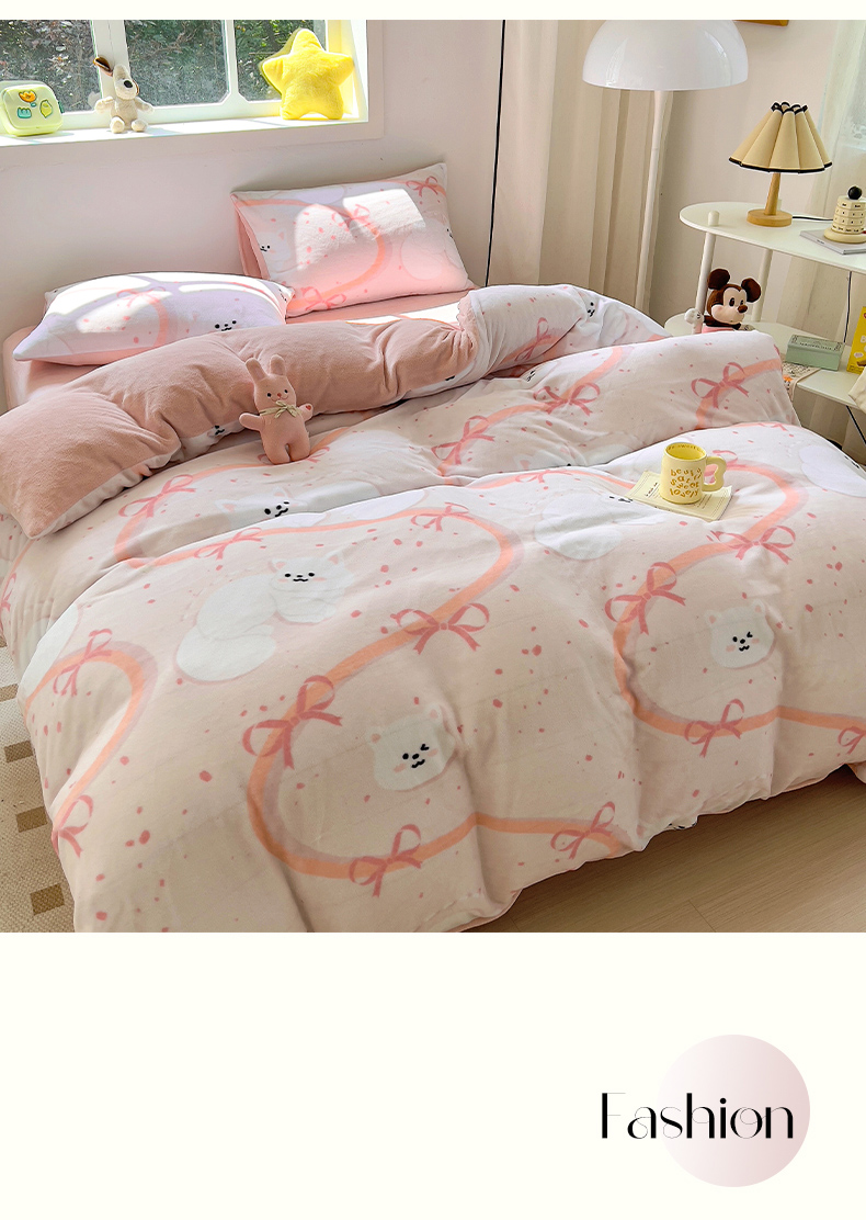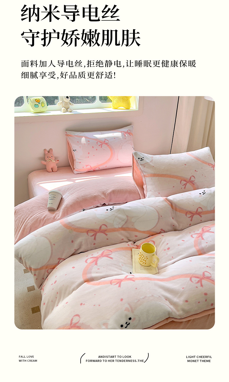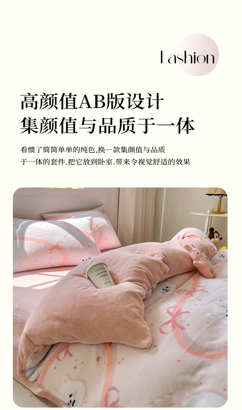 商品名称:山茶家纺 2024新款高克重印花牛奶绒四件套 粉色猫咪