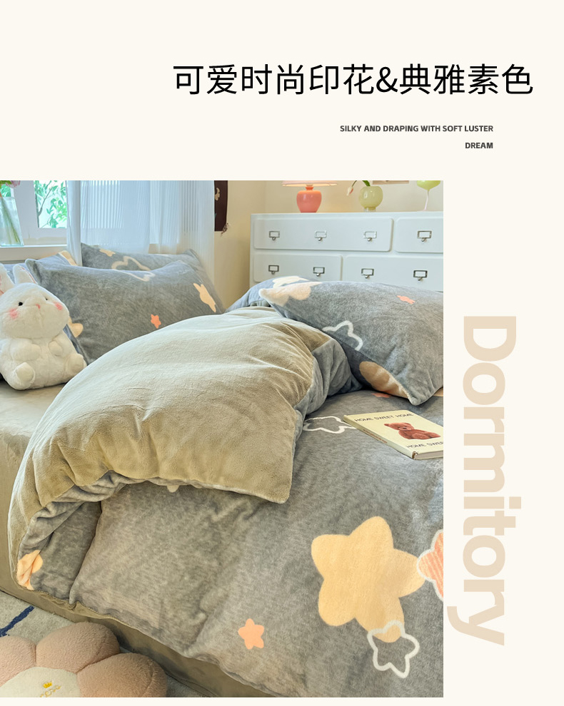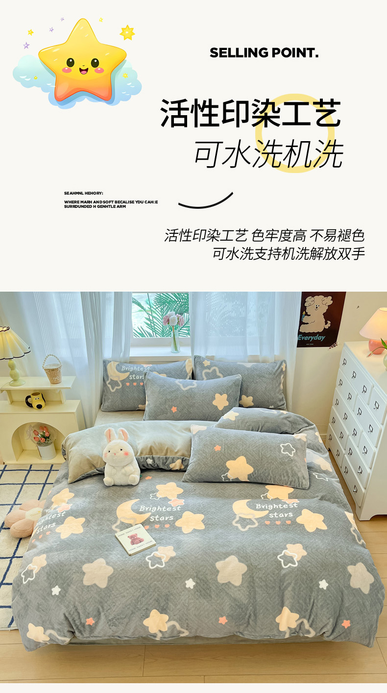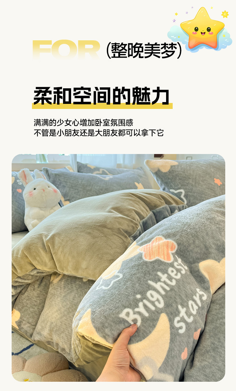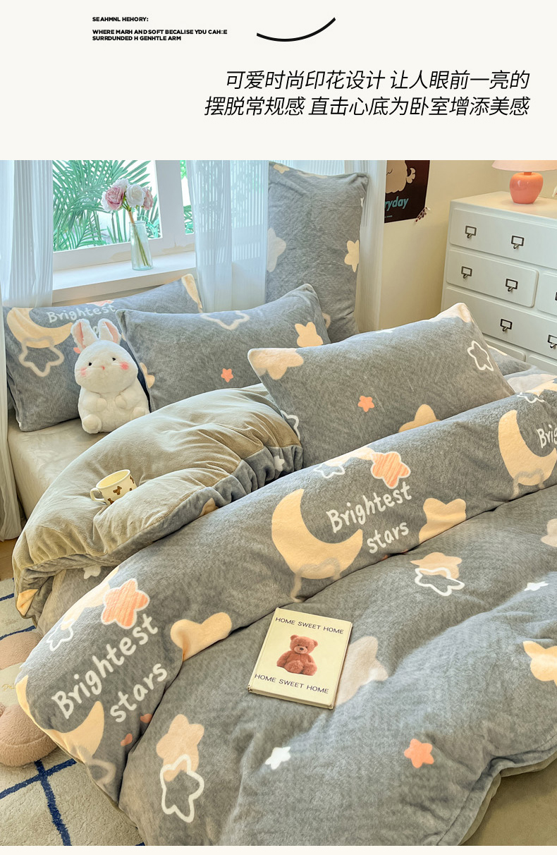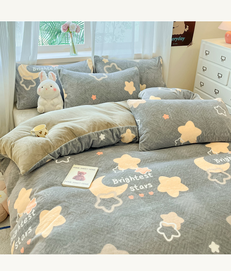 当前位置: 91家纺网 > 商品网购 > 床品套件 > 四件套 > 牛奶绒四件套 > 慕澄家纺 2024新款小清新可爱印花牛奶绒加厚保暖四件套 星星月亮