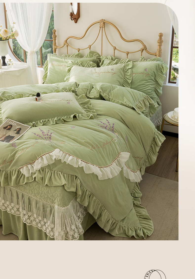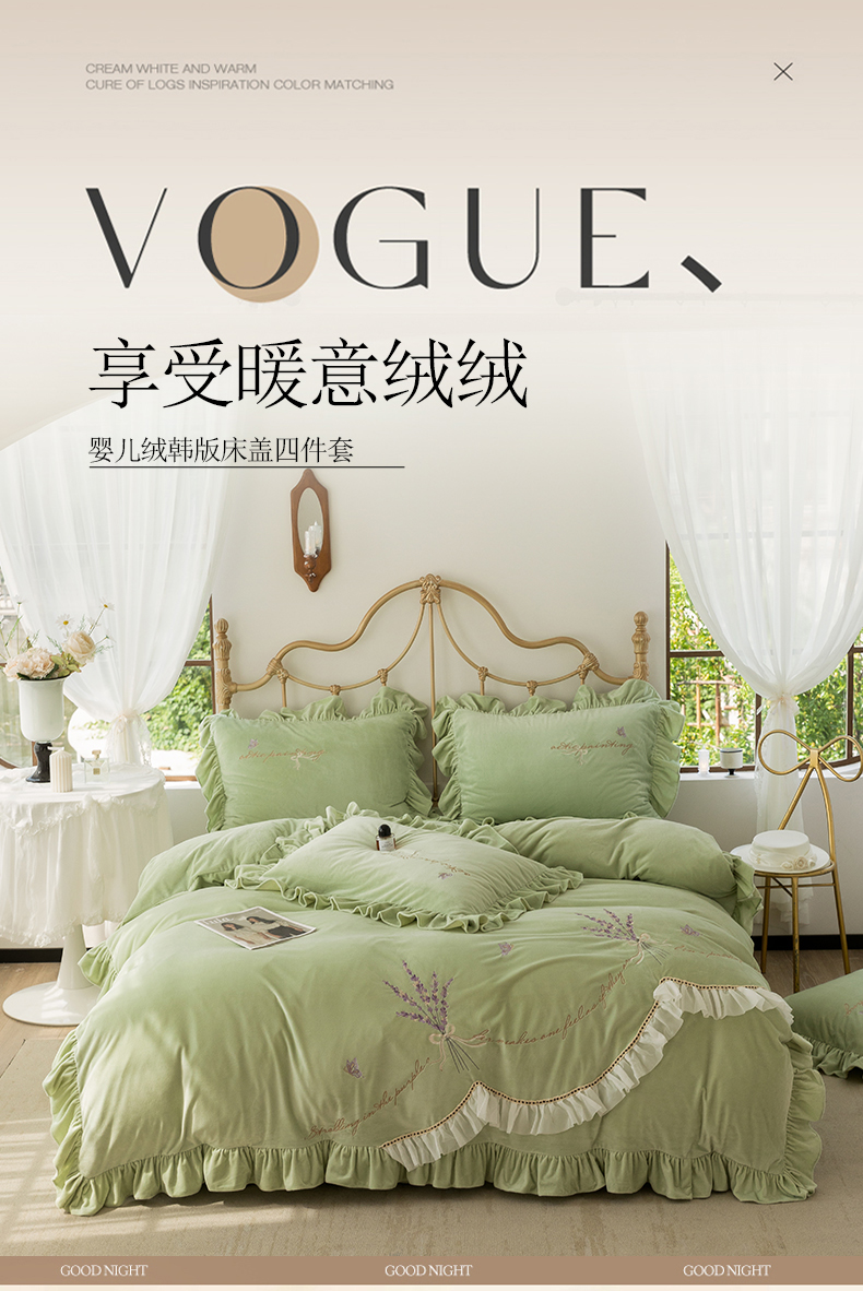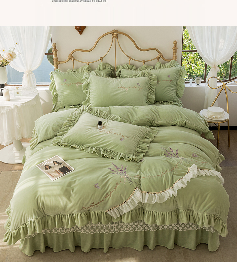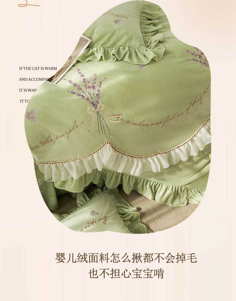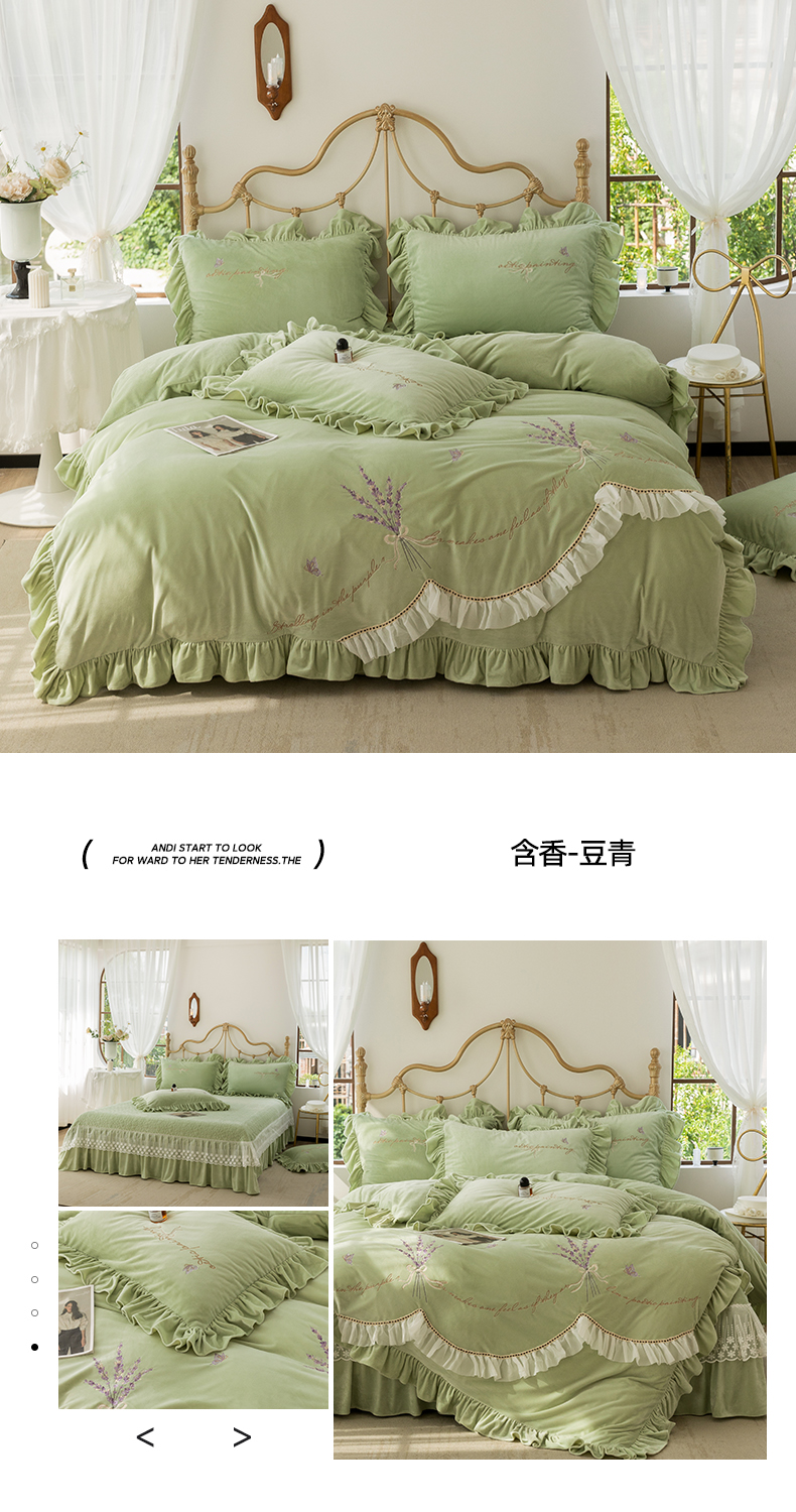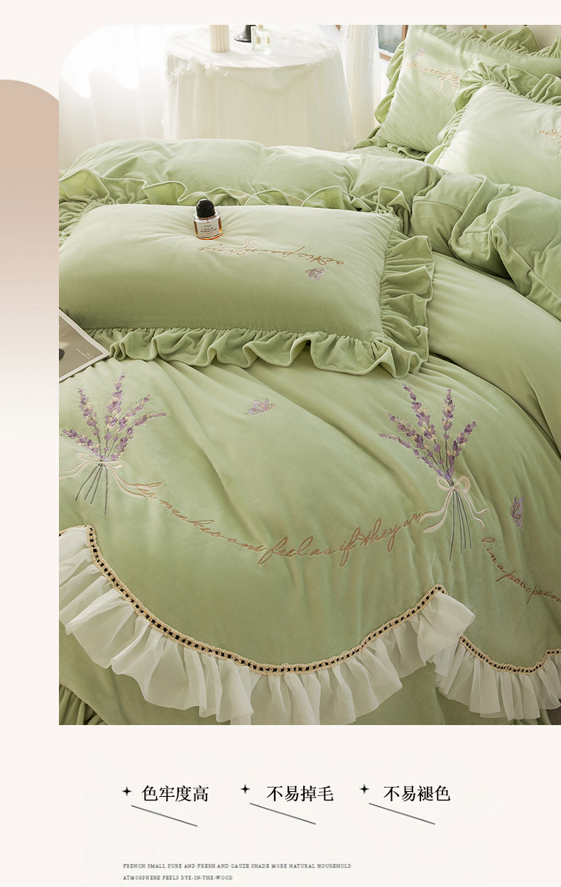 商品名称:恋尚羽家纺 2025韩版刺绣婴儿绒床盖款四件套 豆绿