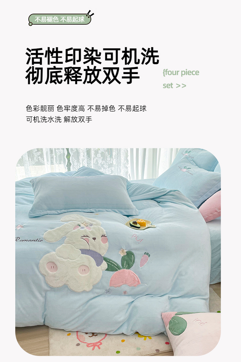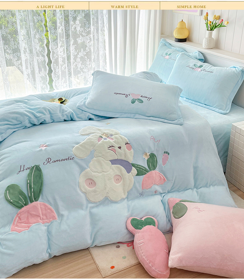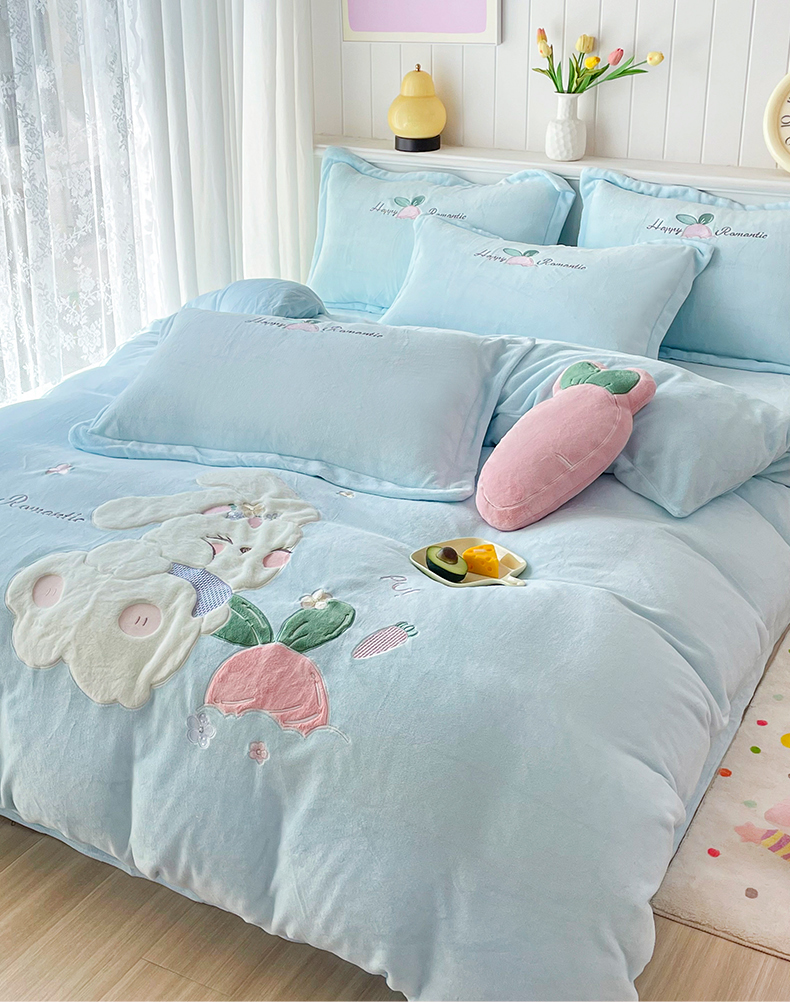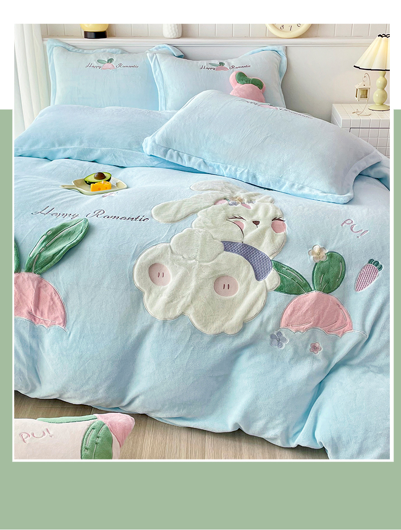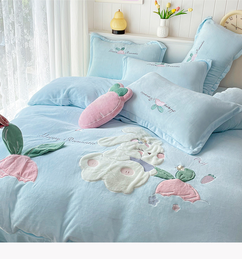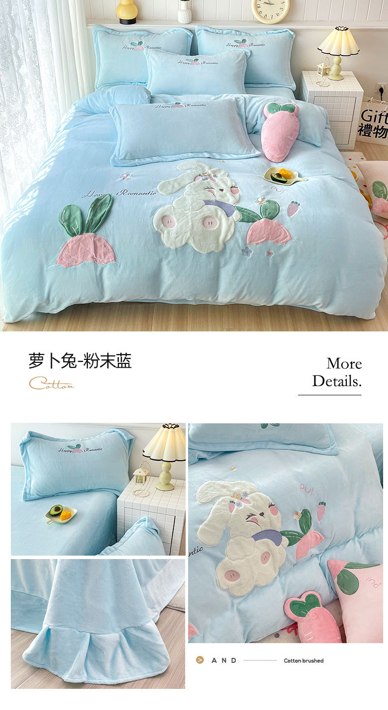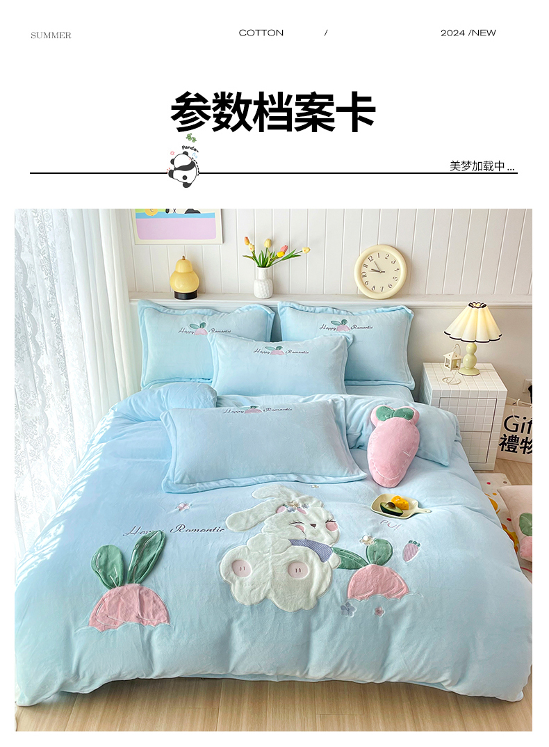 商品名称:金绣美居 2025新款牛奶绒兔毛绒贴布绣花保暖四件套-萝卜兔 粉末蓝