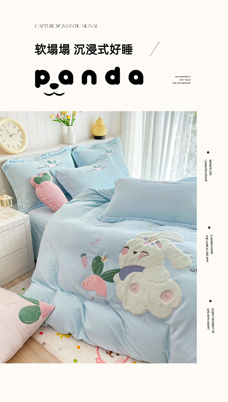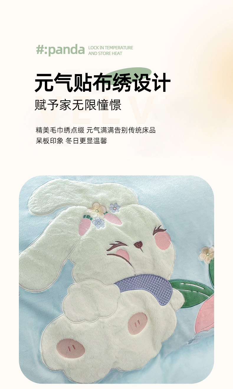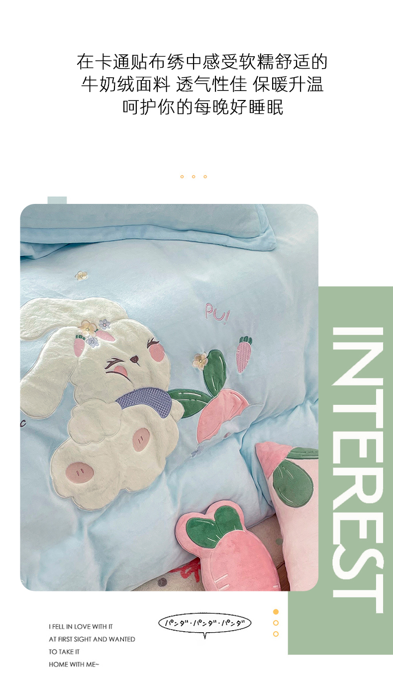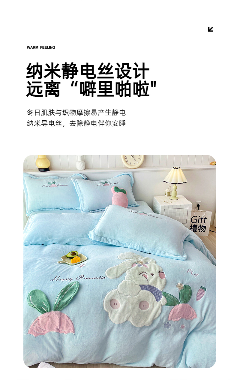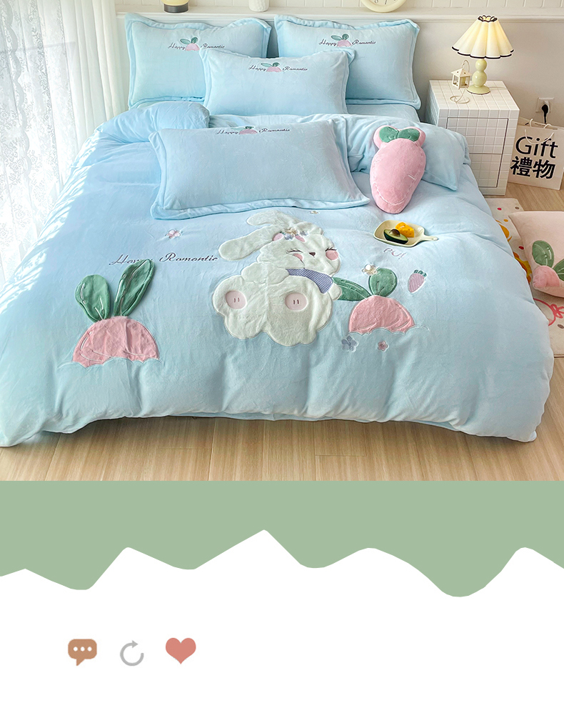 商品名称:金绣美居 2025新款牛奶绒兔毛绒贴布绣花保暖四件套-萝卜兔 粉末蓝
