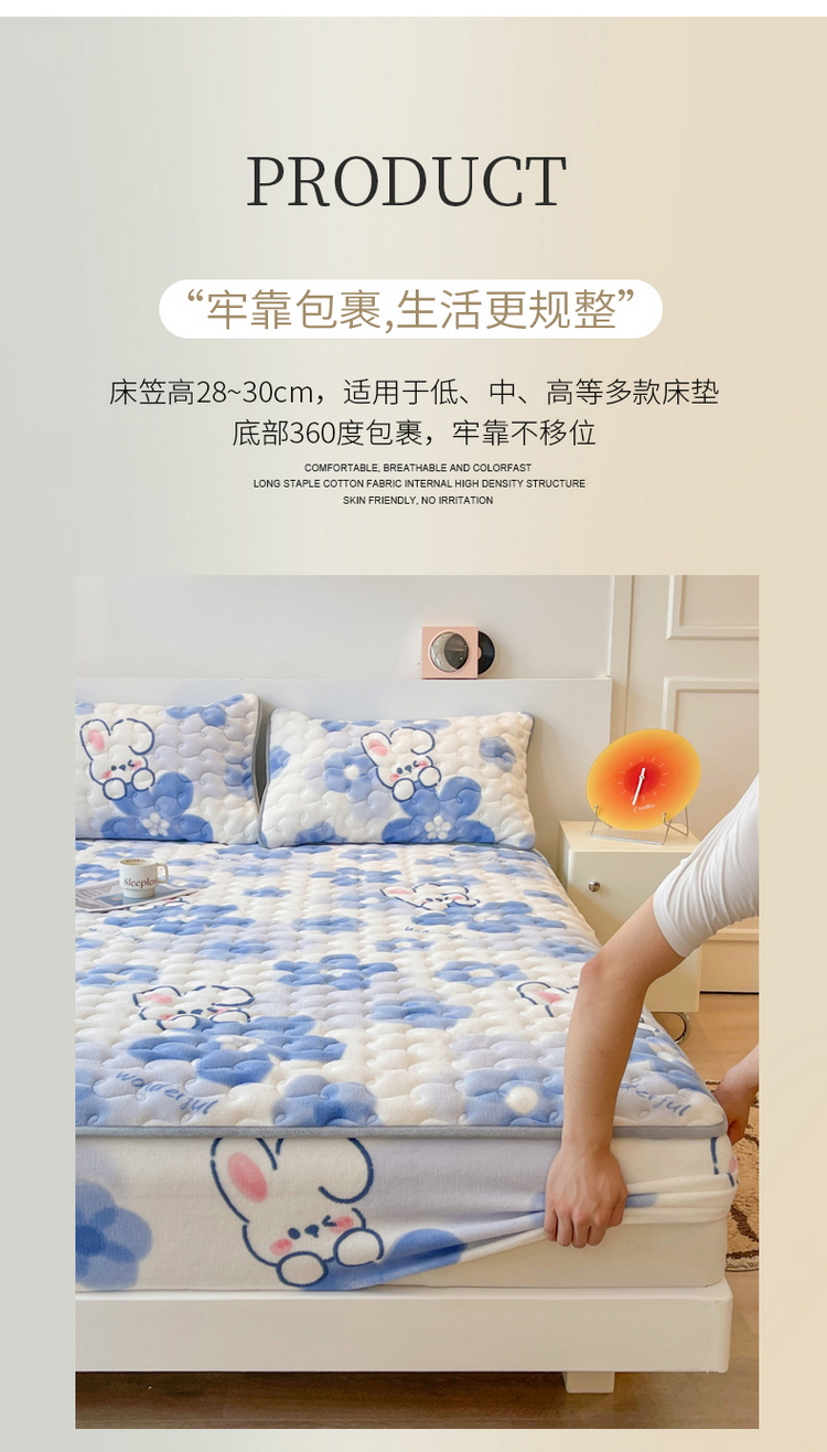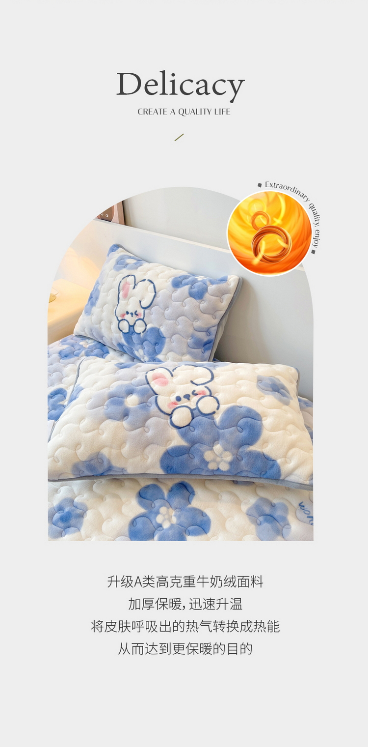 2024秋冬A类牛奶绒加厚夹棉床笠+牛奶绒被套四件套蓓蕾兔-兰